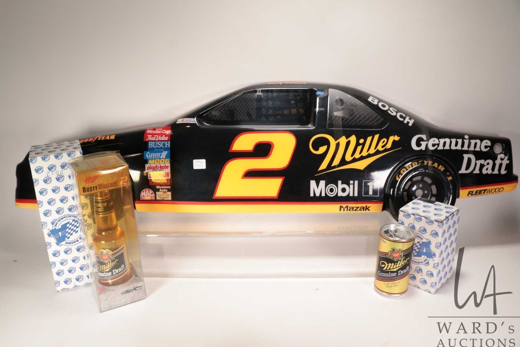 Three Rusty Wallace 1: 64th scale collectibles including Miller Genuine Draft car in bottle, plus car in beer can, and a 3d plastic sign, 12" in height X 44" long