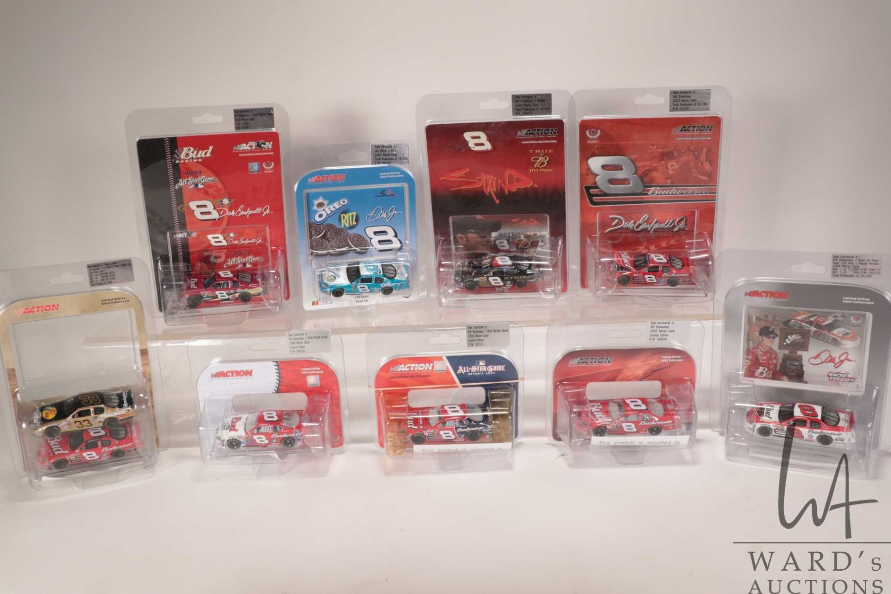 Nine Dale Earnhardt Jr. limited edtiion Action 1: 64 scale die cast cars, various themes including Oreo, 2002 All-Star Baseball game and Budweiser
