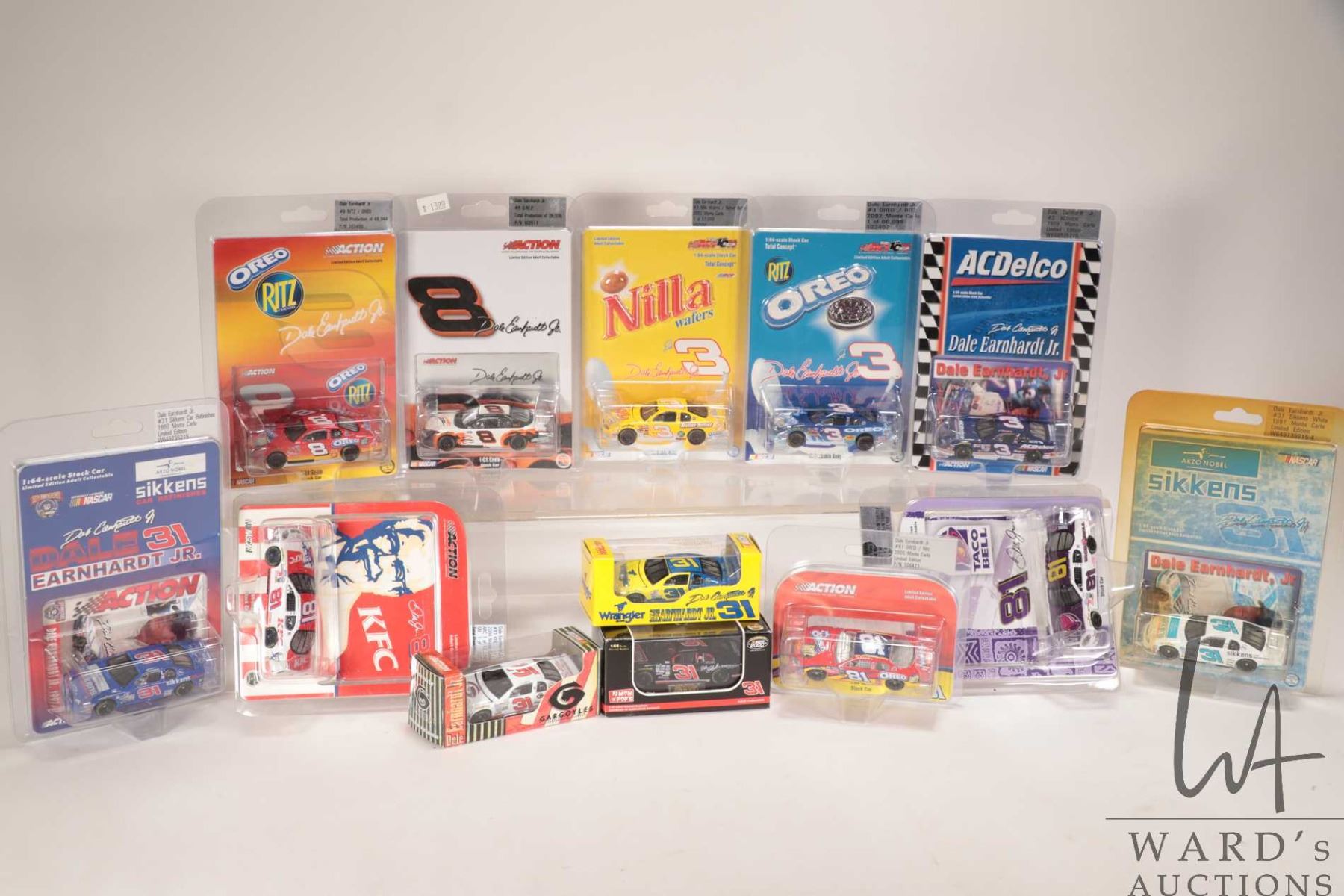 Thirteen limited edition 1:64th scale Action collectible Dale Earnhardt Jr. die cast cars including Oreo, AC Delco, Sikkens, Nutter Butter, Wrangler etc.