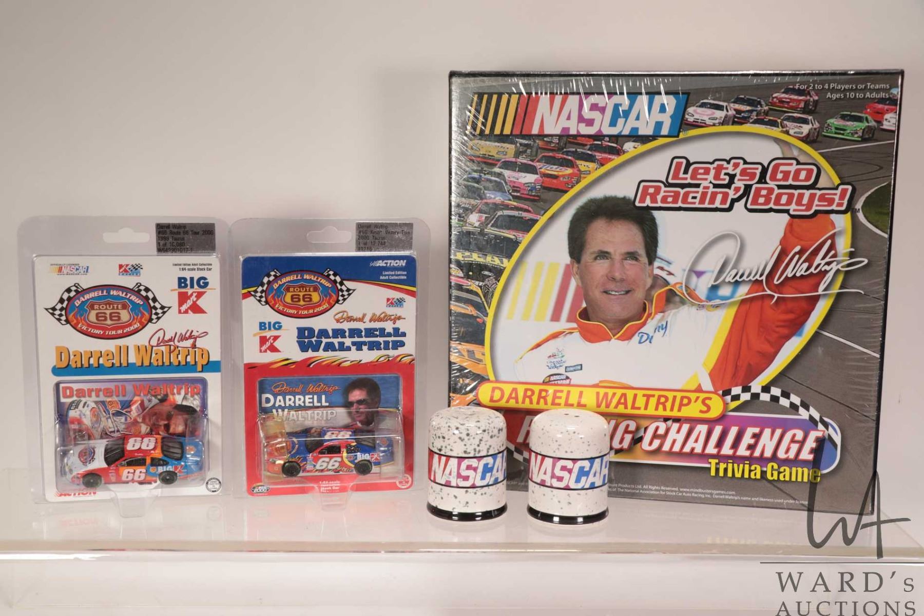 Selection of Darrell Waltrip's collectibles including Racing Challenge trivia game, two 1:64 scale Route 66 die cast cars with trading cards and a set of Nascar salt and pepper shakers