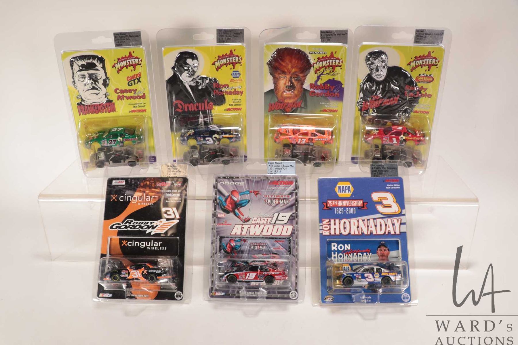 Seven assorted limited edition Action 1: 64 scale Action collectible cars including four Monster themed, a Spiderman, Cingular Wirelessand a Napa 75th anniversary