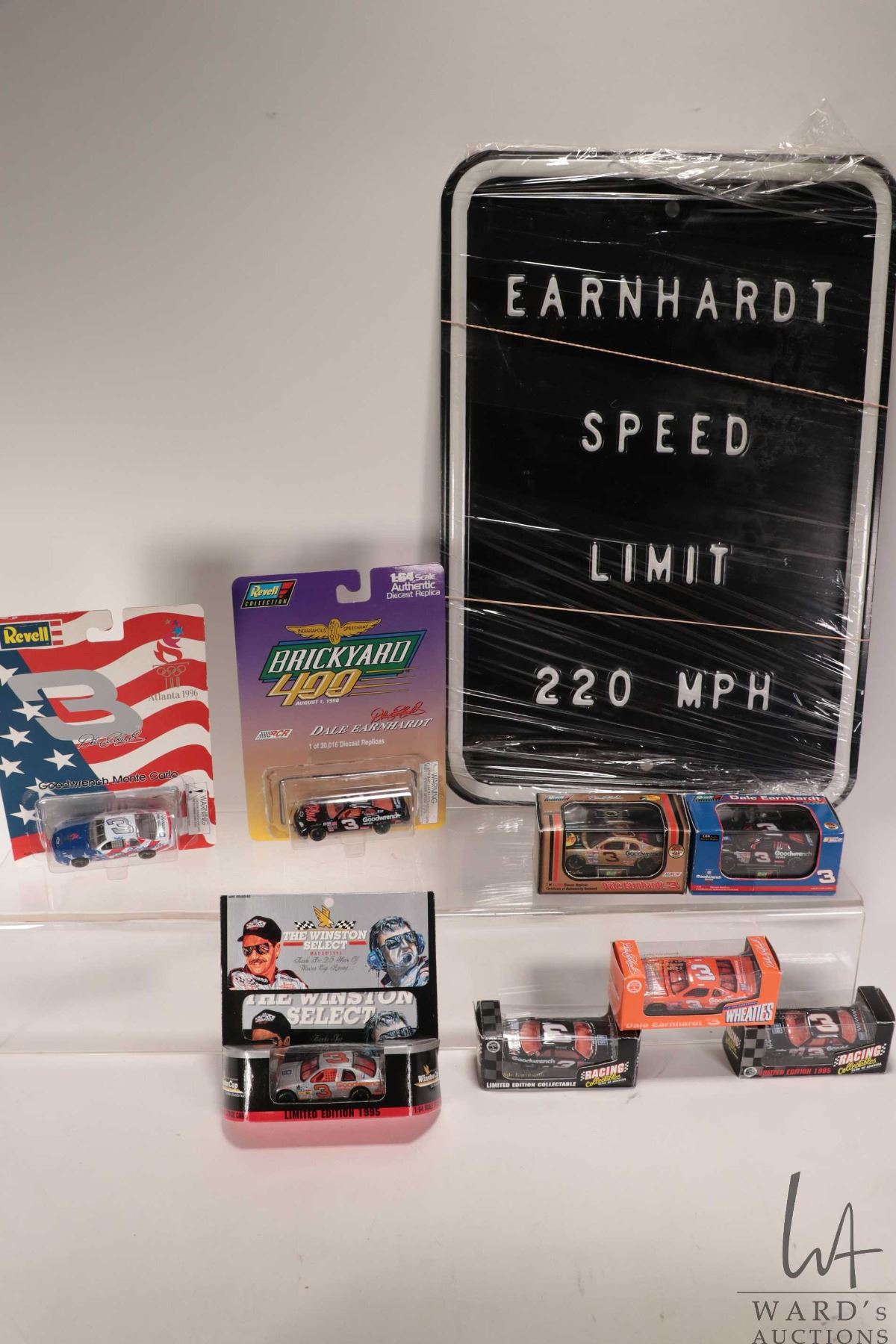 Eight 1:64 scale collectible Dale Earnhardt collectible die cast cars and a metal Earnhardt Speed Limit sign 18" X 12"