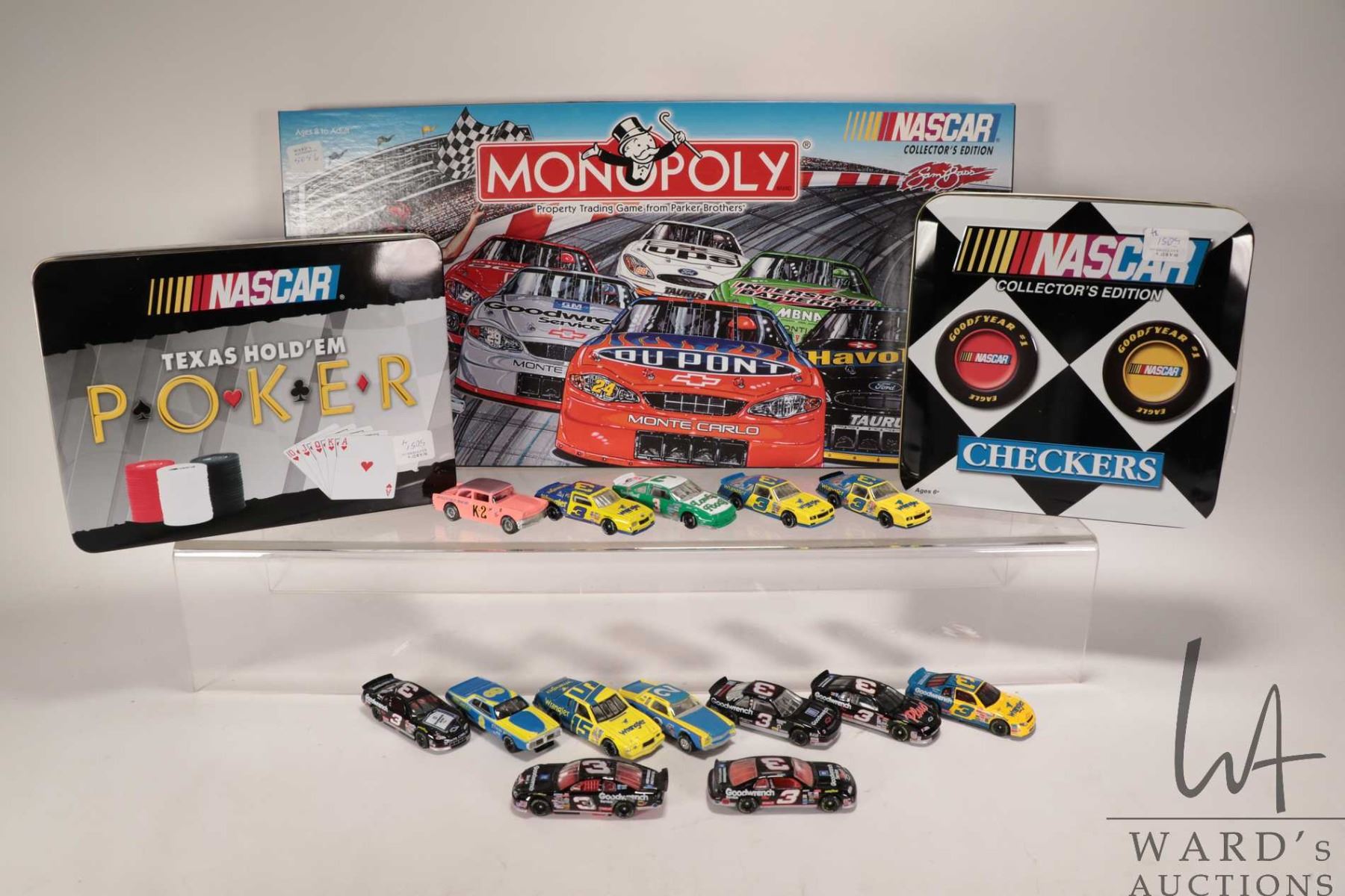 Selection of Nascar collectibles including Nascar Collector's Edition Monopoly, Texas Hold' Em poker, checkers and fourteen 1: 64 scale die cast collectible cars