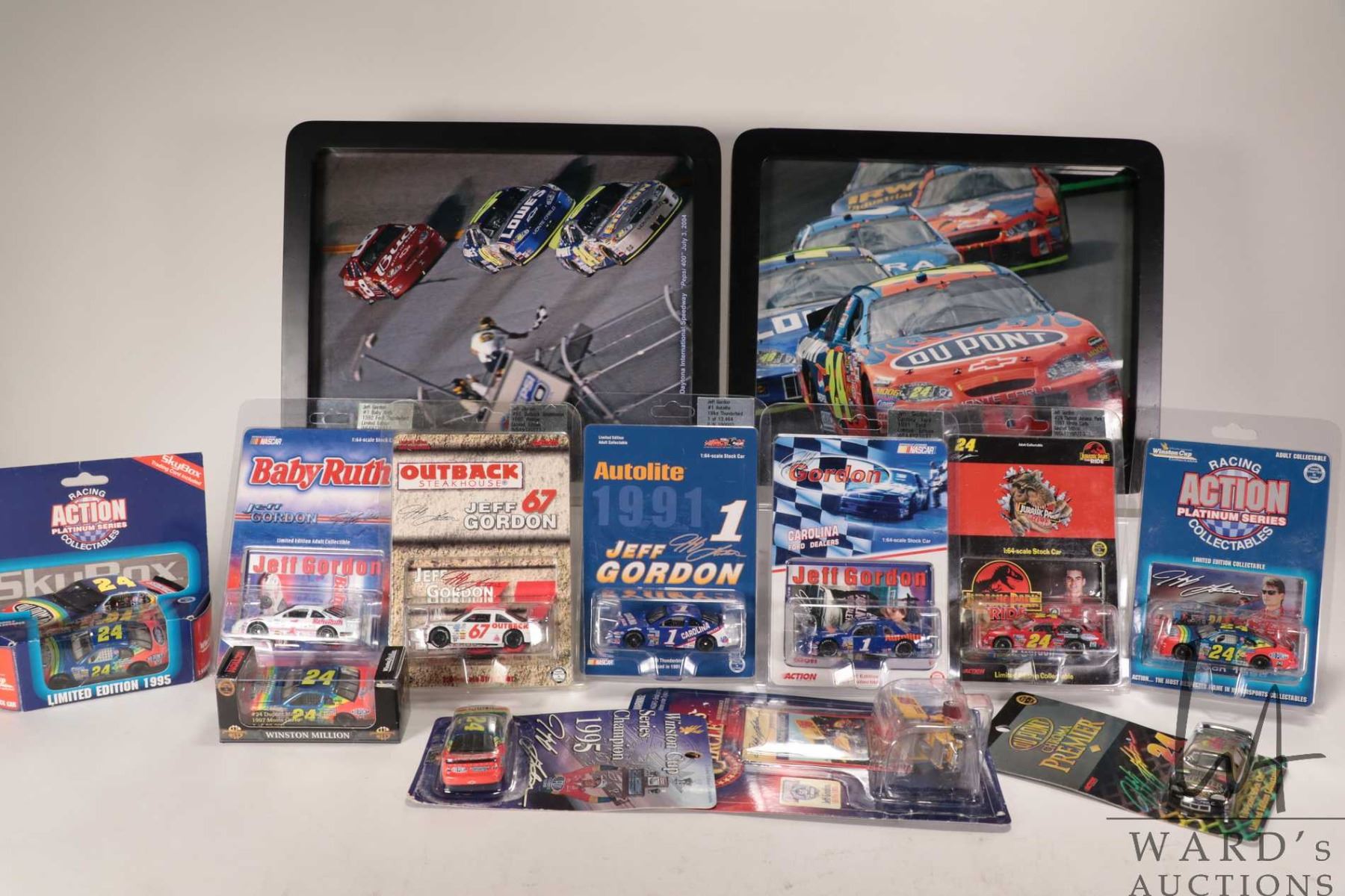 Eleven 1: 64 scale die cast collectible Jeff Gordon race cars 2004-2006 and two framed photographic prints