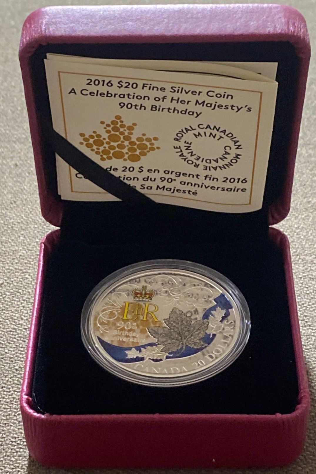 Lot 95 2016 $20 Her Majesty's 90th Birthday Fine Silver Coin 31.39 Grams