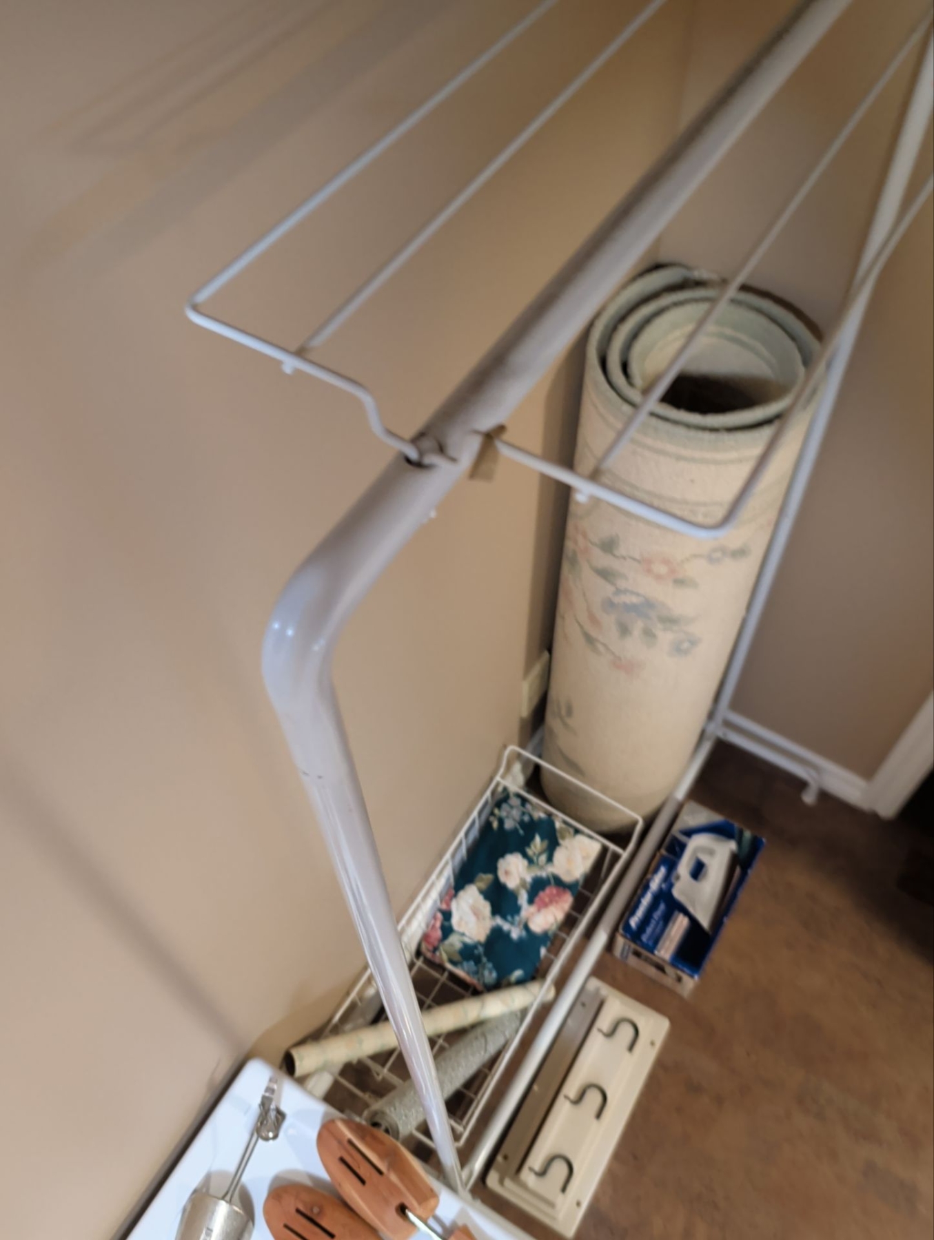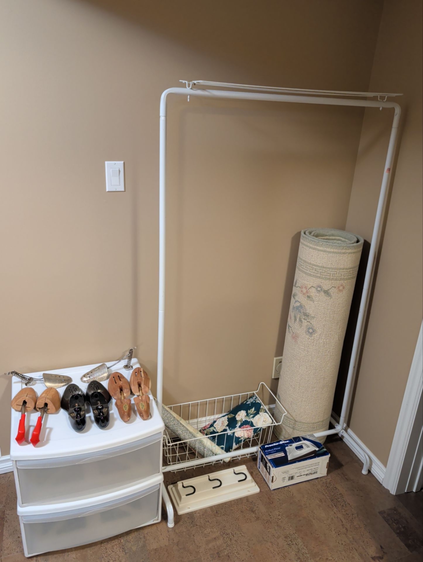 Lot 132 Laundry Room Must Haves - Garment Rack Stackable Organizers Shoe Forms Iron Rug & More