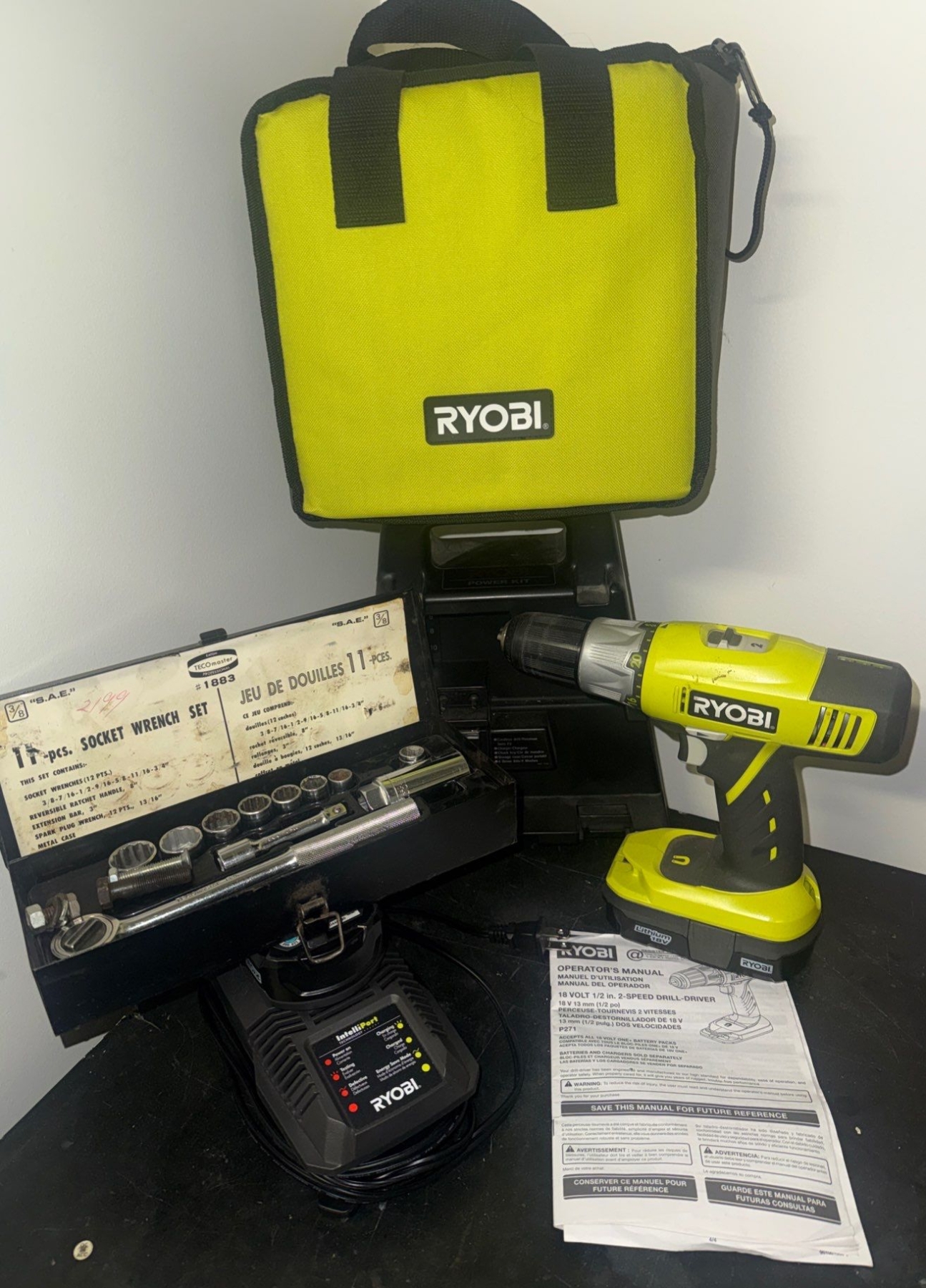 Lot 169 RYOBI 18V Driver/Drill w/ Travel Bag RYOBI Power Kit 11 Piece Wrench Set & more