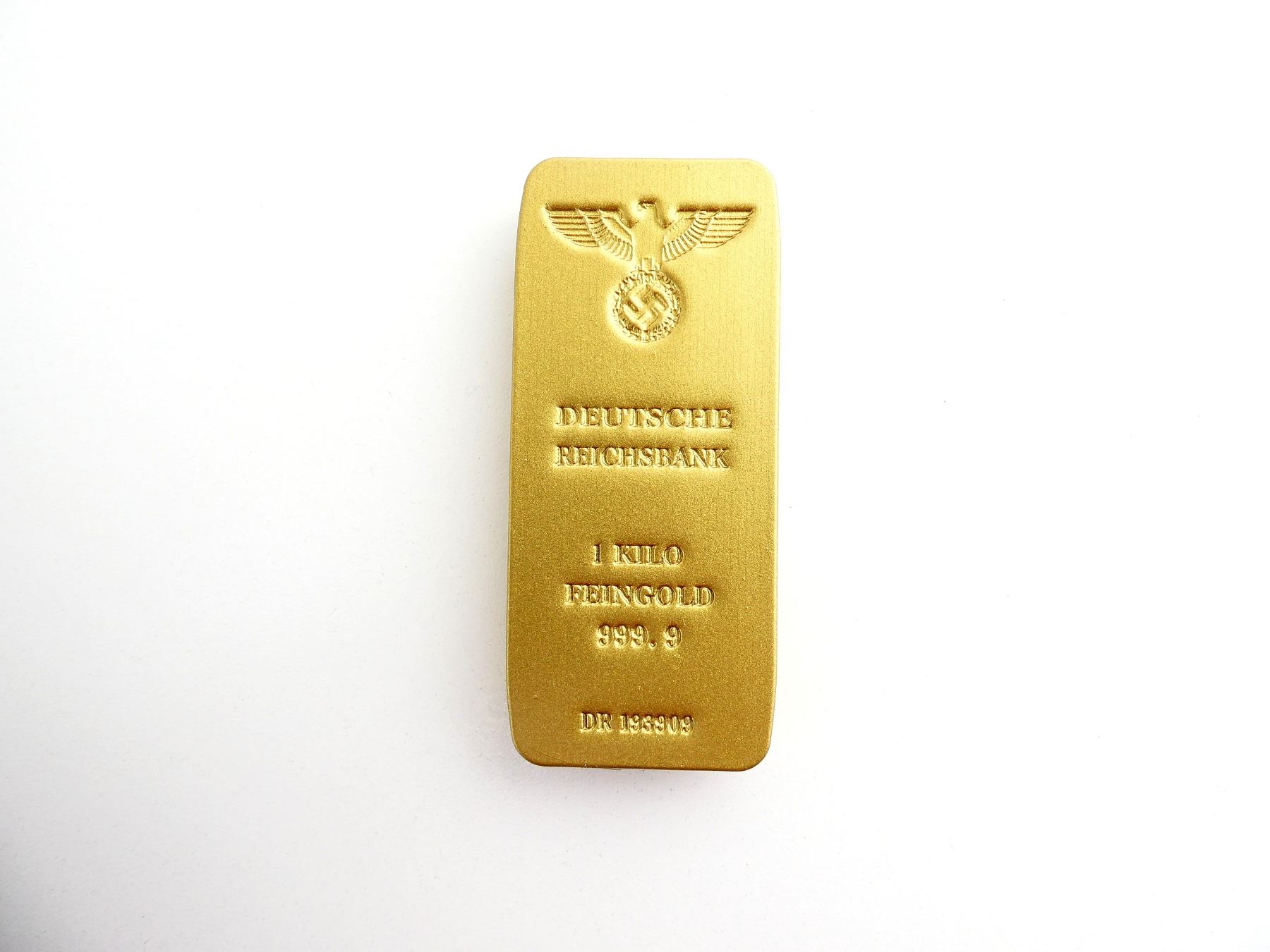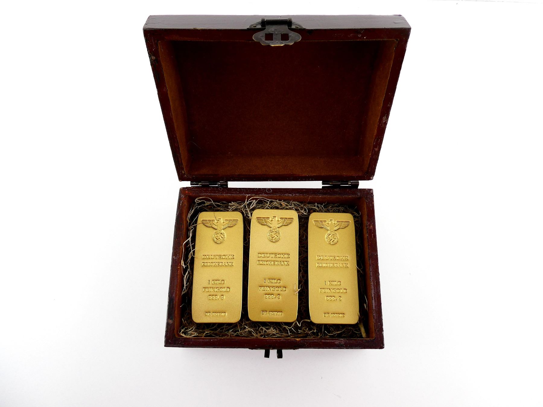 LOT INCLUDES; (3) REPRODUCTION GOLD PAINTED GOLD BARS, POSSIBLY WOOD / RESIN CONSTRUCTION, MARKED: "DEUTSCHE, REICHSBANK, 1 KILO, FEINGOLD, 999.9, DR 193909" WITH EAGLE HOLDING SWASTIKA SYMBOL, APPROX. 4" X 1.75" & (1) BROWN PAINTED WOODEN BOX, APPROX. 7" X 5.5" X 3 7/8". SEE PHOTOS.