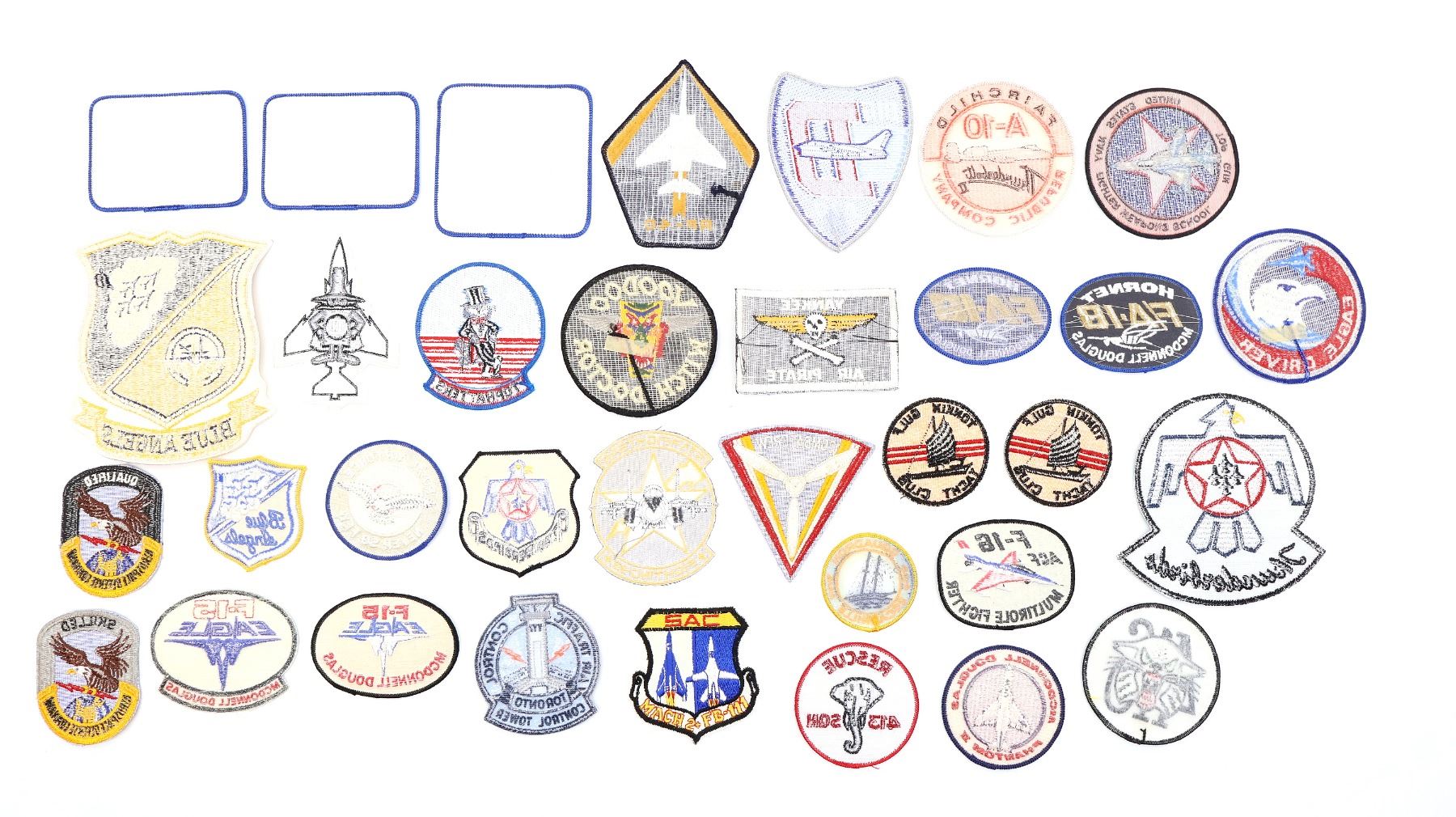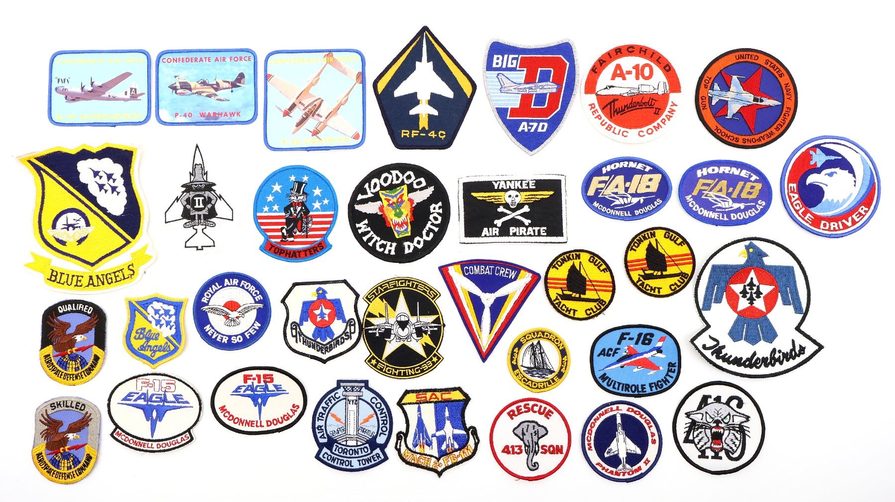 APPROX. (34) PIECES, VARIOUS SIZES / STYLES / COLOURS, MOSTLY U.S. MILITARY, INCLUDES; AIR TRAFFIC CONTROL TORONTO CONTROL TOWER, RAF NEVER SO FEW, BLUE ANGELS, THUNDERBIRDS, COMBAT CREW, MCDONNELL DOUGLAS PHANTOM II, RF-4C, FAIRCHILD A-10 THUNDERBOLT II REPUBLIC COMPANY, TOPHATTERS, VOODOO WITCH DOCTOR, ETC.