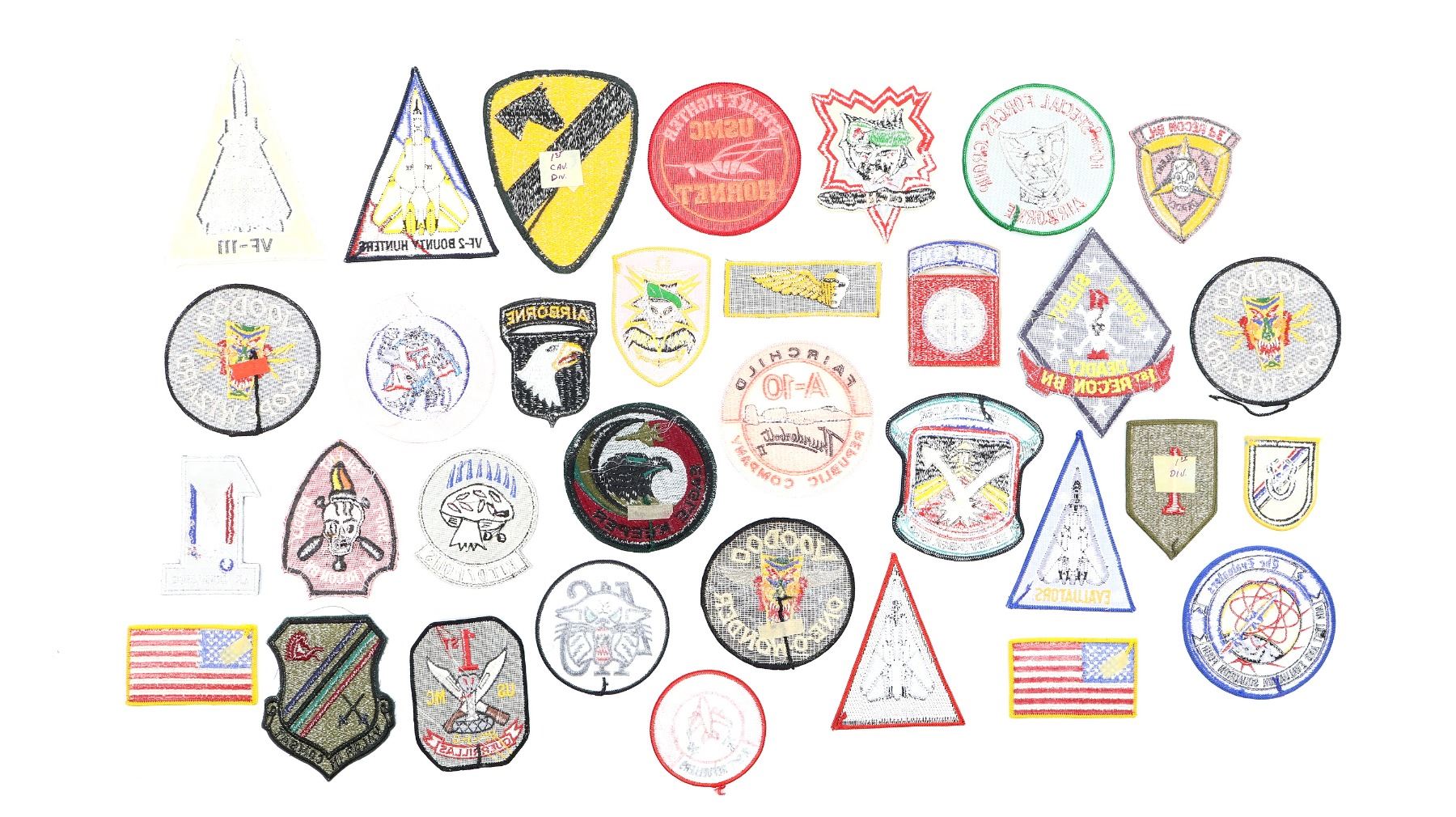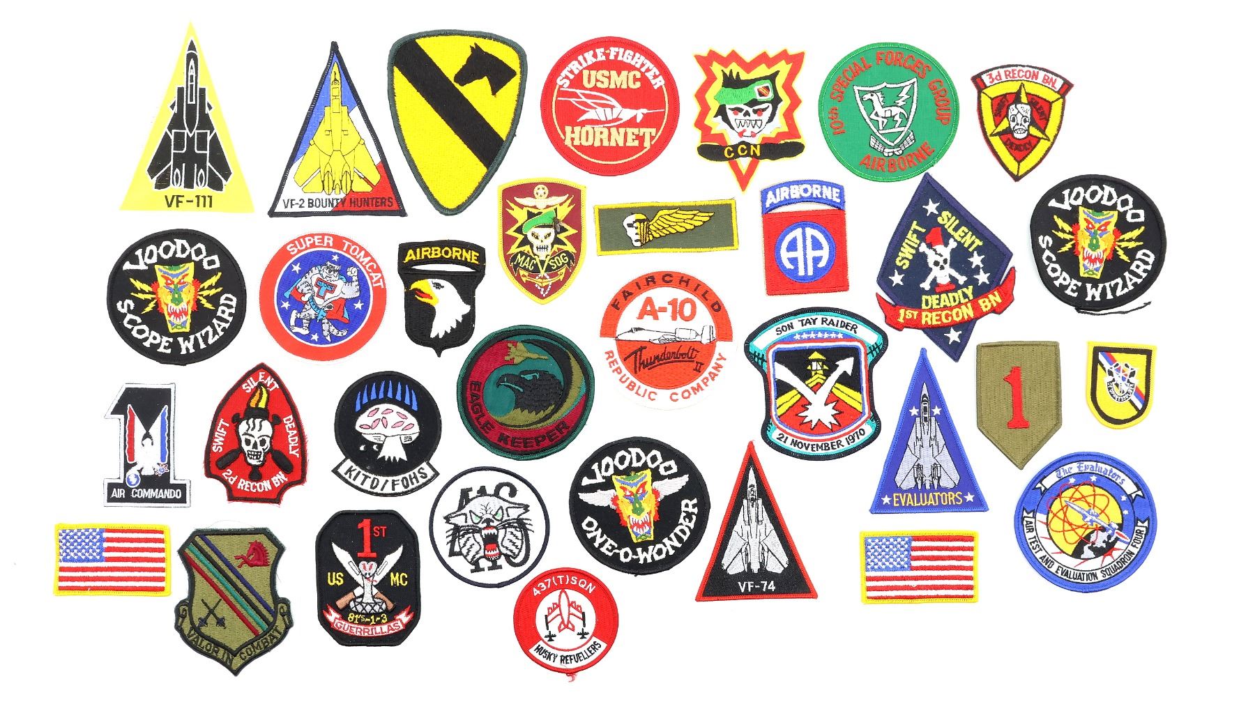 APPROX. (33) PIECES, VARIOUS SIZES / STYLES / COLOURS, SOME ORIGINAL, SOME REPRODUCTION, INCLUDES; 101ST AIRBORNE DIVISION, 82ND AIRBORNE DIVISION, REPRODUCTION VIETNAM WAR SON TAY RAIDER KITD/FOHS BADGE, REPRODUCTION U.S.M.C. VIETNAM RECON WINGS, VOODOO SCOPE WIZARD, SUPER TOMCAT, STRIKE-FIGHTER USMC HORNET, POSSIBLY REPRODUCTION 2ND RECON BATTALION, 10TH SPECIAL FORCES GROUP AIRBORNE, 1ST CAVALRY DIVISION, ETC.