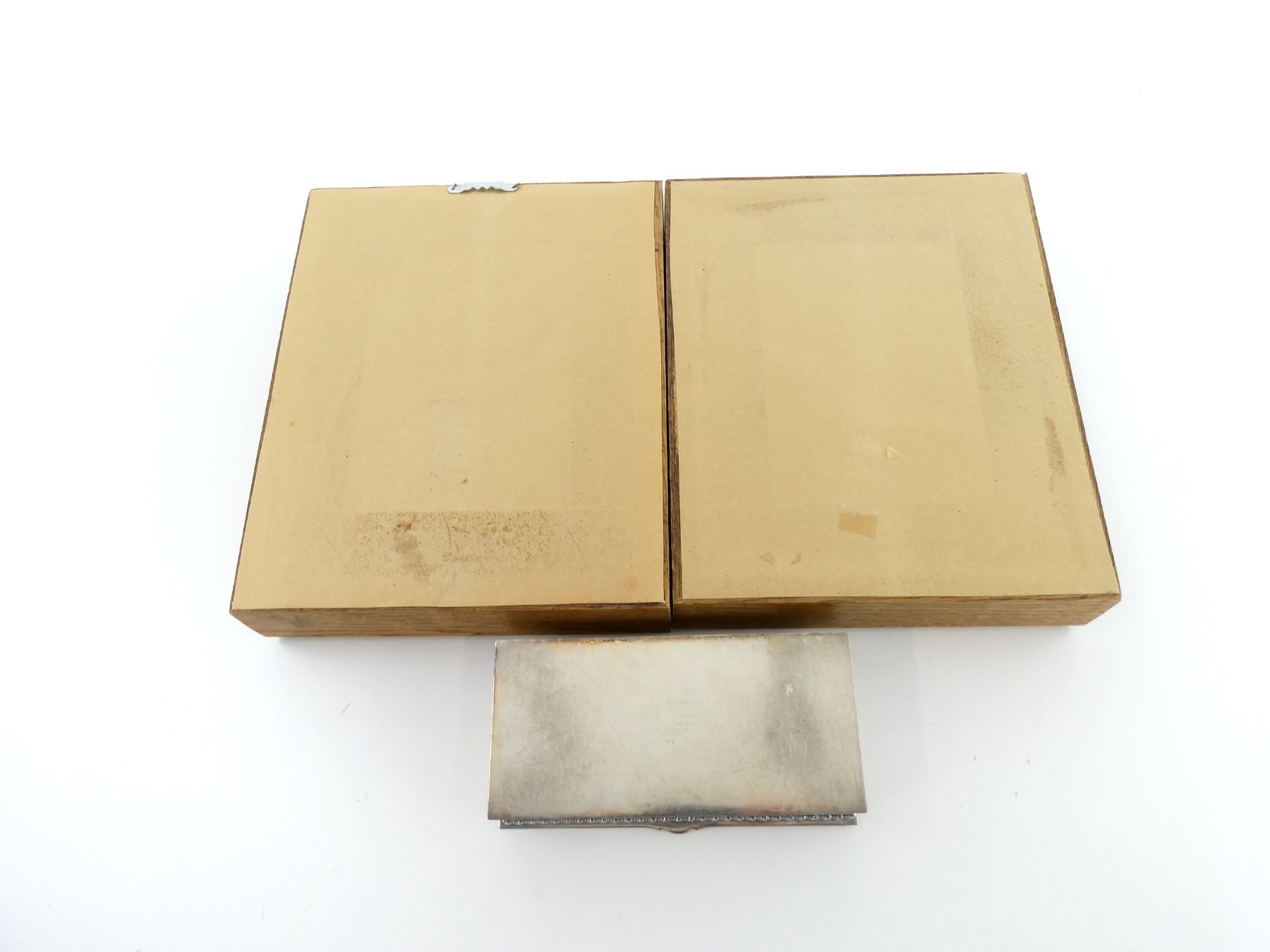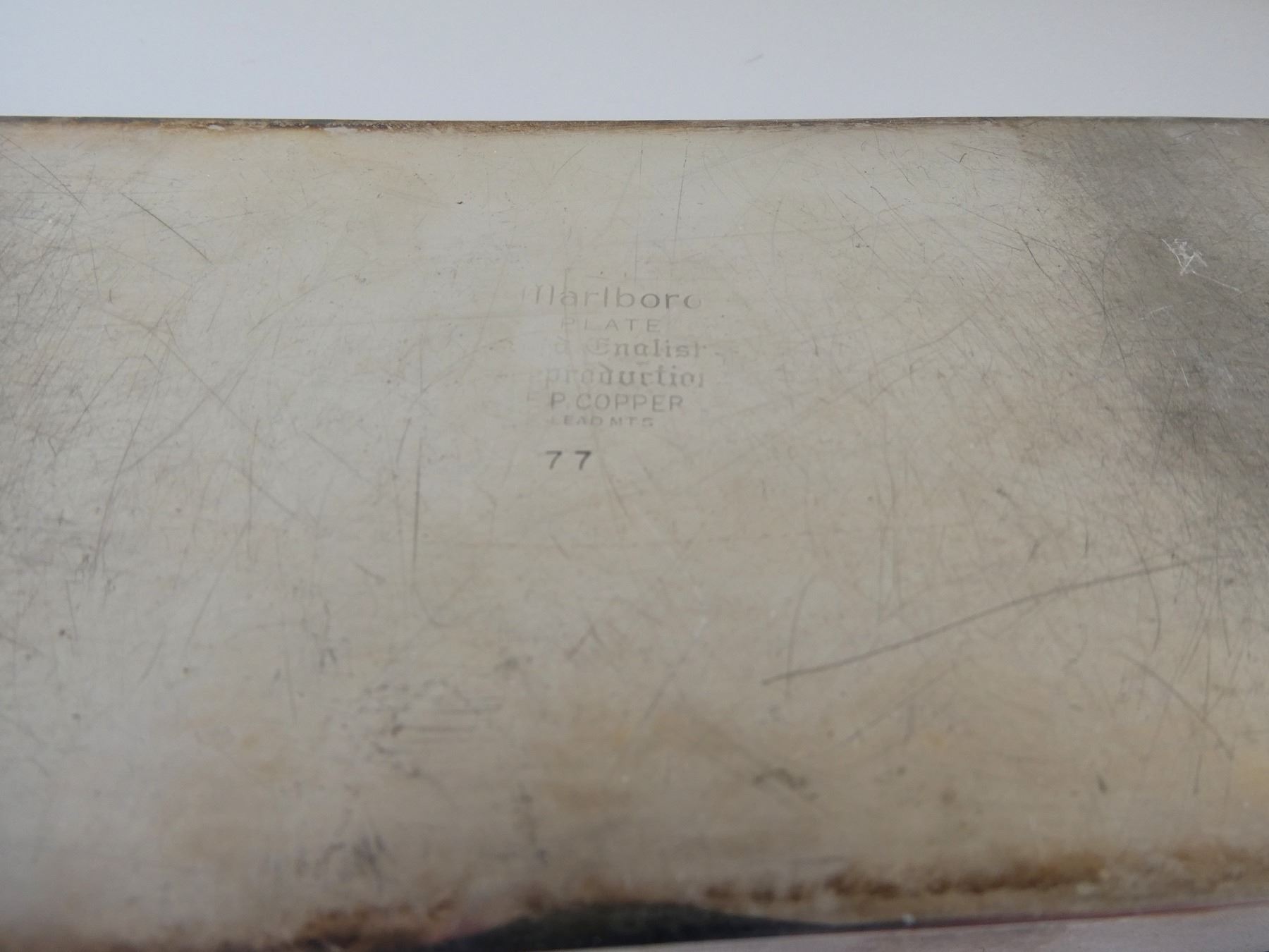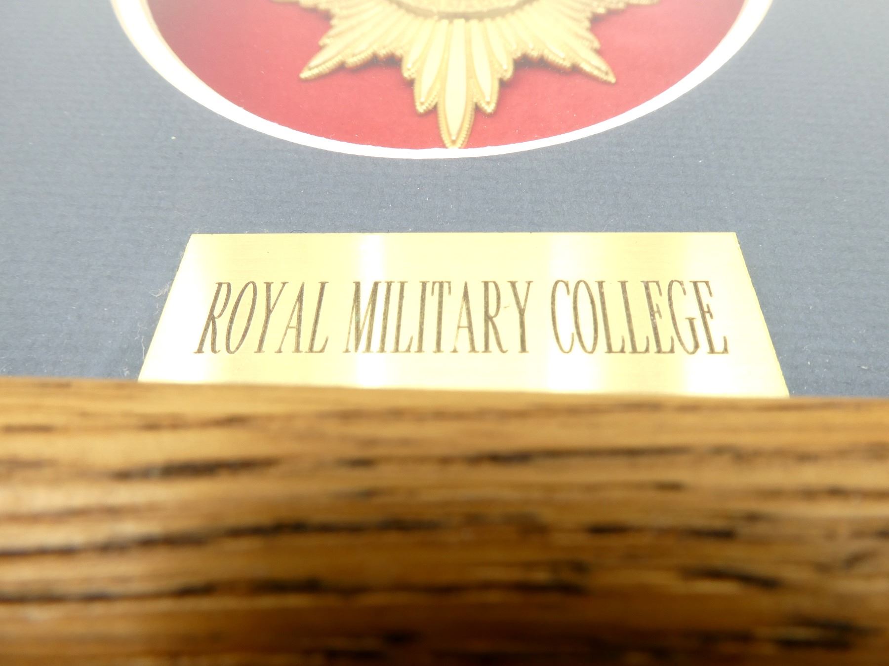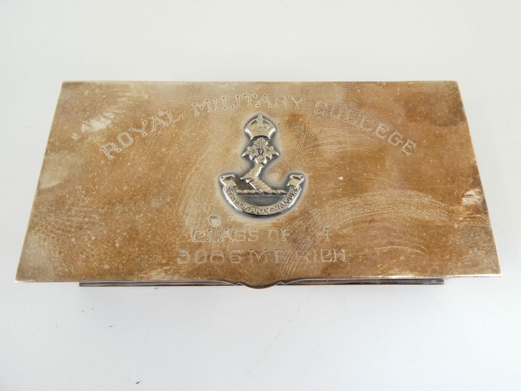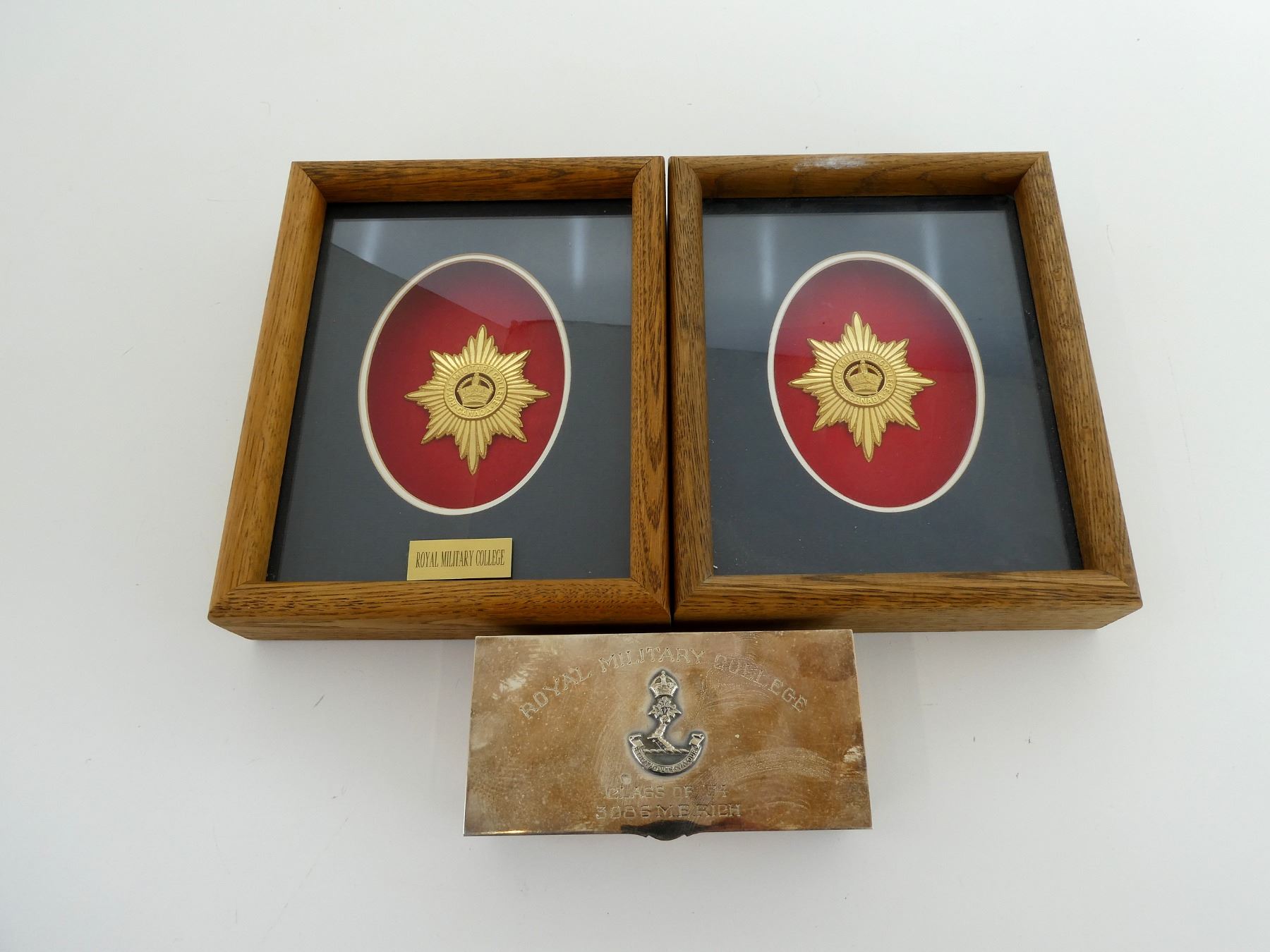 LOT INCLUDES; (2) WOODEN SHADOW BOXES WITH CANADIAN ROYAL MILITARY COLLEGE BADGES INSIDE, KING'S CROWNS, GOLD COLOURED, UNDER GLASS, APPROX. 8 5/8" X 10 5/8" X 2 1/8" & (1) SILVER / NICKEL PLATED STORAGE BOX, TOP ENGRAVED: "ROYAL MILITARY COLLEGE, CLASS OF '54, 3086 M.E. RICH" WITH ROYAL MILITARY COLLEGE OF CANADA BADGE, BOTTOM MARKED: "MARLBORO, PLATE, ???? ENALIST, REPRODUCTION, E.P.COPPER, LEAD MTS, 77", WOODEN INSERT INSIDE WITH MIDDLE DIVIDER, BOX APPROX. 7" X 3 5/8" X 1 5/8". SEE PHOTOS. *NO GUARANTEE ON GLASS FOR SHIPPING*