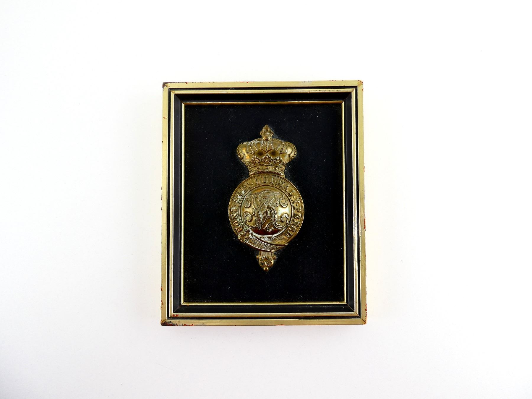 (1) BRASS MOUNTED INFANTRY OFFICER'S HORSE MARTINGALE OR HELMET PLATE, VICTORIAN CROWN WITH VR CYPHER IN THE CENTER, FRAMED IN WOODEN FRAME, NO GLASS, APPROX. 6.25" X 5.25". SEE PHOTOS.