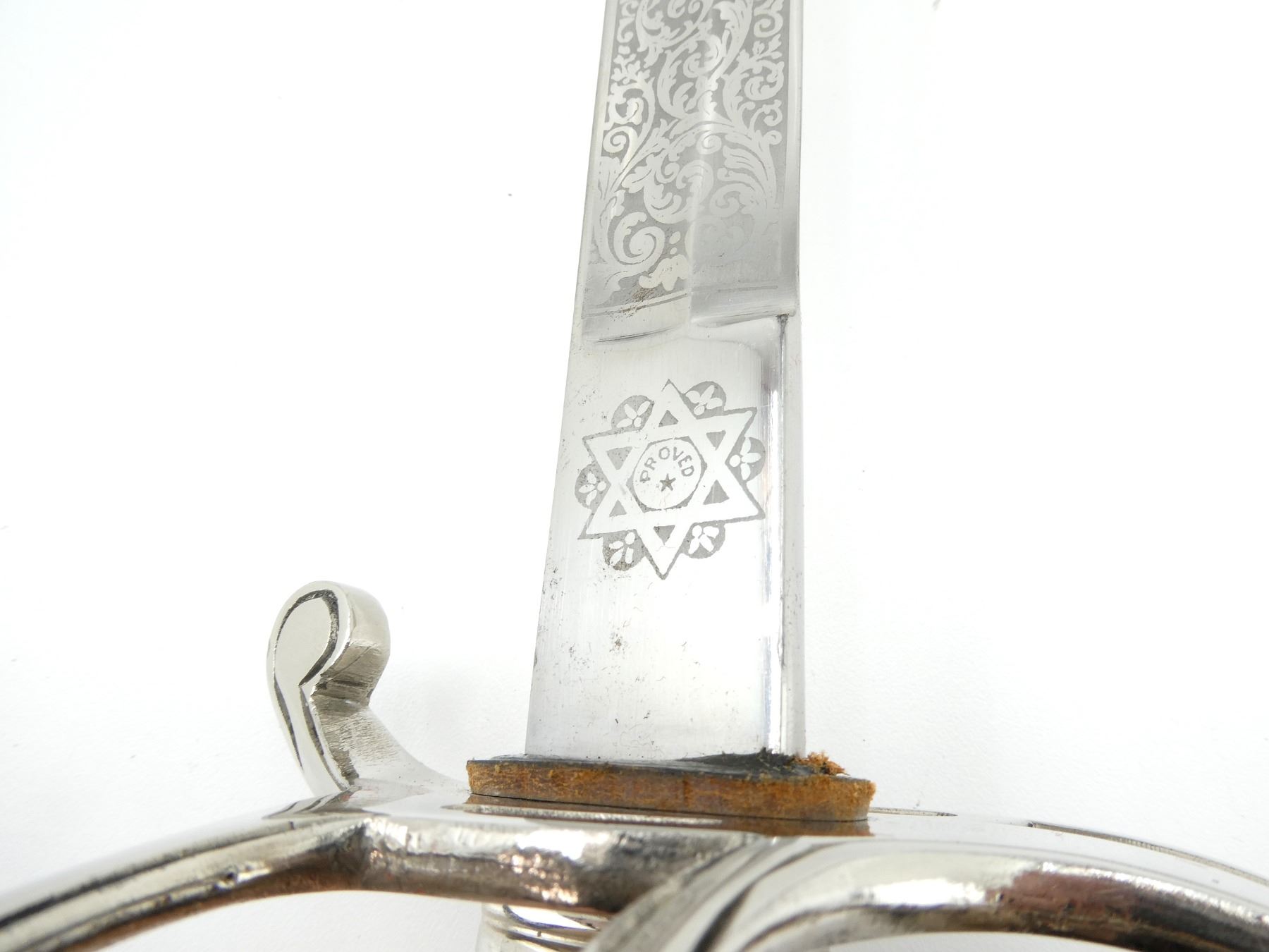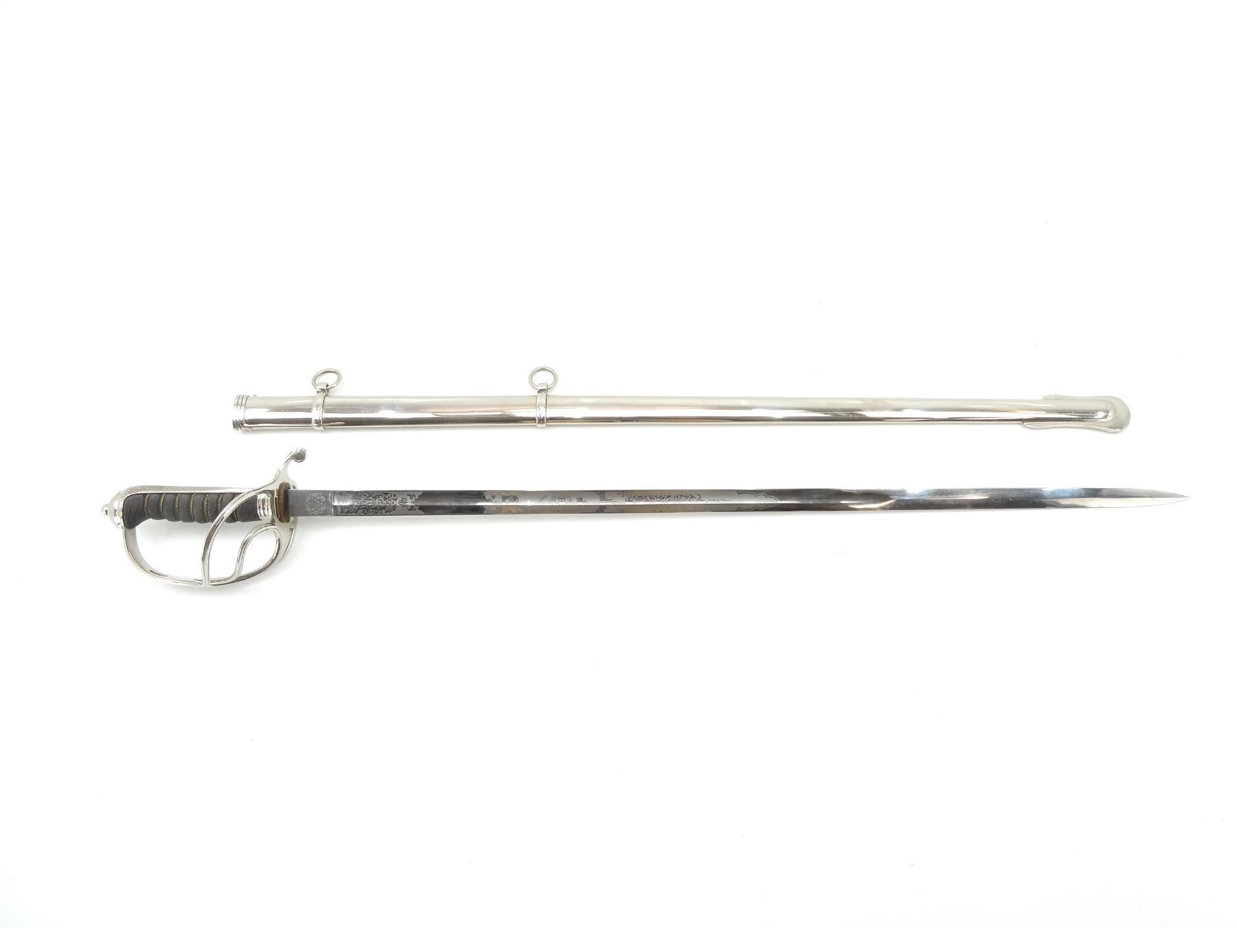 (1) STRAIGHT SINGLE-FULLERED BLADE WITH DOUBLE-EDGED TIP, RICASSO MARKED: "HORSTATOR" OVER MAKER'S MARK OVER "SOLINGEN", OTHER-SIDE MARKED: "PROVED" IN A CIRCLE IN THE CENTER OF A STAR, BLADE ACID-ETCHED: "ROYAL CANADIAN, HORSE ARTILLERY" WITH WINGS / THUNDER BOLT DESIGN, VARIOUS FLORAL DESIGNS, OTHER-SIDE BLADE ACID-ETCHED: QUEEN'S CROWN OVER QUEEN ELIZABETH CYPHER / CREST OVER "ROYAL CANADIAN HORSE ARTILLERY" IN A BANNER OVER ARTILLERY CANNON, VARIOUS FLORAL DESIGNS, LEATHER WASHER / BUFFER PAD, DECORATIVE CHROMED HILT, NO VISIBLE MARKINGS, BLACK PEBBLED WIRE WRAPPED GRIP, METAL CHECKERED GRIP BACKING, CHROMED POMMEL, NO VISIBLE MARKINGS, CHROMED STEEL SCABBARD WITH TWO HANGER LOOPS, NO VISIBLE MARKINGS, BLADE APPROX. 32.25" & OVERALL LENGTH APPROX. 38.5". SEE PHOTOS.