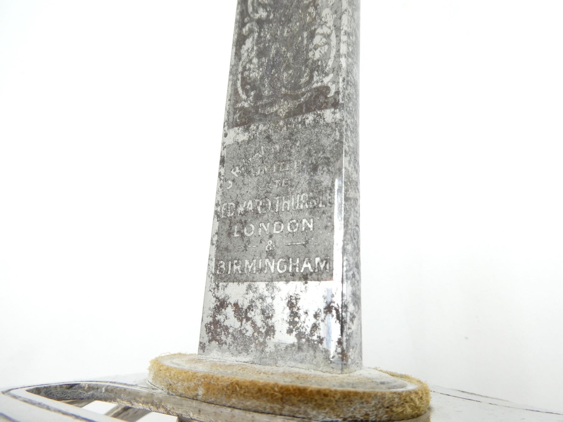 (1) STRAIGHT PARTIALLY FULLERED SINGLE EDGED BLADE, RICASSO ACID ETCHED: "J.R.GAUNT & SON, LIMITED, LATE, EDWARD THURKLE, LONDON & BIRMINGHAM", BLADE ACID ETCHED WITH KING'S CROWN OVER BOW ATTACHED TO BUGLE (RIFLES INSIGNIA) WITH VARIOUS FLORAL ACID ETCHINGS, OTHER-SIDE RICASSO ACID ETCHED WITH STAR SHAPE WITH BRASS "PROVED" EMBLEM IN CENTER, BLADE ACID ETCHED: KING'S CROWN OVER "GRV" CYPHER WITH VARIOUS FLORAL ACID ETCHINGS, BLADE SPINE MARKED: "17367", LEATHER BUFFER PAD / WASHER, DECORATIVE HANDGUARD / HILT WITH KING'S CROWN OVER BOW ATTACHED TO BUGLE (RIFLES INSIGNIA), BLACK PEBBLED WIRE WRAPPED GRIP, METAL CHECKERED GRIP BACKING, METAL POMMEL, NO VISIBLE MARKINGS, STEEL SCABBARD WITH TWO HANGER LOOPS, NO VISIBLE MARKINGS, BLADE APPROX. 33 1/8" & OVERALL LENGTH APPROX. 39". SEE PHOTOS.