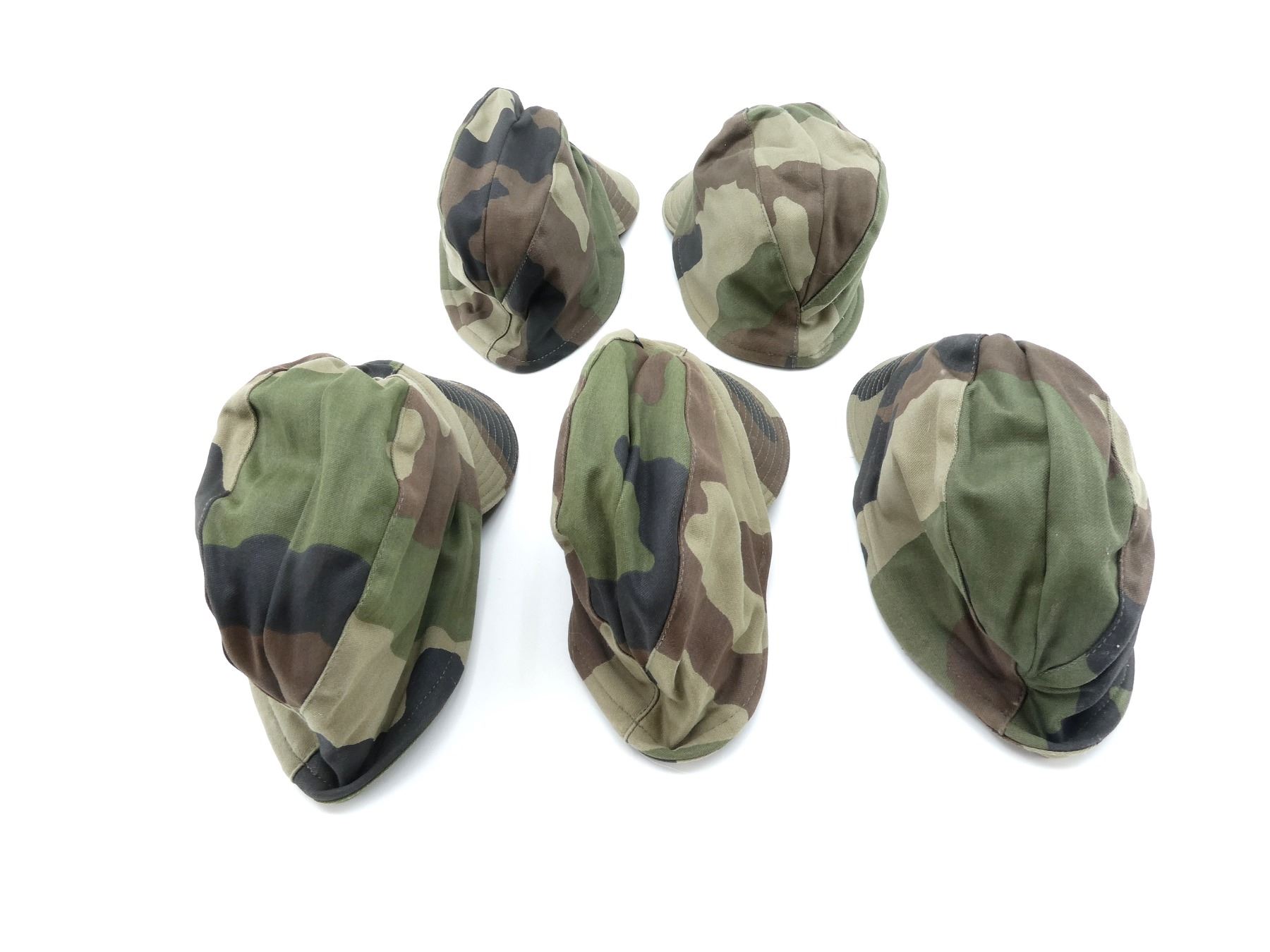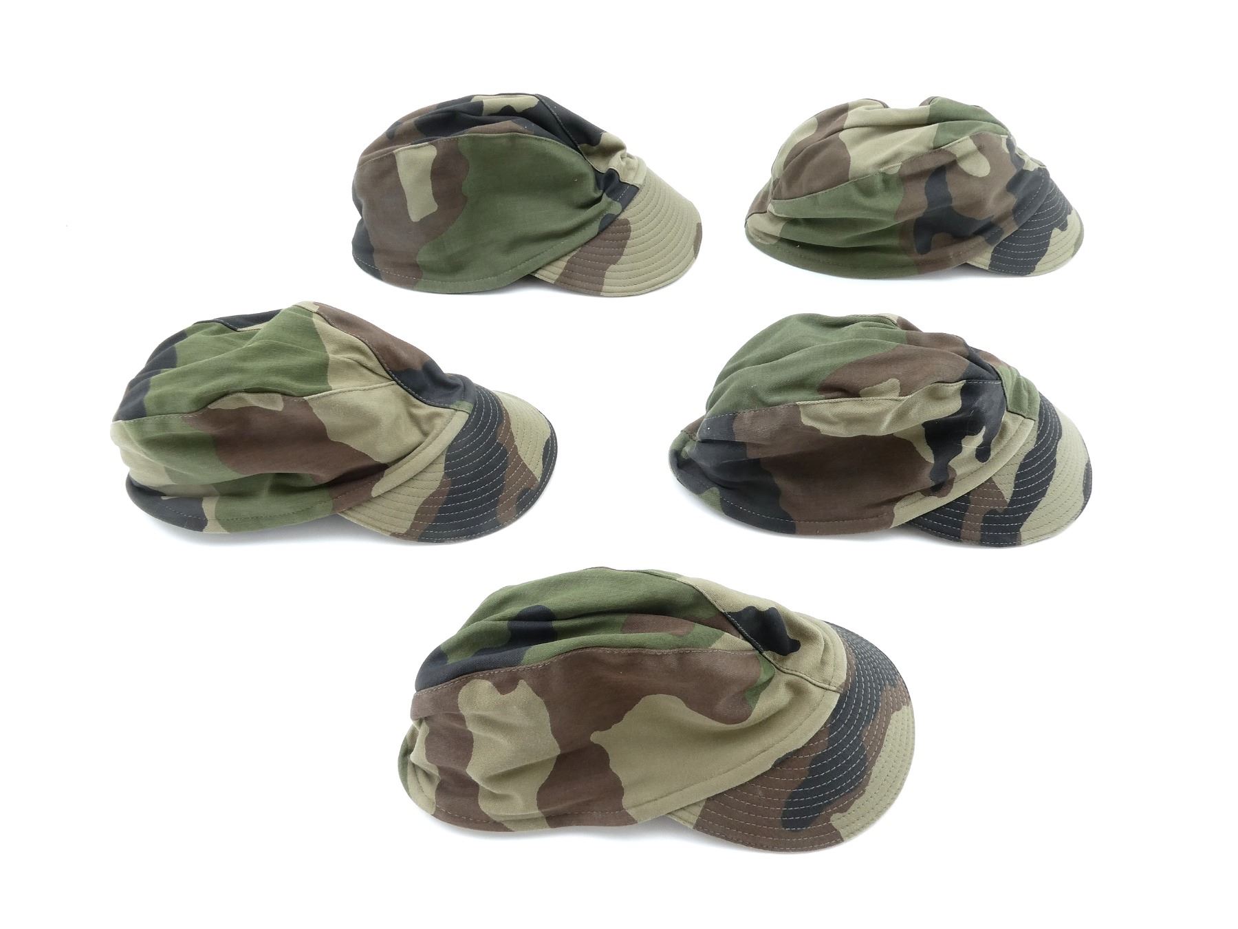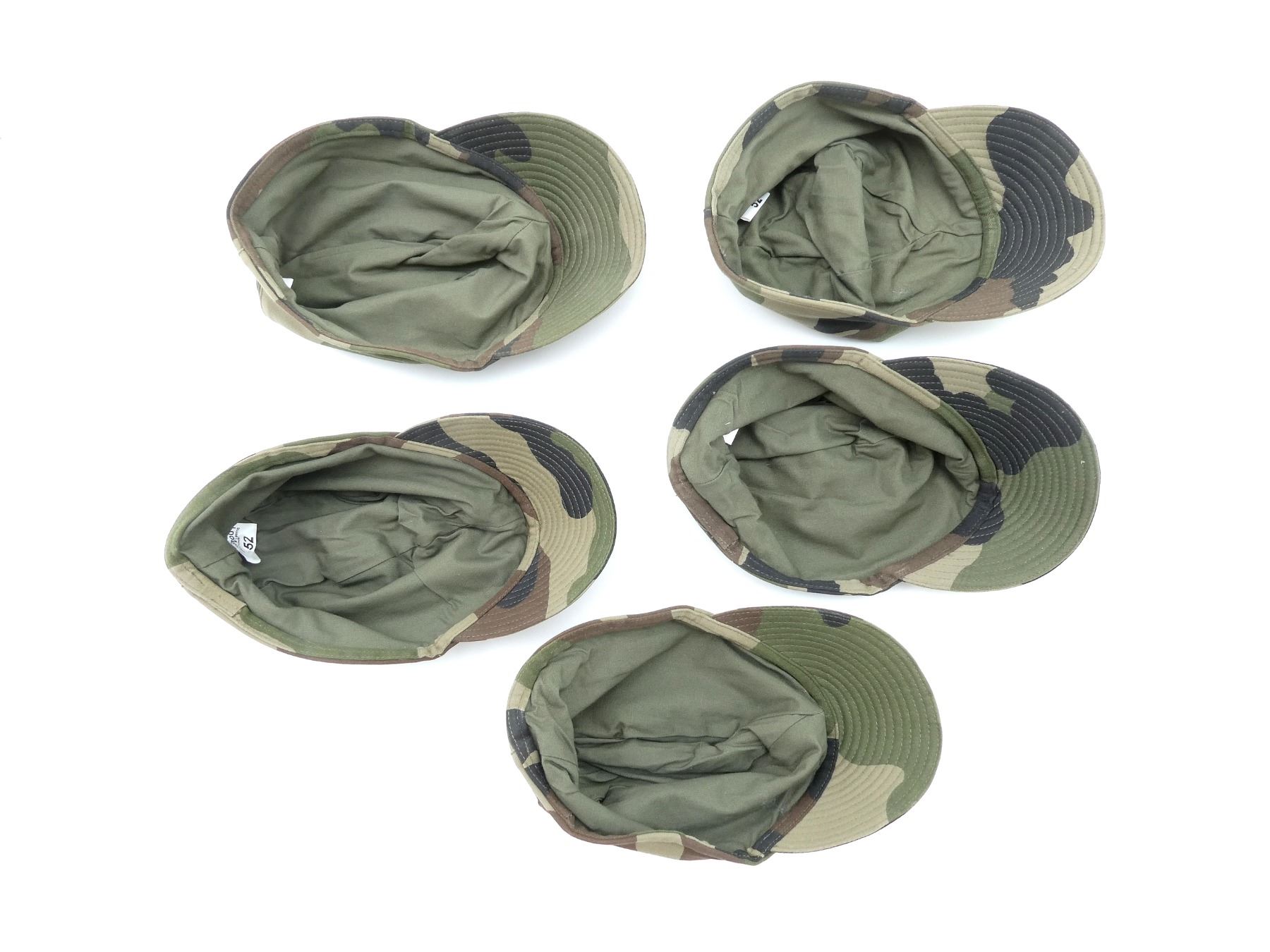 LOT INCLUDES; (5) CAMO FIELD CAPS, LABELS MARKED: "CSV 2001, CHATONNAY 85110, 52", "CVS 2001, CHATONNAY 85110, 53", 52 / 53 CM SIZING, ALL APPEAR NEW OLD STOCK. SEE PHOTOS.