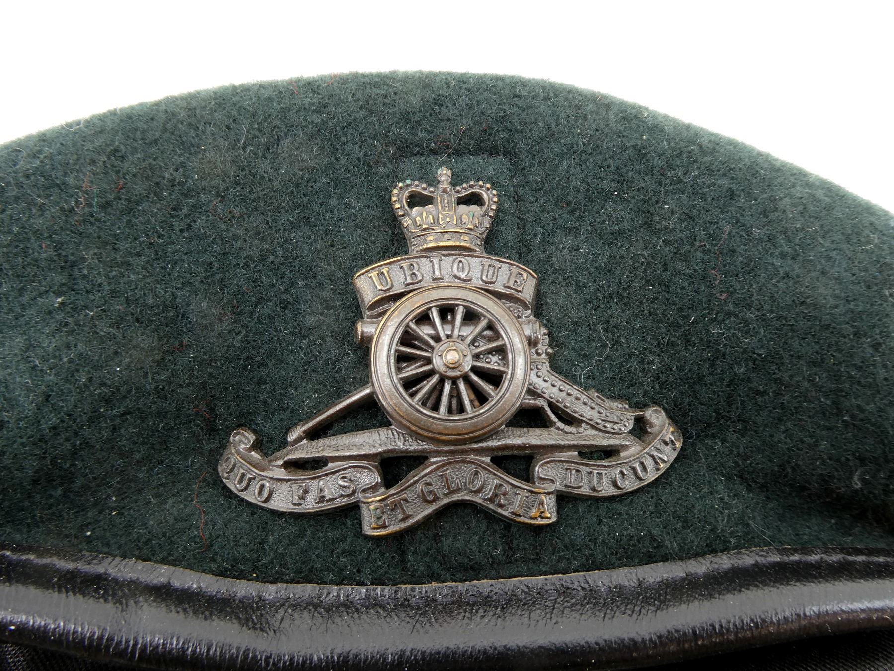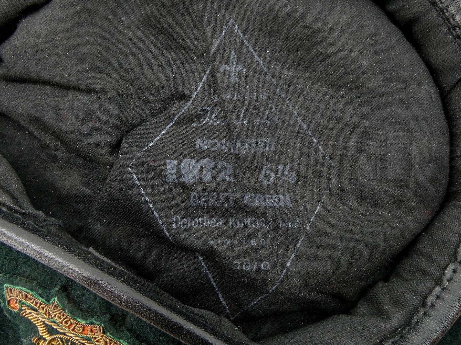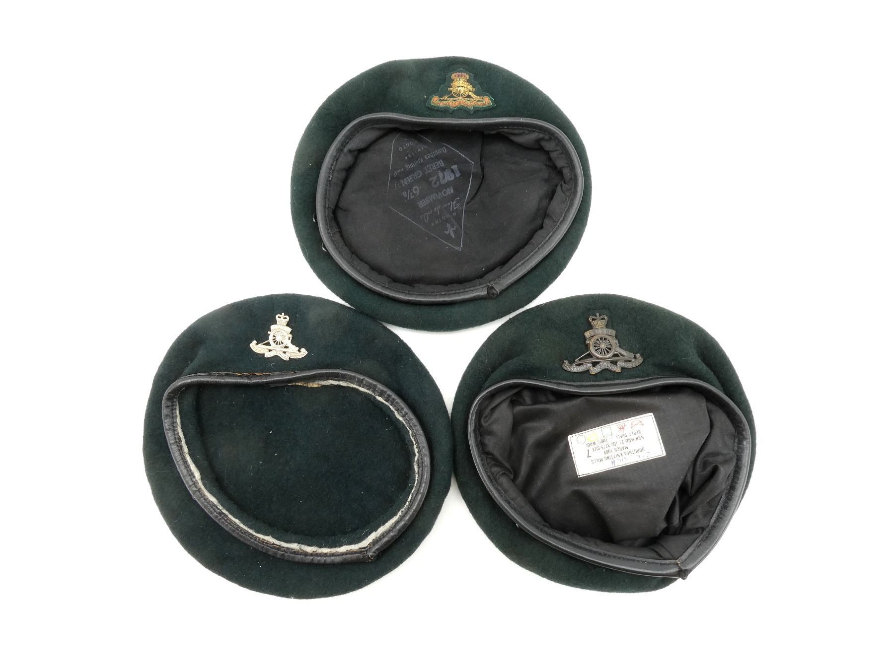 LOT INCLUDES; (3) DARK / RIFLE GREEN BERETS, ONE HAS NO VISIBLE MARKINGS WITH QUEEN'S CROWN ARTILLERY CAP BADGE, ONE MARKED: "DOROTHEA KNITTING MILLS, MARCH 1989, NSN 8405-21-103-3775 SIZE 7" ETC. WITH QUEEN'S CROWN ARTILLERY CAP BADGE, LAST MARKED: "GENUINE, FLEUR DE LIS, NOVEMBER, 1972, 6 7/8, DOROTHEA KNITTING MILLS, LIMITED, TORONTO, CAN" ETC. WITH WIRE ARTILLERY CAP BADGE, ALL SHOWS AGE / WEAR. SEE PHOTOS.
