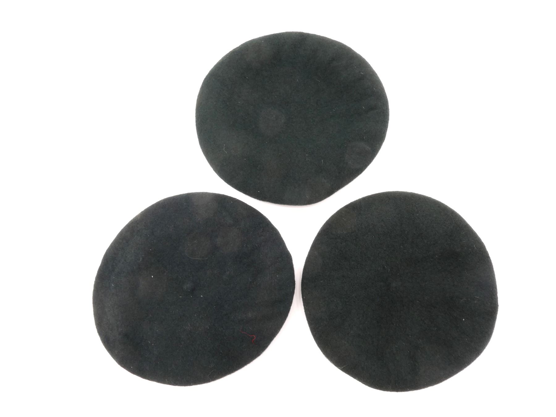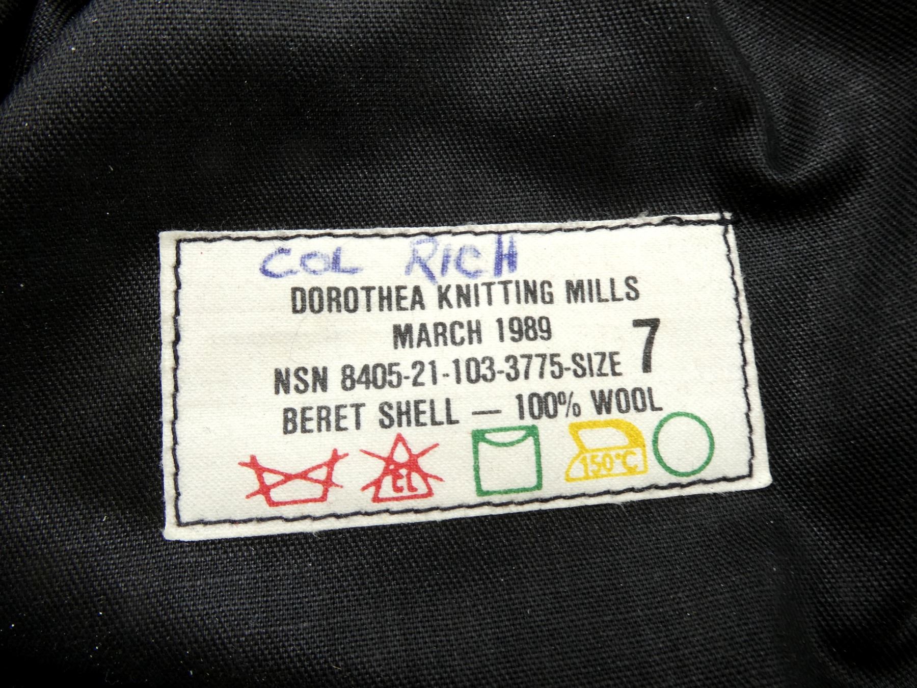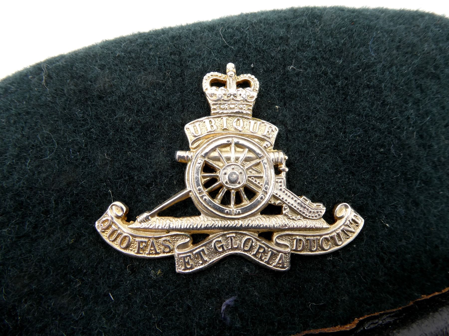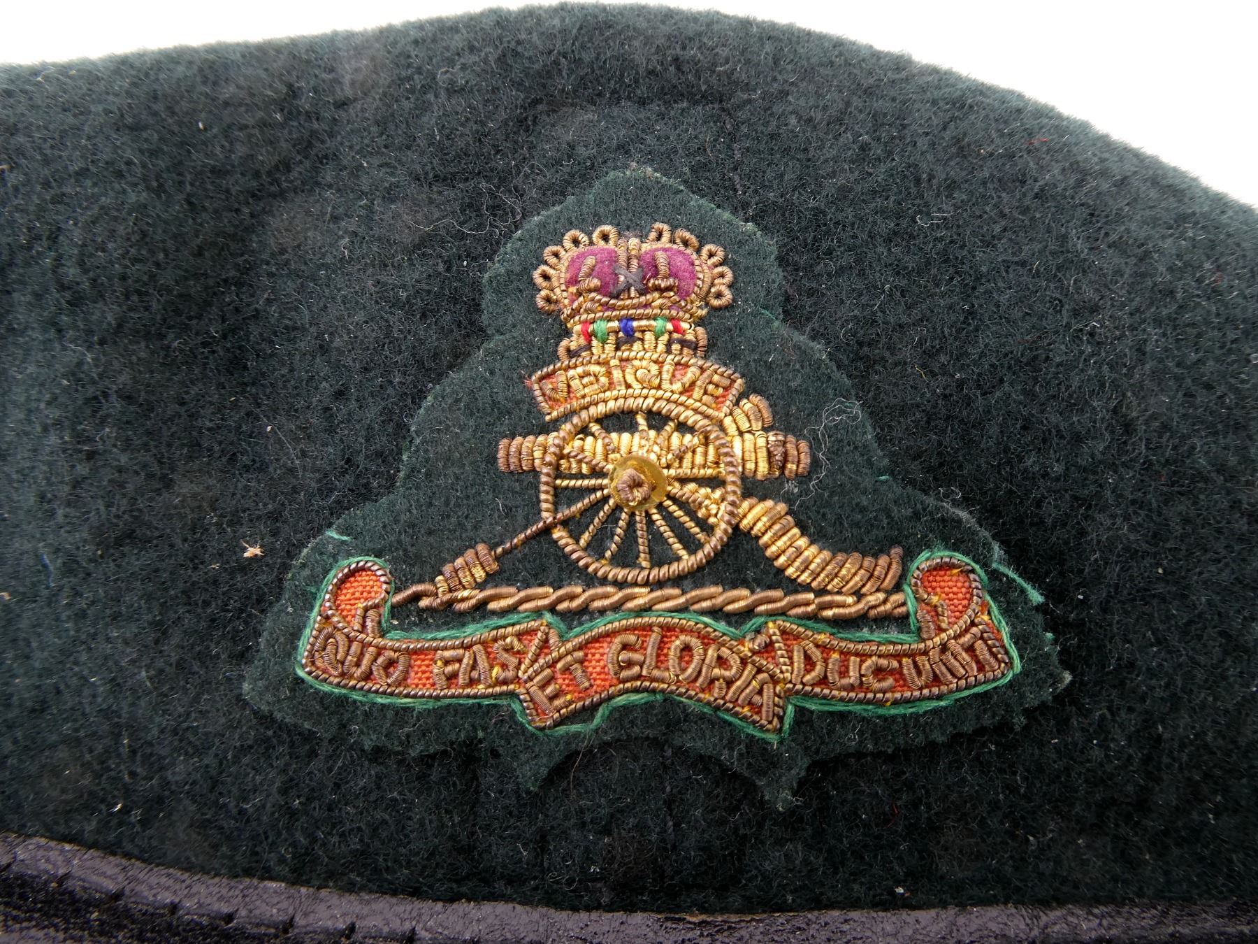 LOT INCLUDES; (3) DARK / RIFLE GREEN BERETS, ONE HAS NO VISIBLE MARKINGS WITH QUEEN'S CROWN ARTILLERY CAP BADGE, ONE MARKED: "DOROTHEA KNITTING MILLS, MARCH 1989, NSN 8405-21-103-3775 SIZE 7" ETC. WITH QUEEN'S CROWN ARTILLERY CAP BADGE, LAST MARKED: "GENUINE, FLEUR DE LIS, NOVEMBER, 1972, 6 7/8, DOROTHEA KNITTING MILLS, LIMITED, TORONTO, CAN" ETC. WITH WIRE ARTILLERY CAP BADGE, ALL SHOWS AGE / WEAR. SEE PHOTOS.