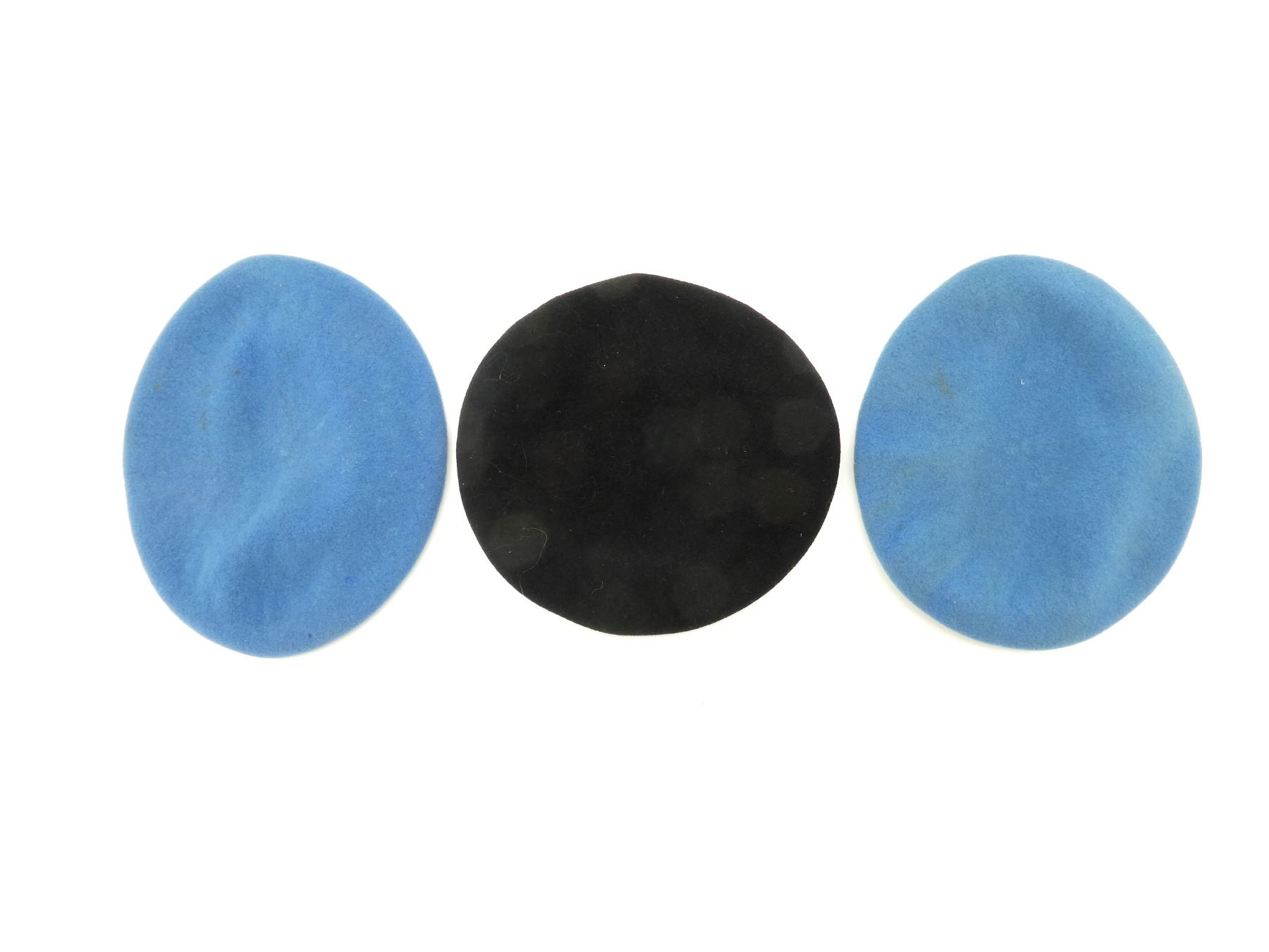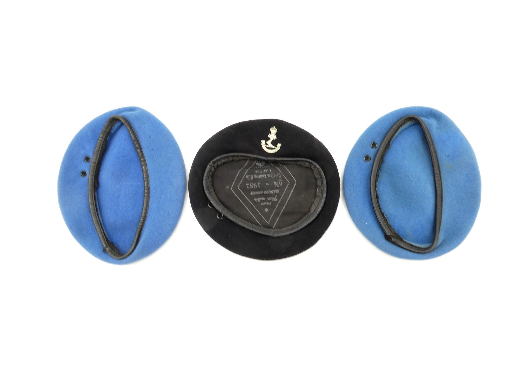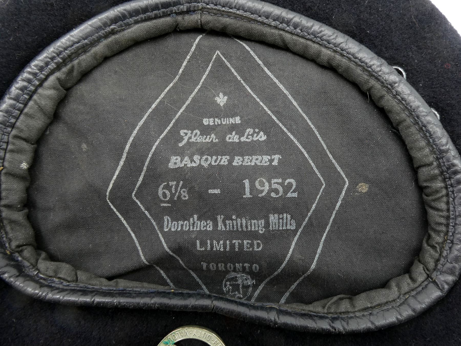 LOT INCLUDES; (2) LIGHT BLUE WOOL BERETS, NO CAP BADGES, NO VISIBLE MARKINGS, SHOWS AGE / WEAR & (1) 1950'S NAVY BLUE WOOL BERET, KING'S CROWN ROYAL MILITARY COLLEGE OF CANADA CAP BADGE, BERET MARKED: "GENUINE, FLEUR DE LIS, BASQUE BERET, 6 7/8, 1952, DOROTHEA KNITTING MILLS, LIMITED, TORONTO" WITH MAPLE LEAF PROOF MARK, SHOWS SOME AGE / WEAR. SEE PHOTOS.