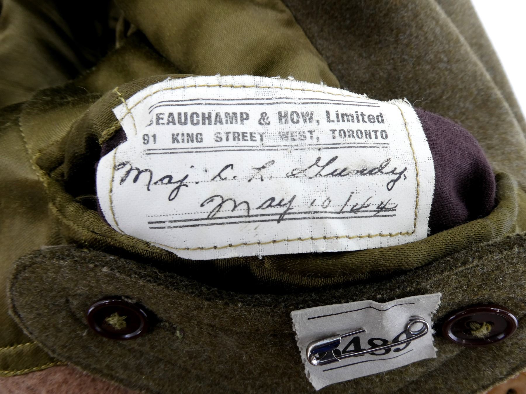 (1) OLIVE GREEN WOOL GREAT COAT, MARKED: "MAJ./C.L. GUNDY, MAY 10/44", "C.L. GUNDY", ETC., CLOSED COLLAR, BRASS KING'S CROWN SHOULDER BADGES, CANADA WOOL SHOULDER FLASHES, BRASS TORONTO SCOTTISH BUTTONS, DOUBLE-BREASTED BUTTON FRONT, SHOWS SLIGHT WEAR, SOME REPAIR SPOTS NEAR SHOULDERS INSIDE, SHOULDER WIDTH APPROX. 18". SEE PHOTOS.