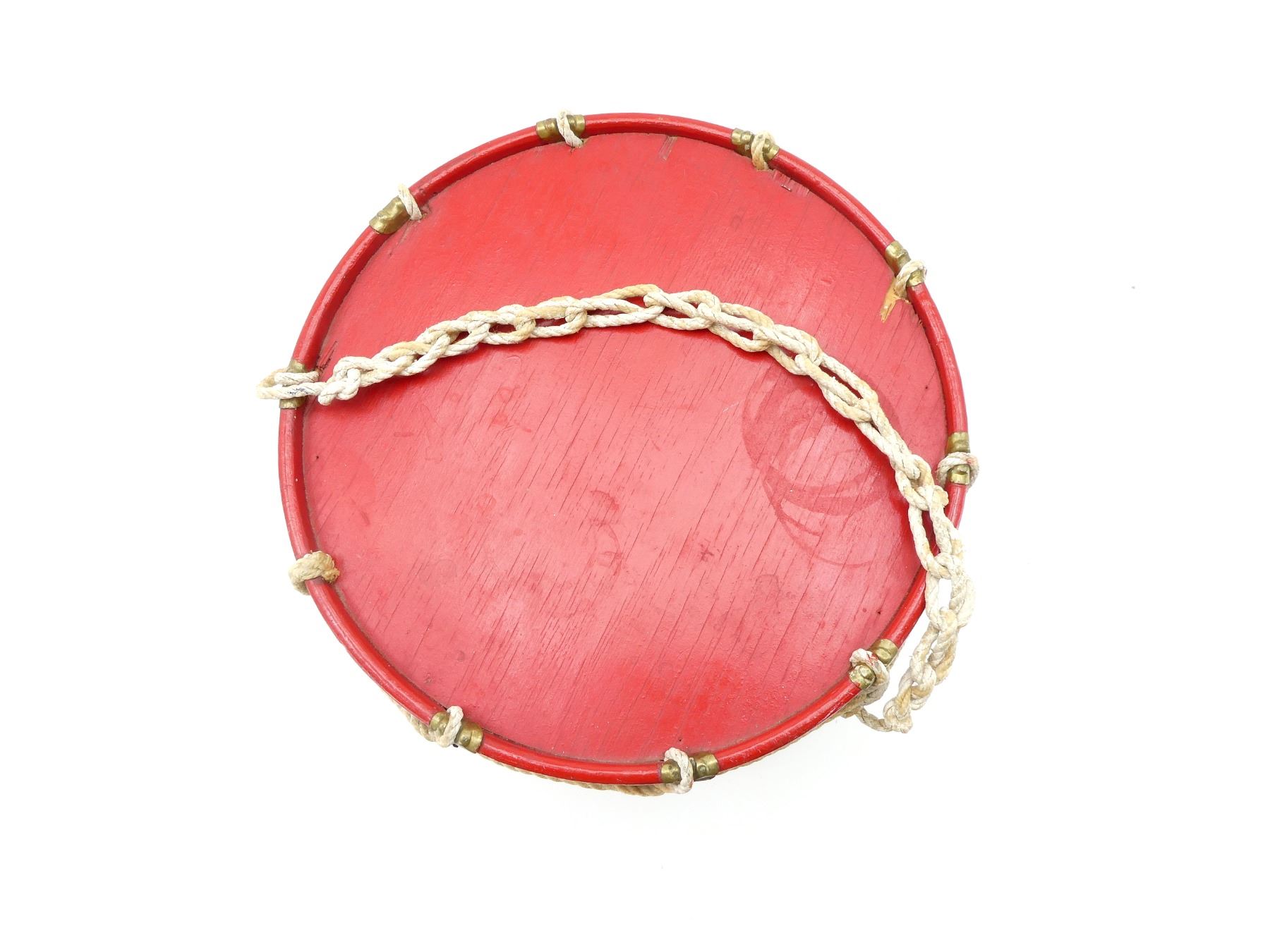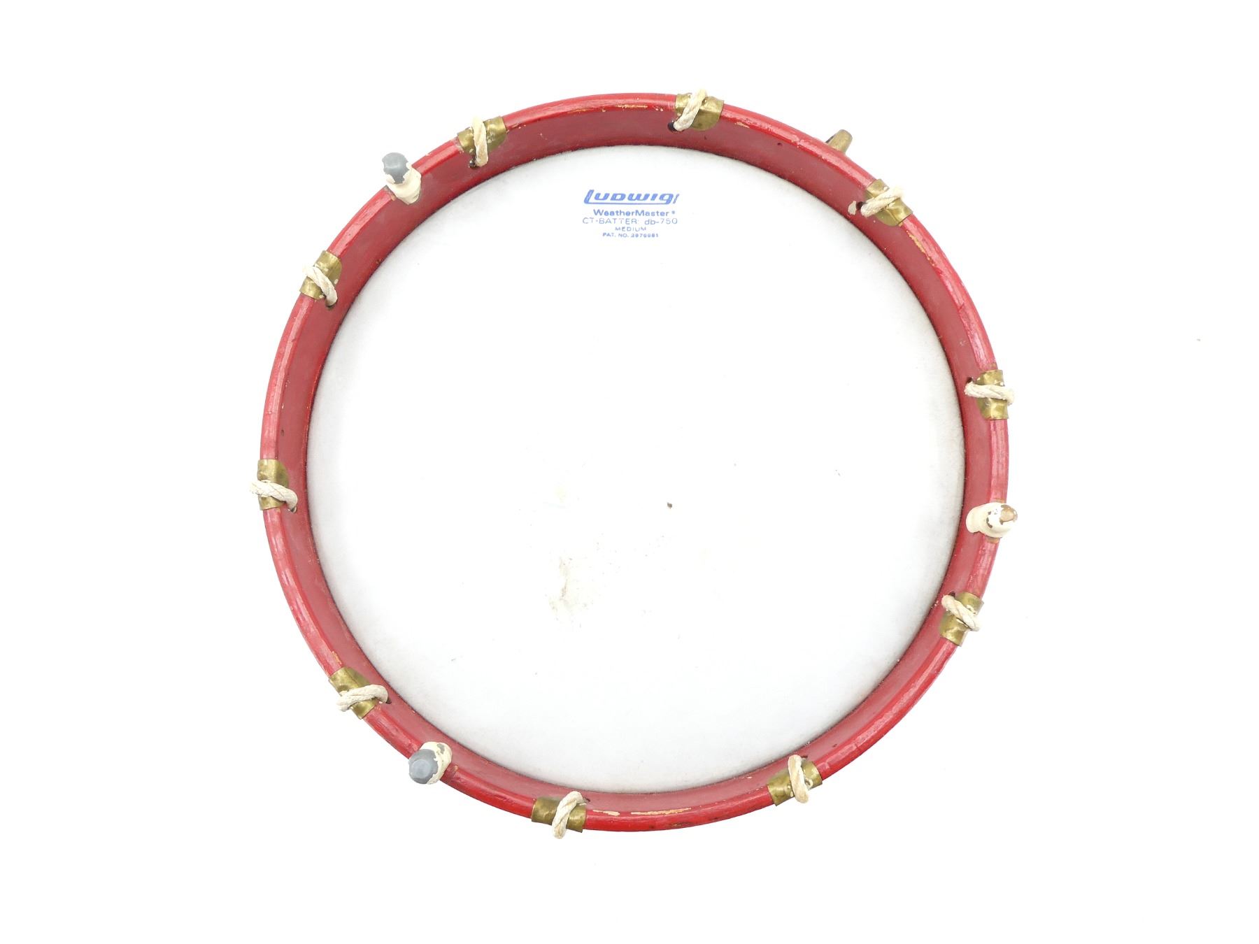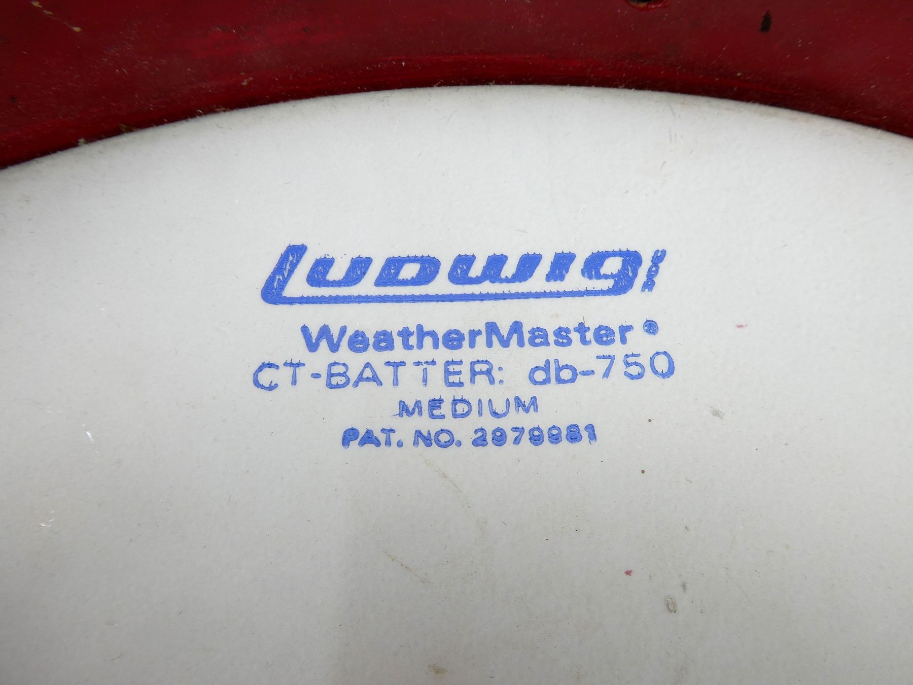 (1) WOOD / BRASS CONSTRUCTED DRUM, RED / WHITE / BLUE PAINTED RIMS, BRASS BODY MARKED: "WHALEY ROYCE & CO, LIMITED, TORONTO", WHITE ROPE & LEATHER TENSION, BRASS SPACERS FOR THE ROPES, TOP MARKED: "LUDWIG, WEATHERMASTER, CT-BATTER: DB-750, MEDIUM, PAT. NO. 2979981", APPROX. 15" DIA. & APPROX. 14.75" H. SEE PHOTOS.