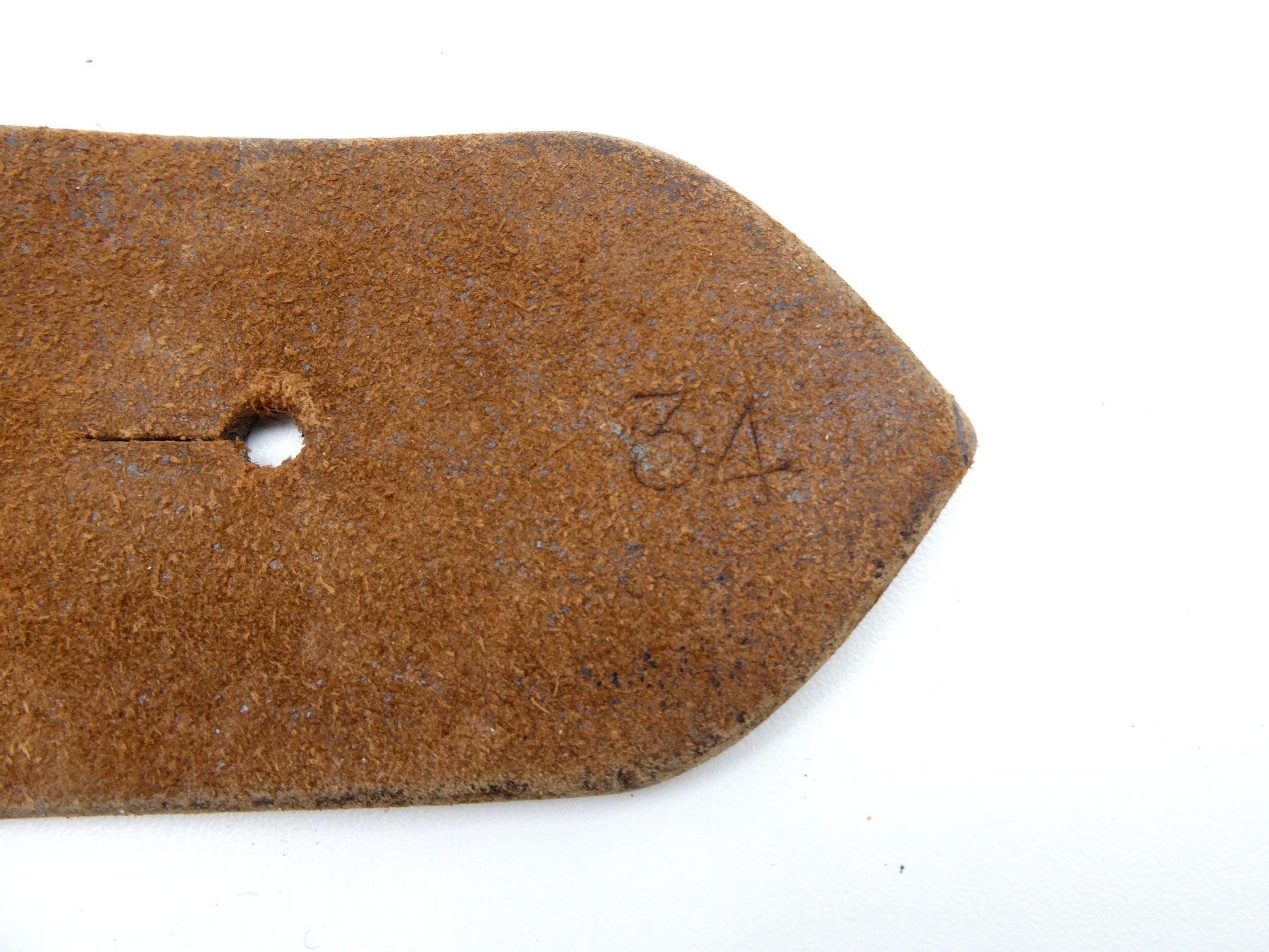 (1) BROWN LEATHER BELT WITH DECORATIVE STITCHING, LEATHER IS SOFT, BRASS BELT BUCKLE / FITTINGS, MARKED: "34" (POSSIBLE SIZING), OVERALL LENGTH APPROX. 43.25", ADJUSTABLE. SEE PHOTOS.