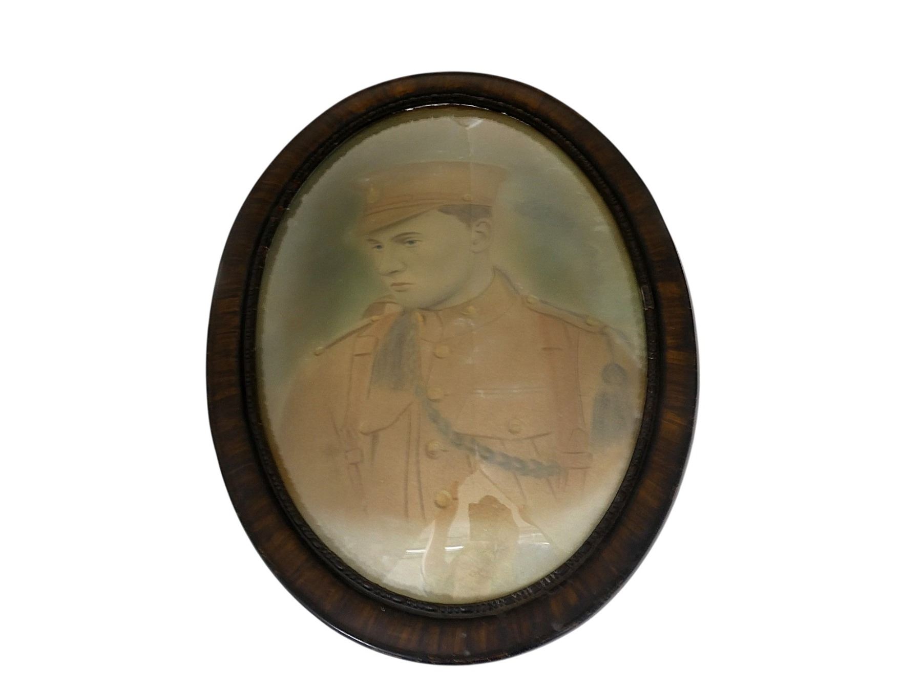 (1) HAND DRAW / PAINTED PORTRAIT OF A CANADIAN SOLDIER, UNDER GLASS, NO ARTIST NAME / SIGNATURE, VINTAGE WOODEN OVULAR FRAME, NO VISIBLE MARKINGS, APPROX. 21 7/8" X 16". SEE PHOTOS. *NO GUARANTEE ON GLASS FOR SHIPPING*