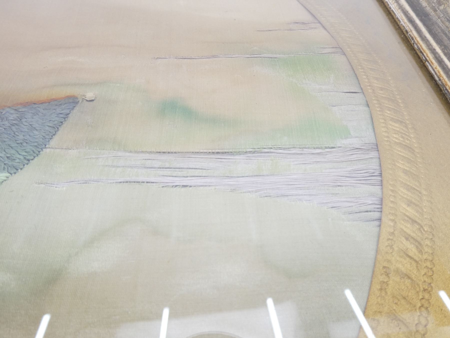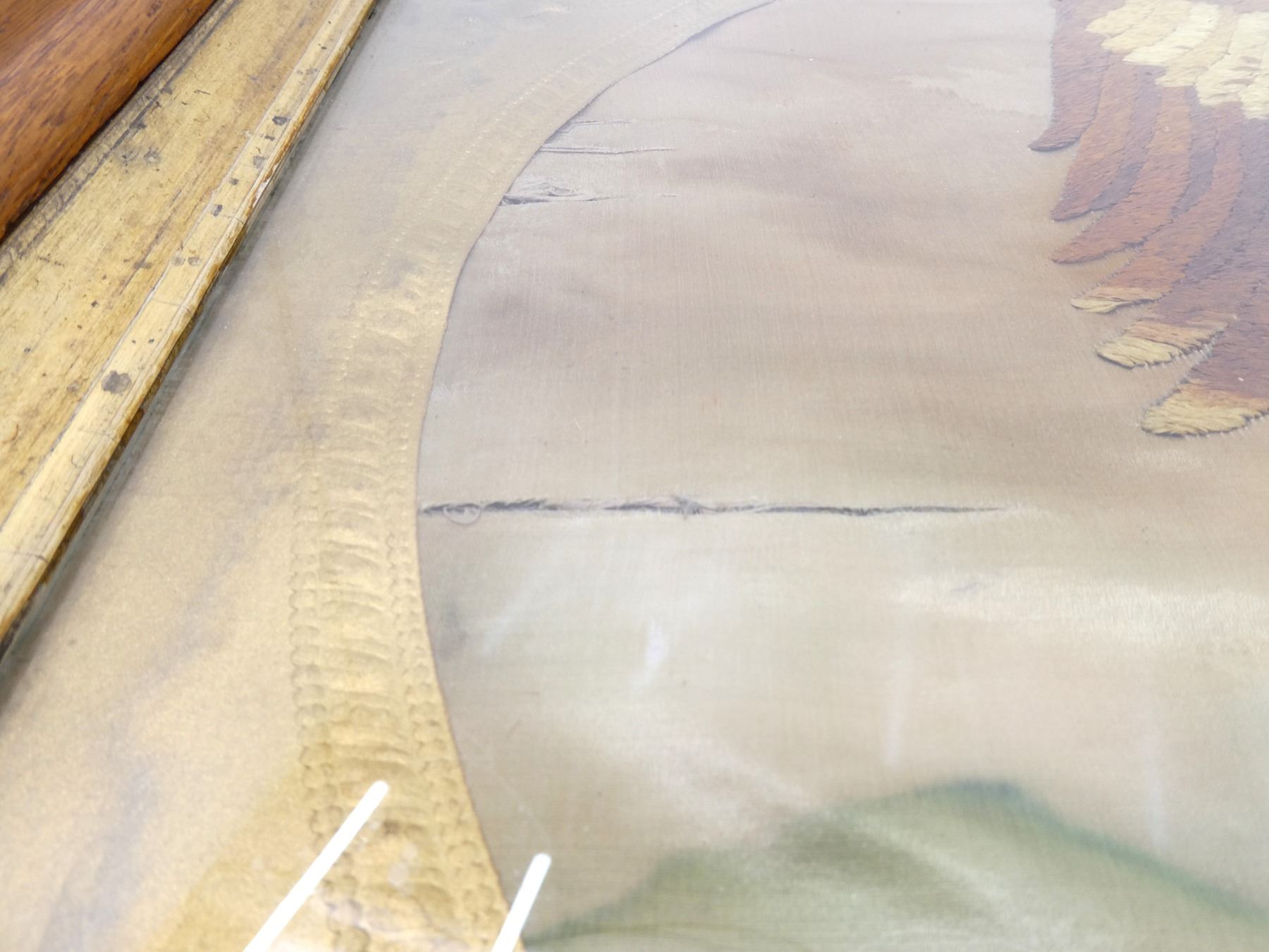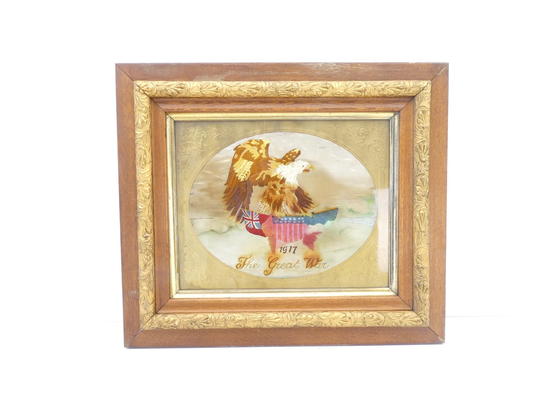 (1) CLOTH WITH EMBROIDERED EAGLE HOLDING VARIOUS FLAGS, UNDERNEATH EMBROIDERED: "1917, THE GREAT WAR", SHOWS AGE / WEAR / TEAR, FRAMED UNDER GLASS, LARGE WOODEN FRAME WITH SOME GOLD PAINTED DETAILING, APPROX. 29.75" X 25.75". SEE PHOTOS. *NO GUARANTEE ON GLASS FOR SHIPPING*