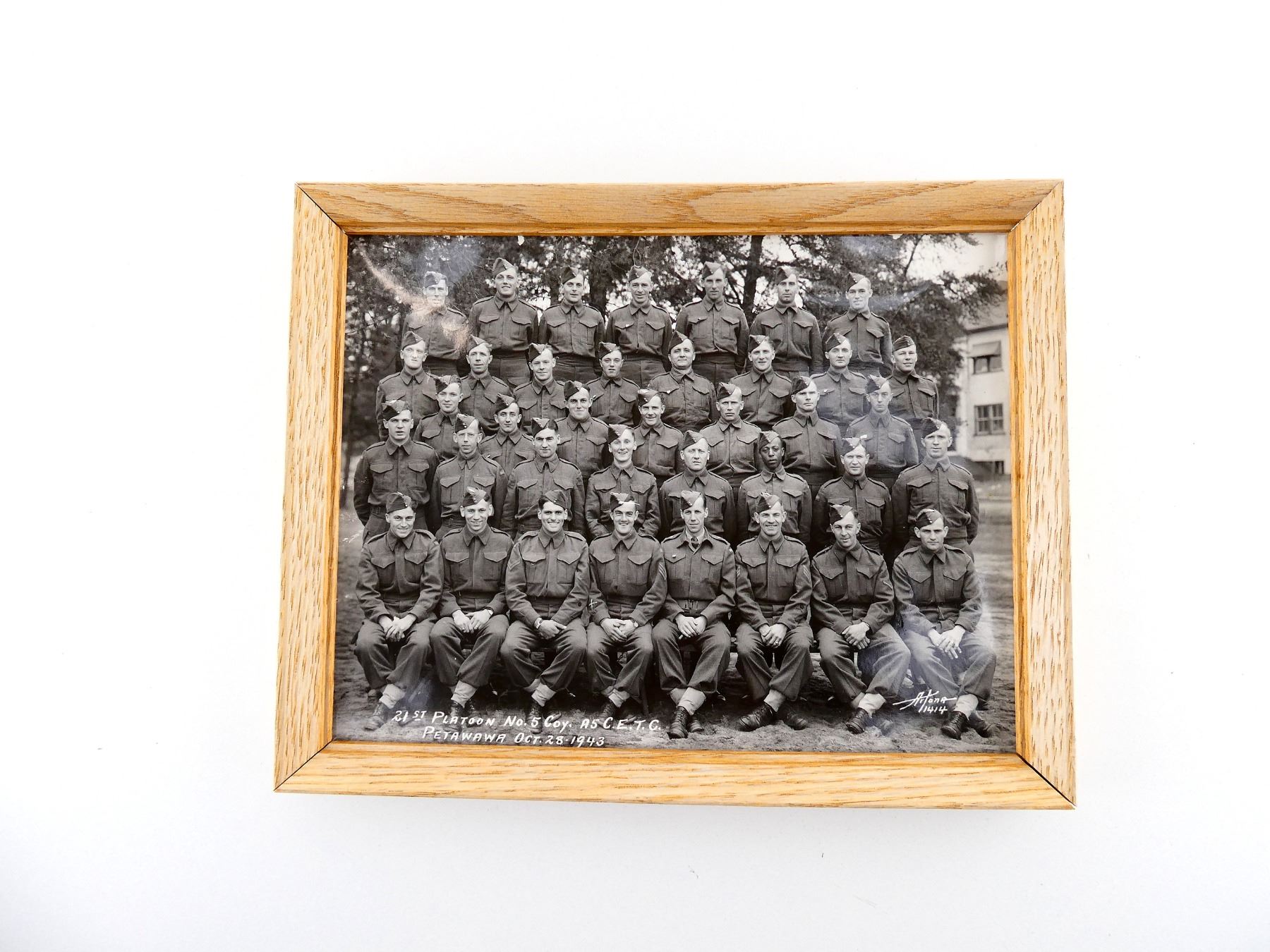 (1) BLACK / WHITE PHOTO OF CANADIAN PLATOON, PHOTO MARKED: "21ST PLATOON NO.5 COY A5 C.E.T.C., PETAWAWA OCT. 28 1943", "ARTONA, 1414" (POSSIBLE PHOTOGRAPHER MARKING), WOODEN FRAME, NO GLASS, APPROX. 9 7/8" X 7 7/8". SEE PHOTOS.