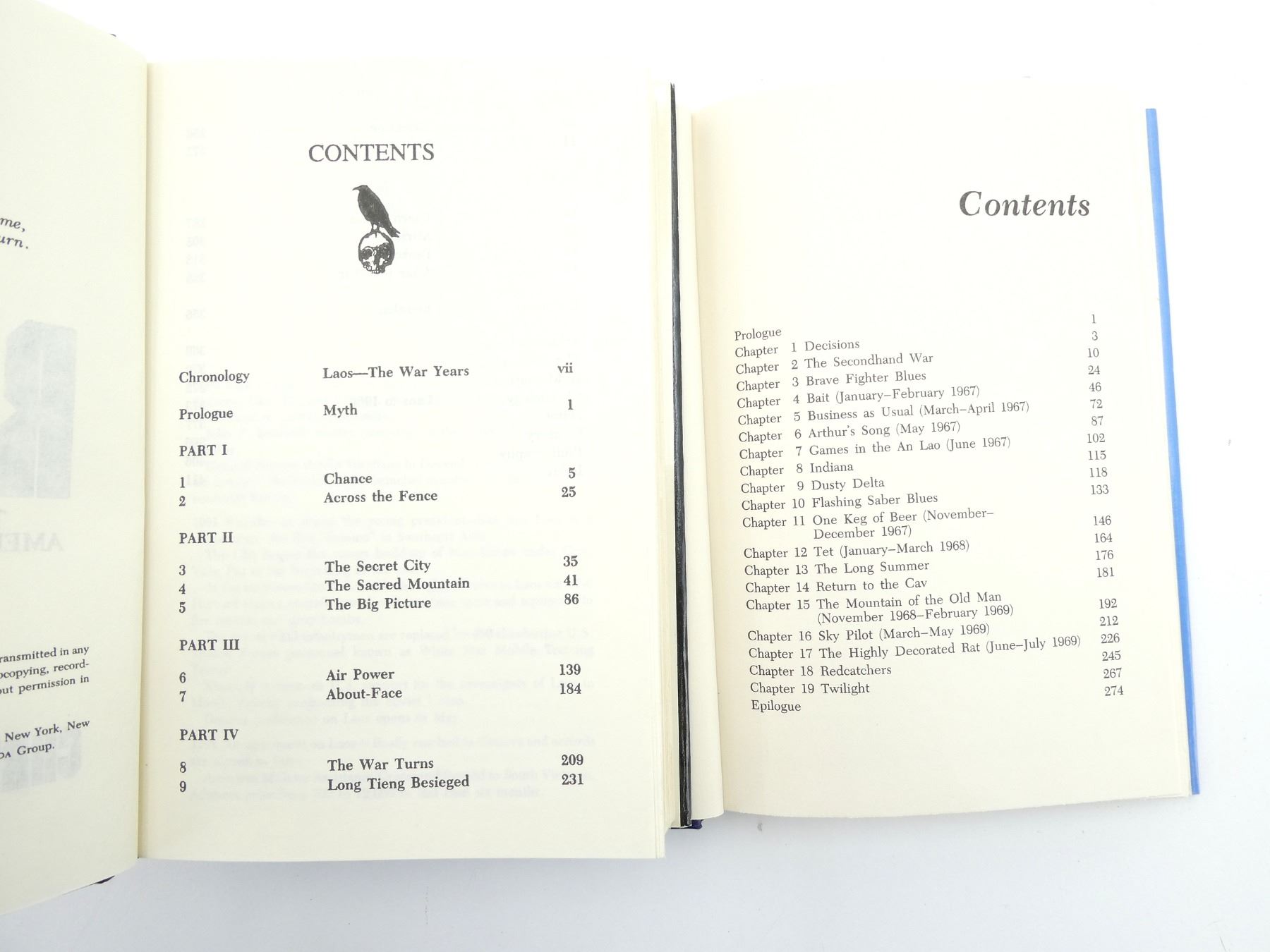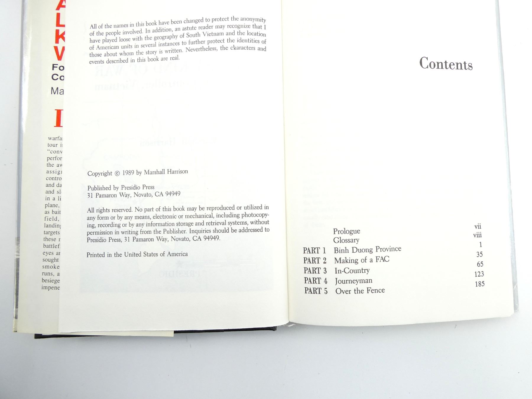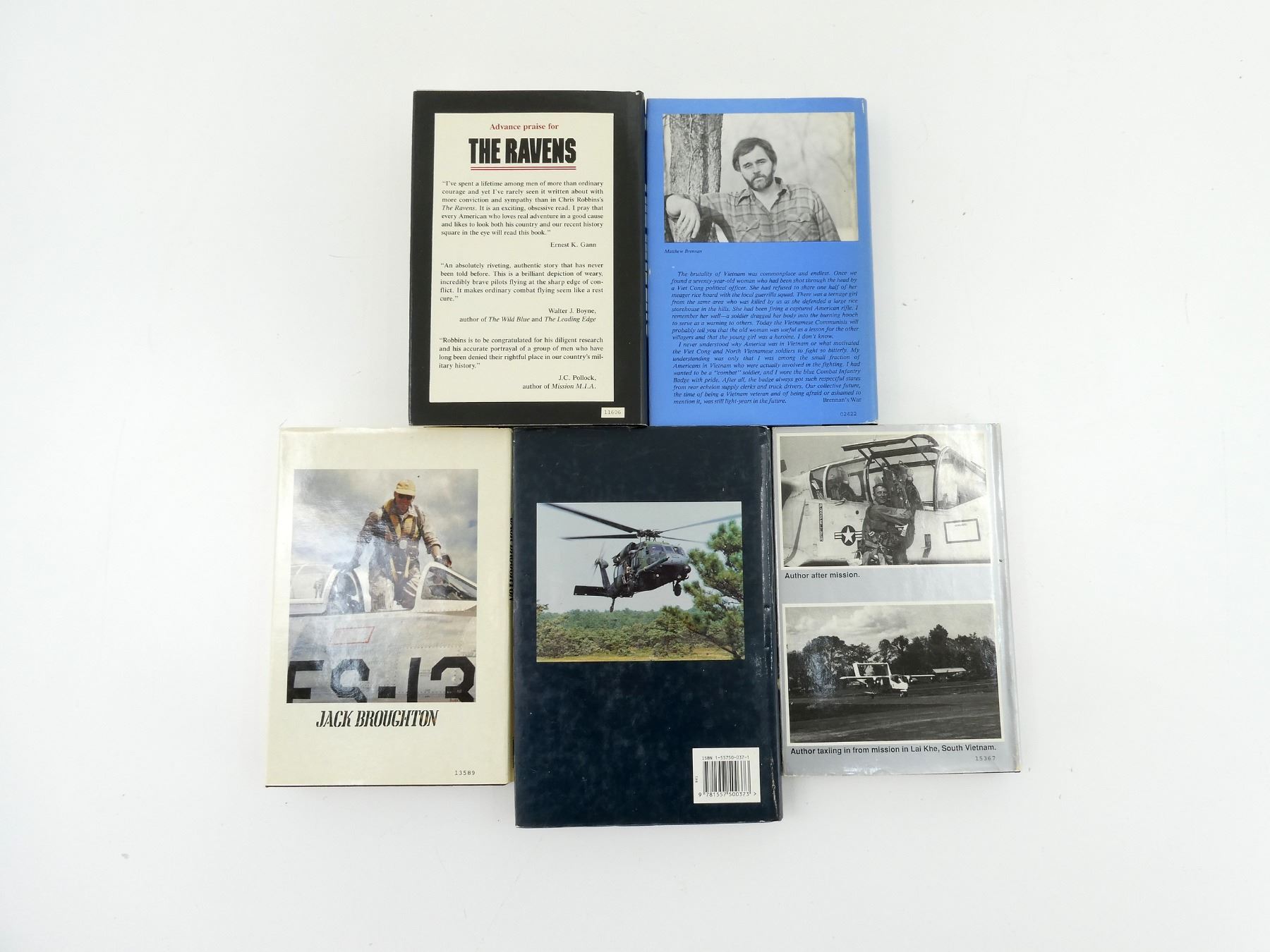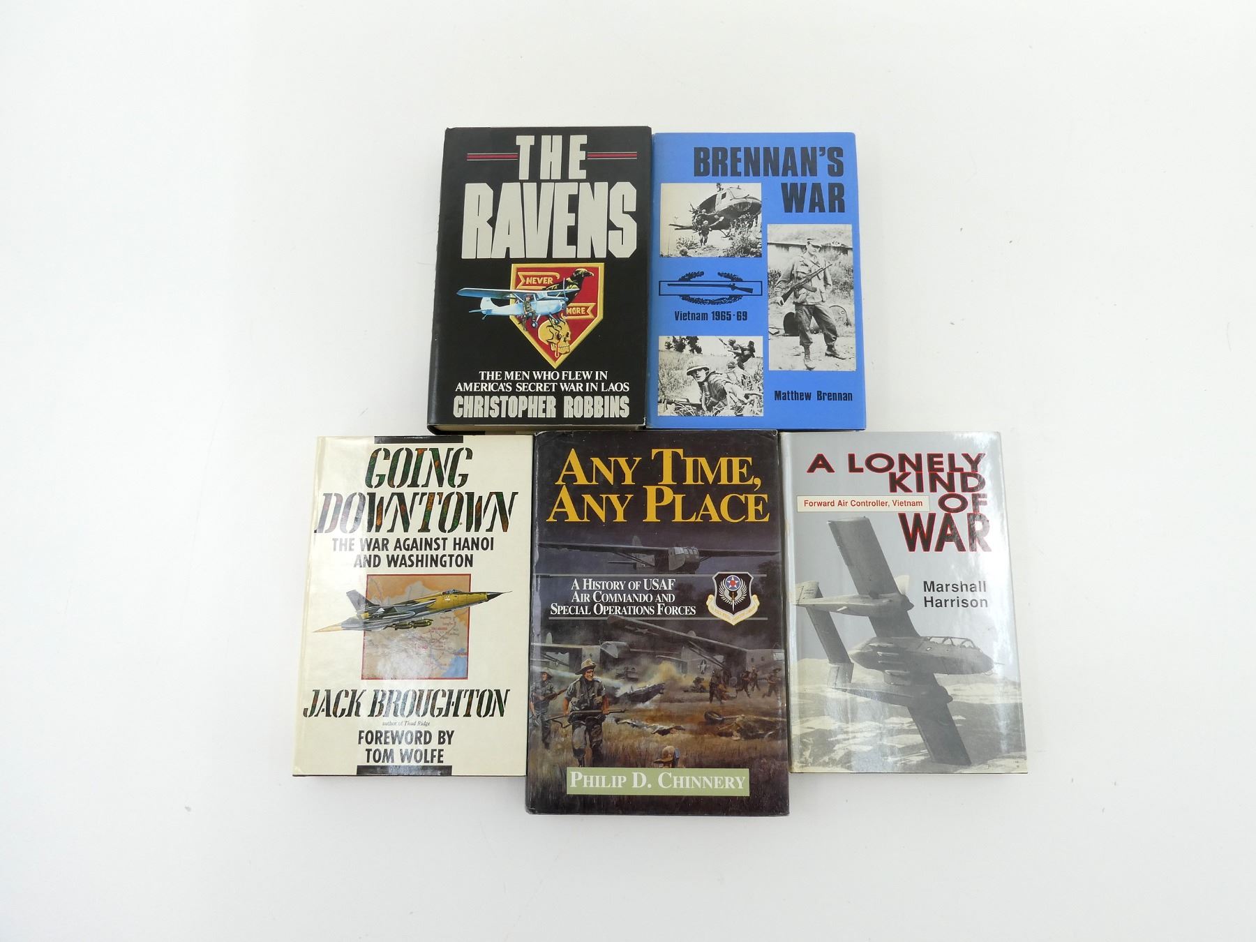 LOT INCLUDES; (1) "BRENNAN'S WAR, VIETNAM 1965-69" BOOK BY MATTHEW BRENNAN, HARD COVER WITH DUST COVER, COPYRIGHT 1985, (1) "A LONELY KIND OF WAR" BOOK BY MARSHALL HARRISON, HARD COVER WITH DUST COVER, COPYRIGHT 1989, (1) "GOING DOWNTOWN, THE WAR AGAINST HANOI AND WASHINGTON" BOOK BY JACK BROUGHTON, HARD COVER WITH DUST COVER, COPYRIGHT 1988, (1) "THE RAVENS" BOOK BY CHRISTOPHER ROBBINS, HARD COVER WITH DUST COVER, COPYRIGHT 1987 & (1) "ANY TIME, ANY PLACE" BOOK BY PHILIP D. CHINNERY, HARD COVER WITH DUST COVER, ISBN: 1-55750-037-1. SEE PHOTOS.