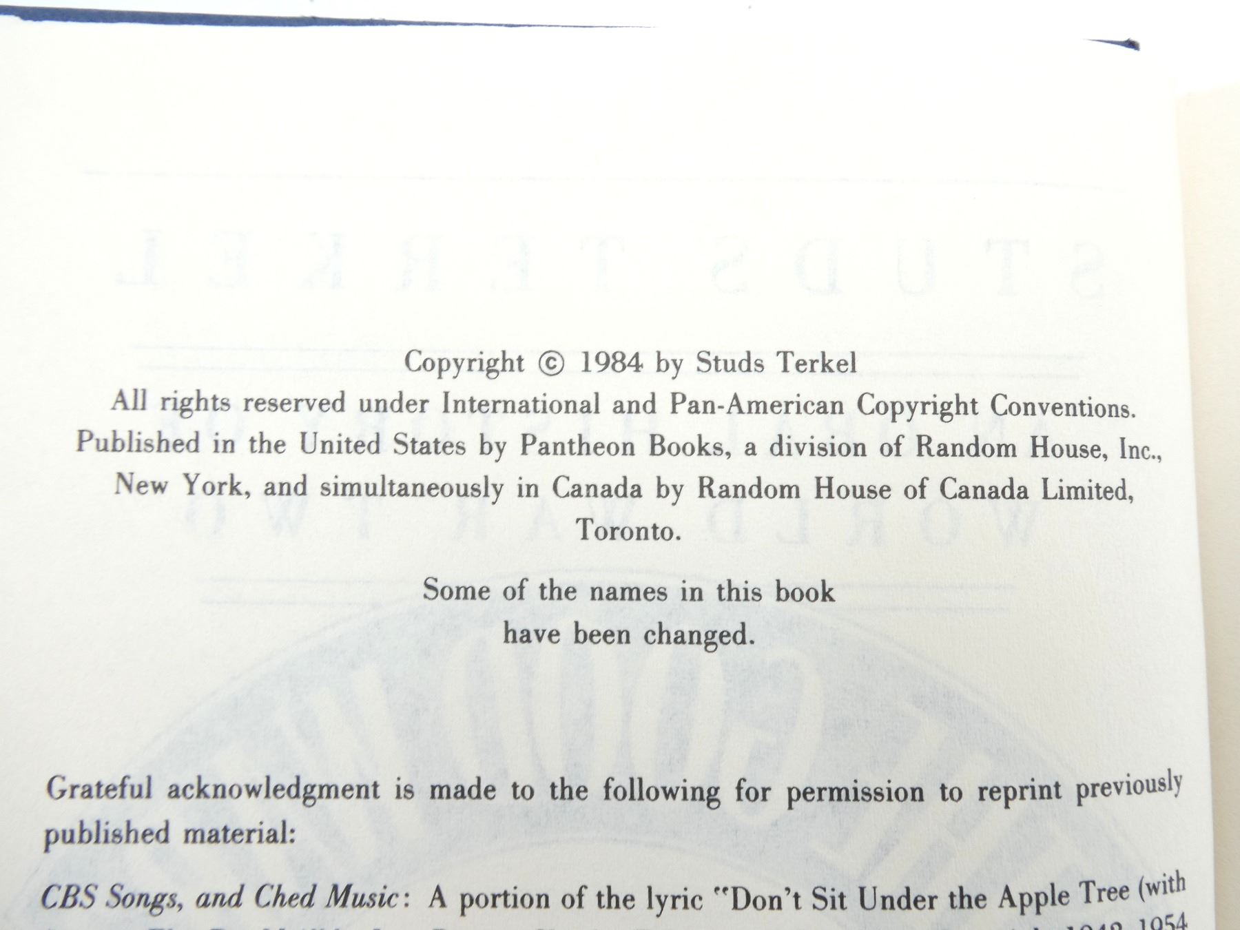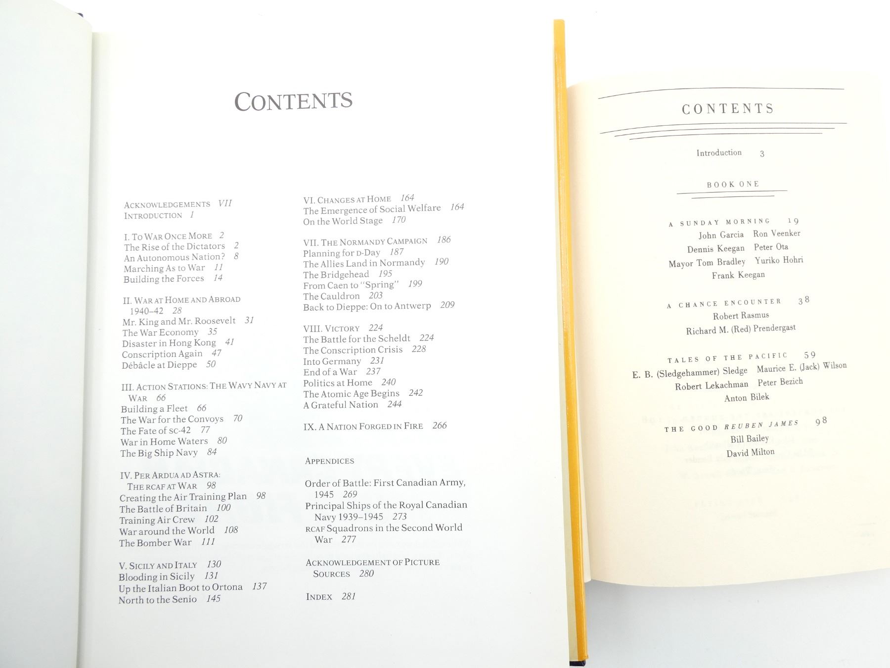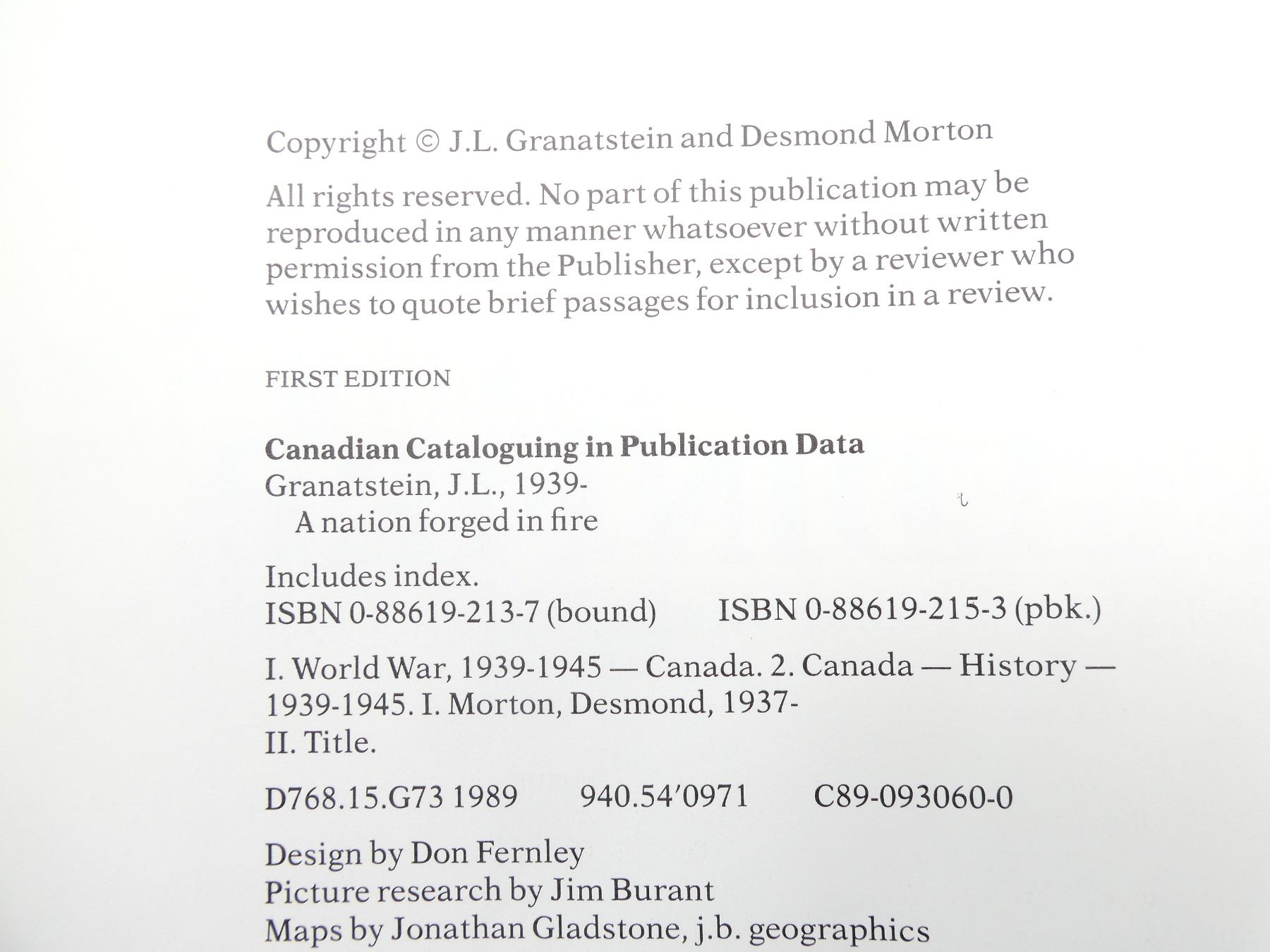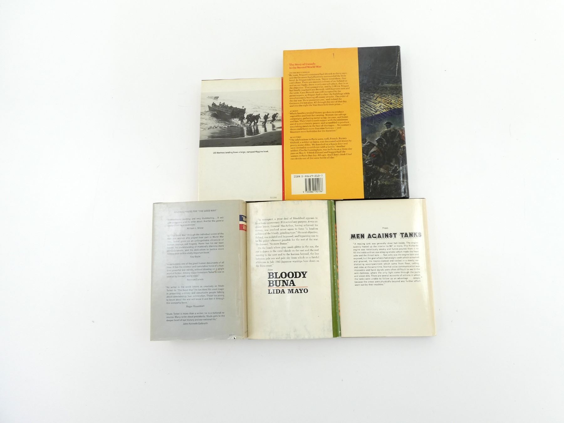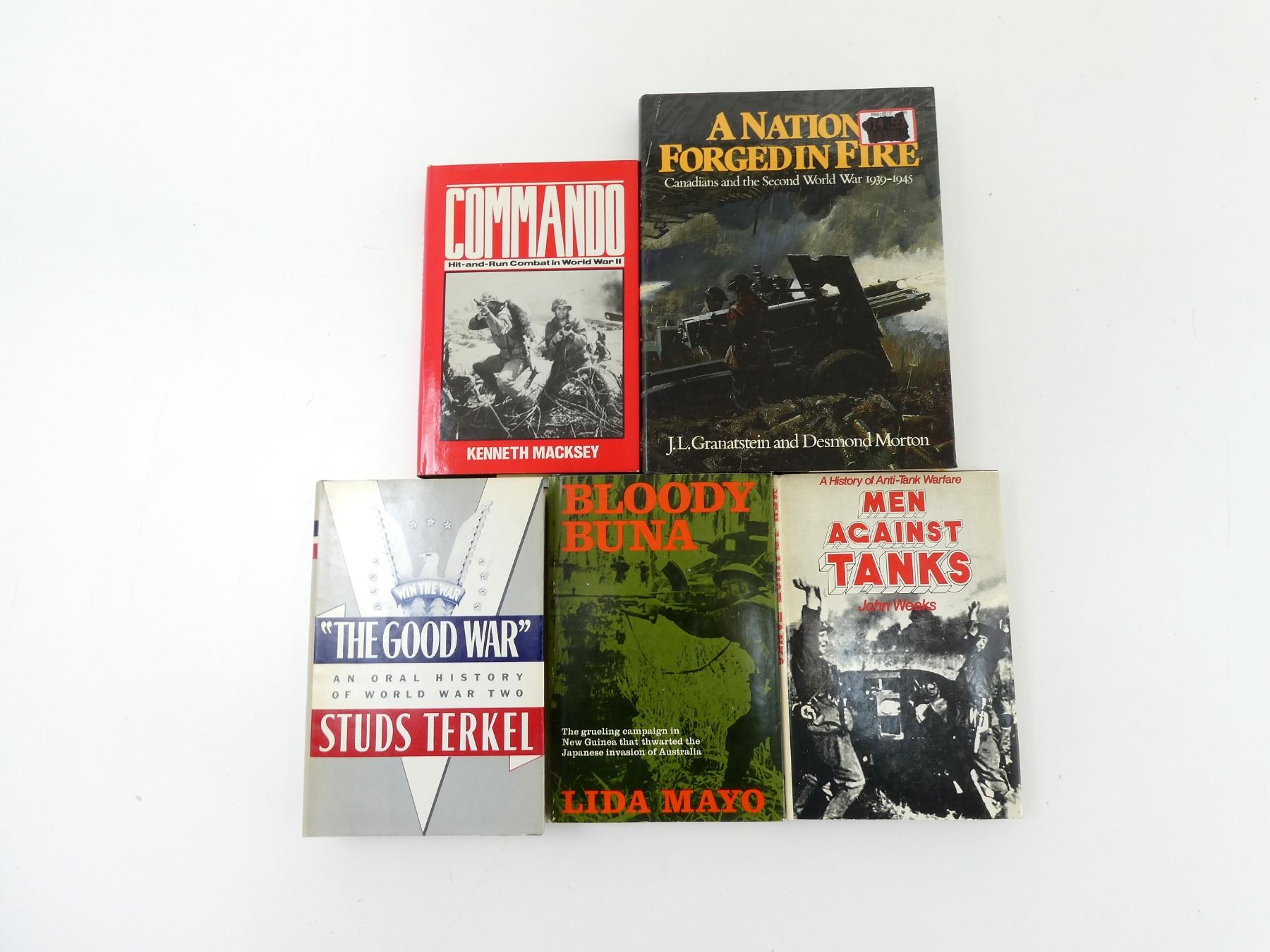 LOT INCLUDES; (1) "A NATION FORGED IN FIRE, CANADIANS AND THE SECOND WORLD WAR 1939-1945" BOOK BY J.L. GRANATSTEIN & DESMOND MORTON, HARD COVER WITH DUST COVER, ISBN: 0-88619-213-7, (1) "THE GOOD WAR, AN ORAL HISTORY OF WORLD WAR TWO" BOOK BY STUDS TERKEL, HARD COVER WITH DUST COVER, COPYRIGHT 1984, (1) "MEN AGAINST TANKS" BOOK BY JOHN WEEKS, HARD COVER WITH DUST COVER, COPYRIGHT 1975, (1) "BLOODY BUNA" BOOK BY LIDA MAYO, HARD COVER WITH DUST COVER, COPYRIGHT 1974 & (1) "COMMANDO, HIT-AND-RUN COMBAT IN WORLD WAR II" BOOK BY KENNETH MACKSEY, HARD COVER WITH DUST COVER, COPYRIGHT 1985. SEE PHOTOS.