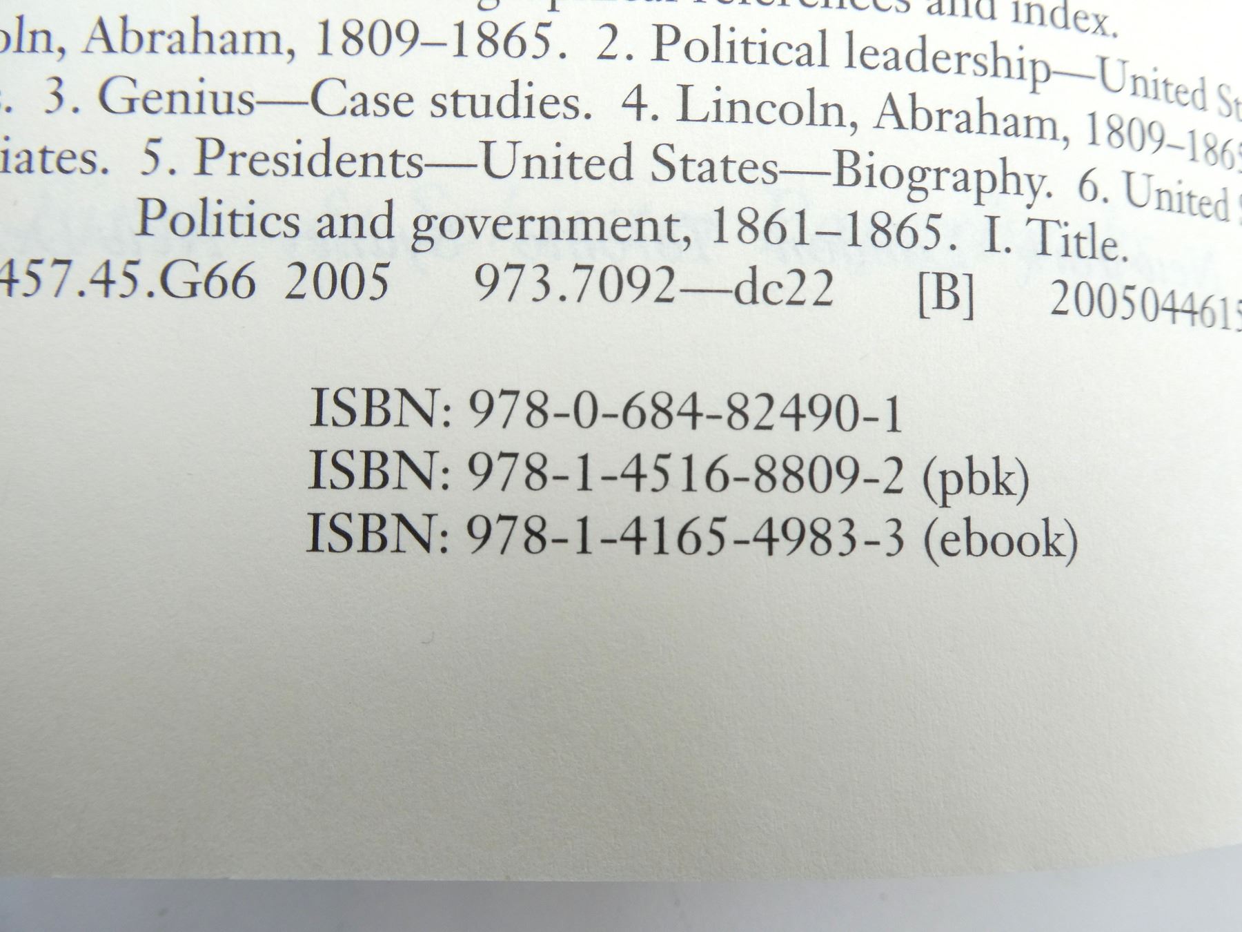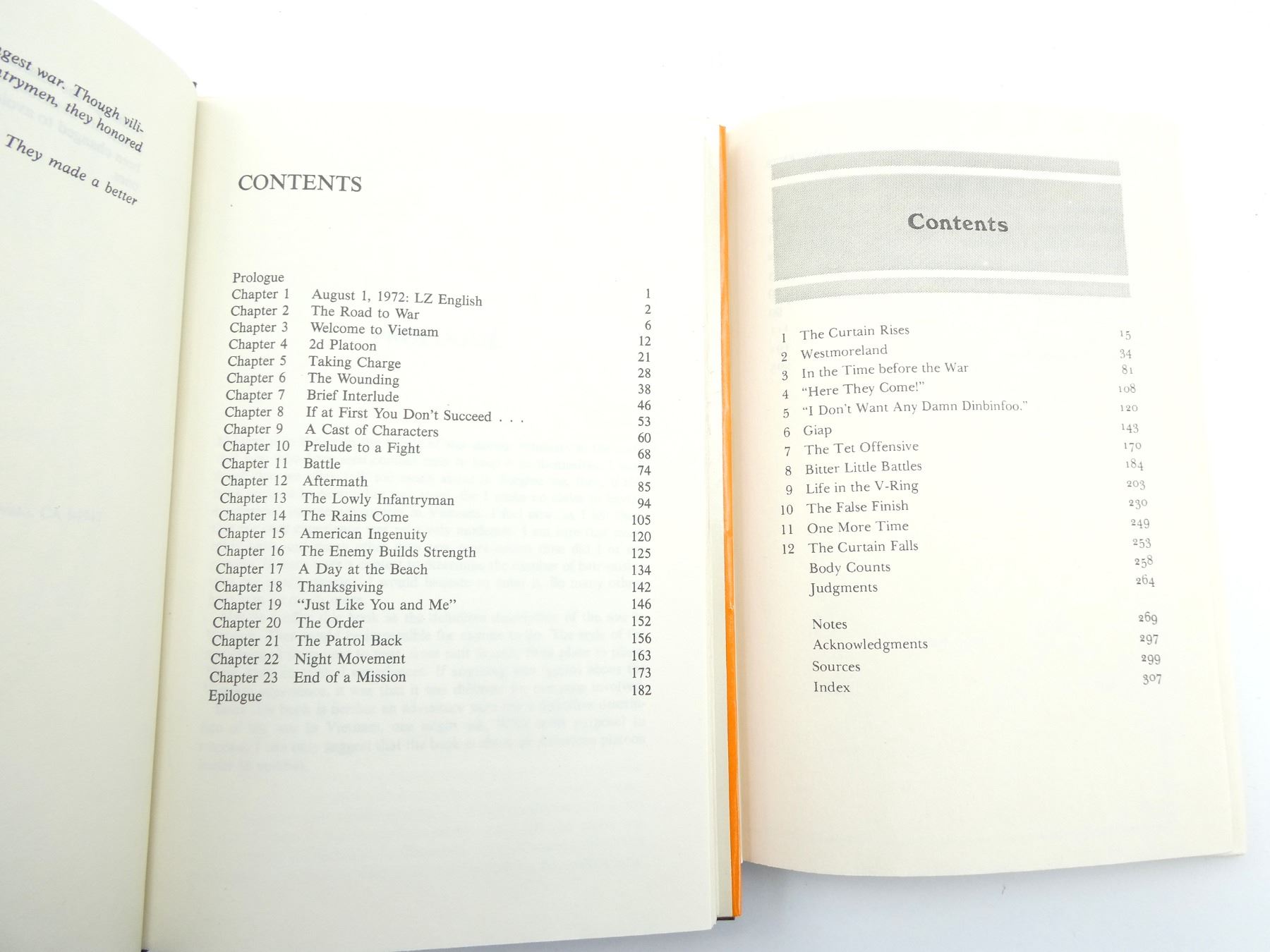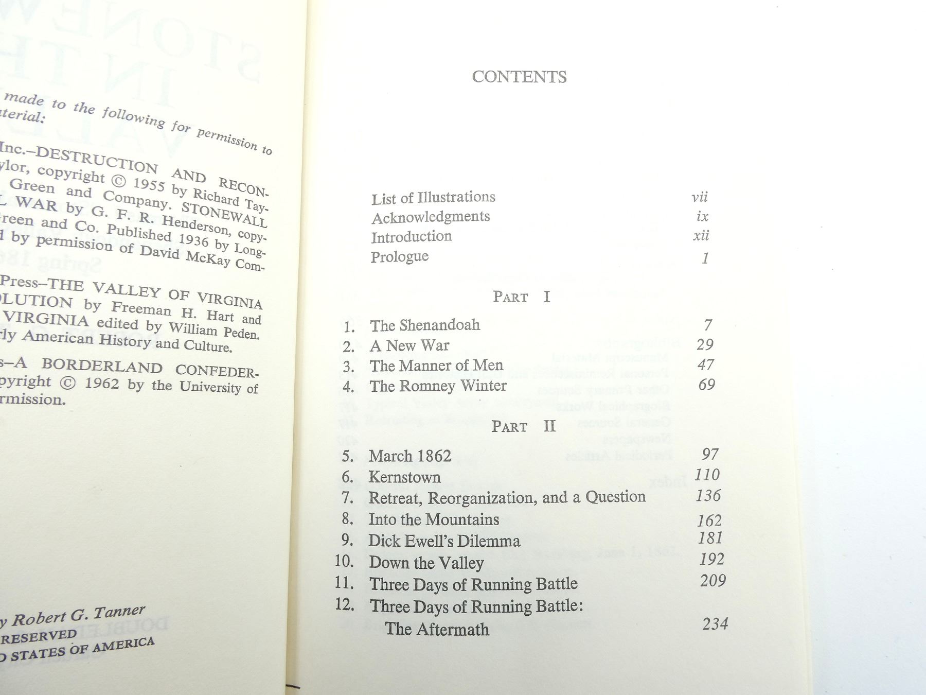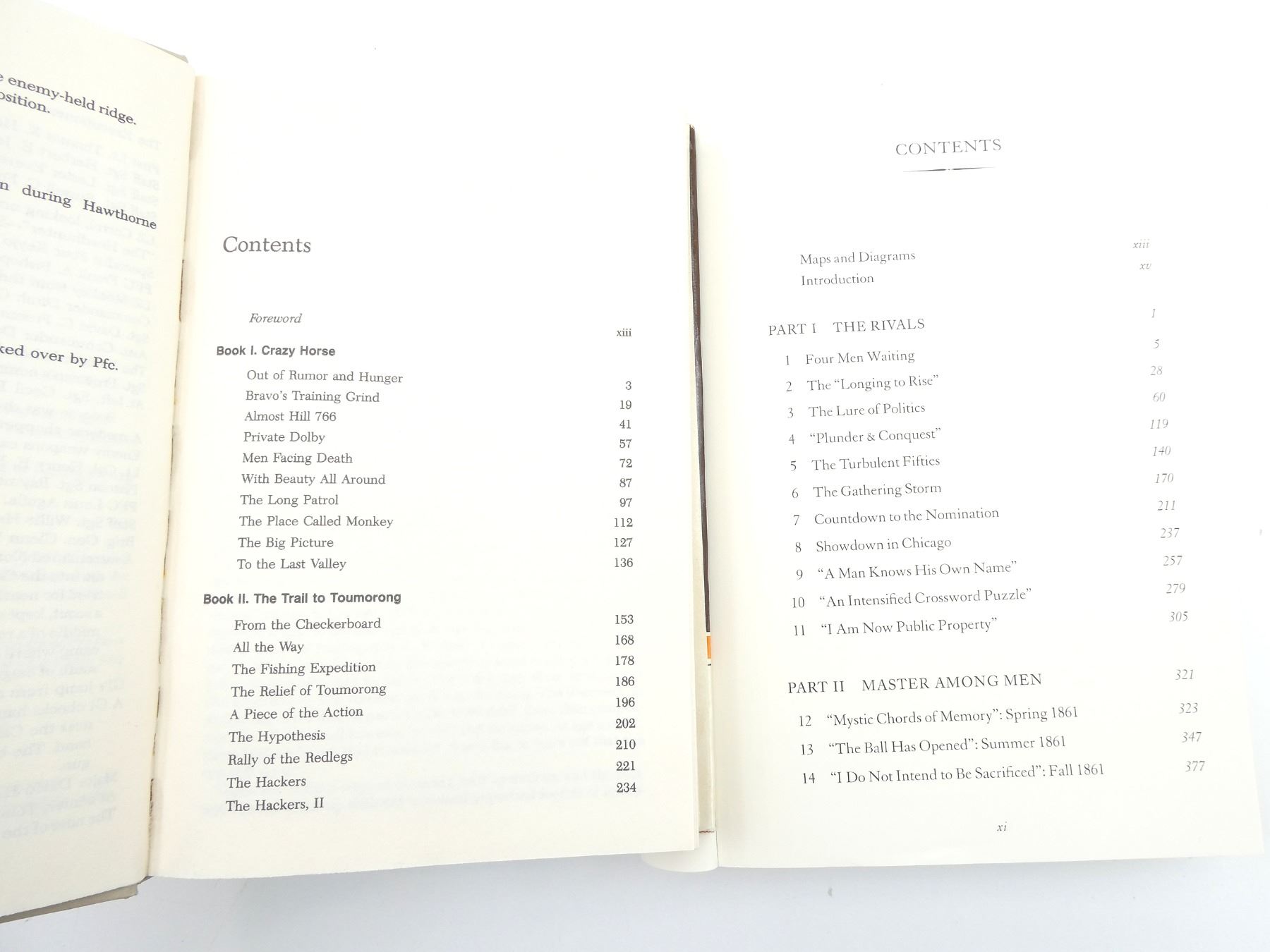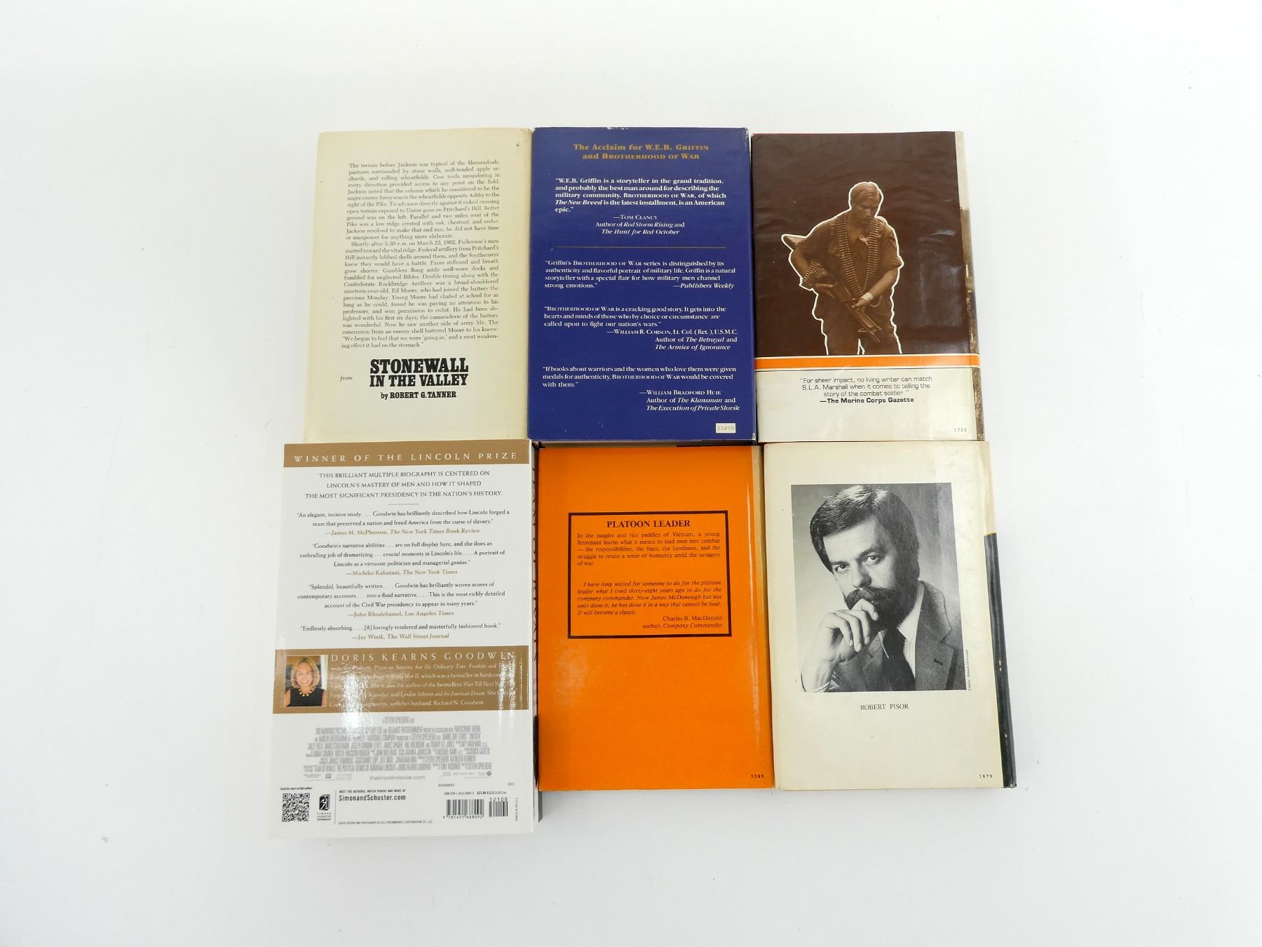 LOT INCLUDES; (1) "TEAM OF RIVALS, THE POLITICAL GENIUS OF ABRAHAM LINCOLN" BOOK BY DORIS KEARNS GOODWIN, SOFT COVER, ISBN: 978-1-4516-8809-2, (1) "STONEWALL IN THE VALLEY, THOMAS J.'STONEWALL' JACKSON'S SHENANDOAH VALLEY CAMPAIGN, SPRING 1862" BOOK BY ROBERT G. TANNER, HARD COVER WITH DUST COVER, COPYRIGHT 1976, (1) "THE NEW BREED, CONTINUING THE SAGA OF BROTHERHOOD OF WAR" BOOK BY W.E.B. GRIFFIN, HARD COVER WITH DUST COVER, COPYRIGHT 1987, (1) "THE END OF THE LINE, THE SIEGE OF KHE SANH" BOOK BY ROBERT PISOR, HARD COVER WITH DUST COVER, COPYRIGHT 1982, (1) "PLATOON LEADER" BOOK BY JAMES MCDONOUGH, HARD COVER WITH DUST COVER, COPYRIGHT 1985 & (1) "BATTLES IN THE MONSOON" BOOK BY S.L.A. MARSHALL, HARD COVER WITH DUST COVER, COPYRIGHT 1967. SEE PHOTOS.