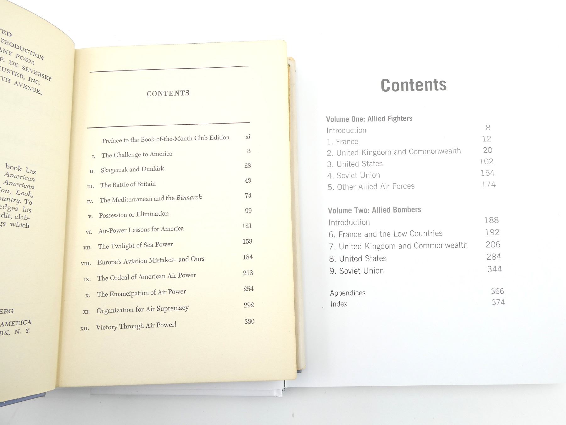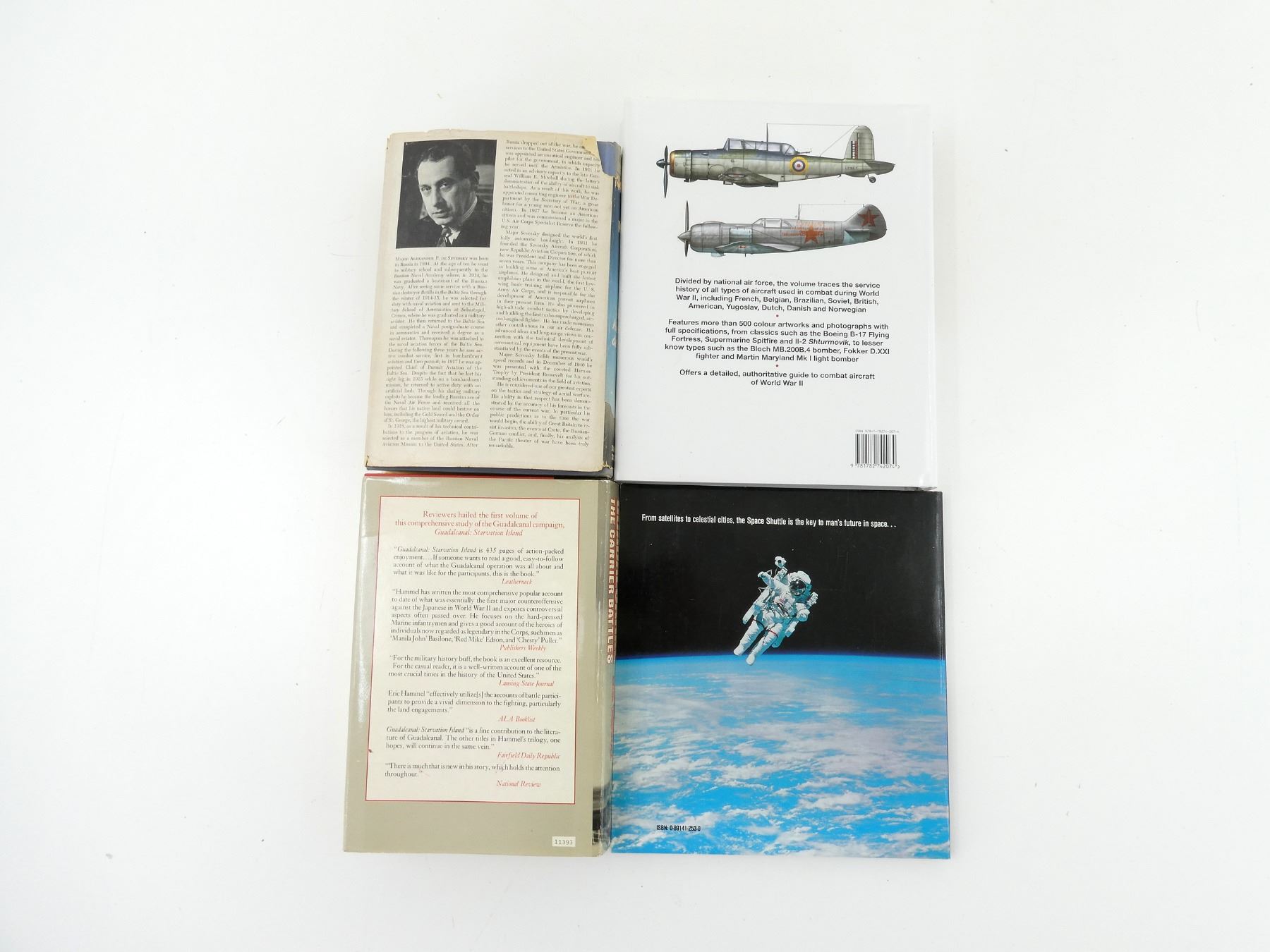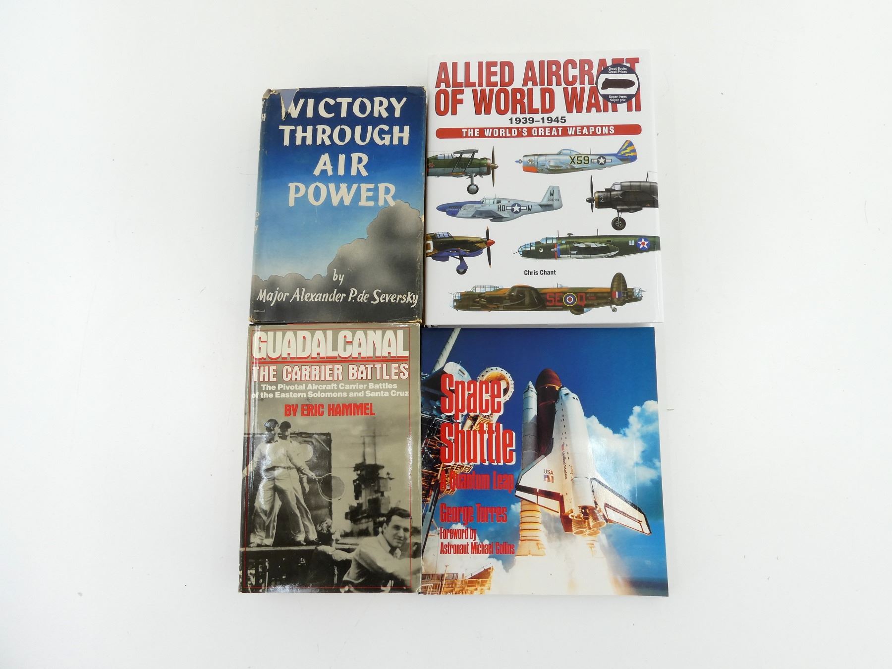LOT INCLUDES; (1) "ALLIED AIRCRAFT OF WORLD WAR II 1939-1945" BOOK BY CHRIS CHANT, HARD COVER WITH DUST COVER, ISBN: 978-1-78274-207-4, (1) "SPACE SHUTTLE, A QUANTUM LEAP" BOOK BY GEORGE TORRES, SOFT COVER, ISBN: 0-89141-253-0, (1) "VICTORY THROUGH AIR POWER" BOOK BY MAJOR ALEXANDER P. DE SEVERSKY, HARD COVER WITH DUST COVER, 1942 & (1) "GUADALCANAL, THE CARRIER BATTLES" BOOK BY ERIC HAMMEL, HARD COVER WITH DUST COVER, COPYRIGHT 1987. SEE PHOTOS.