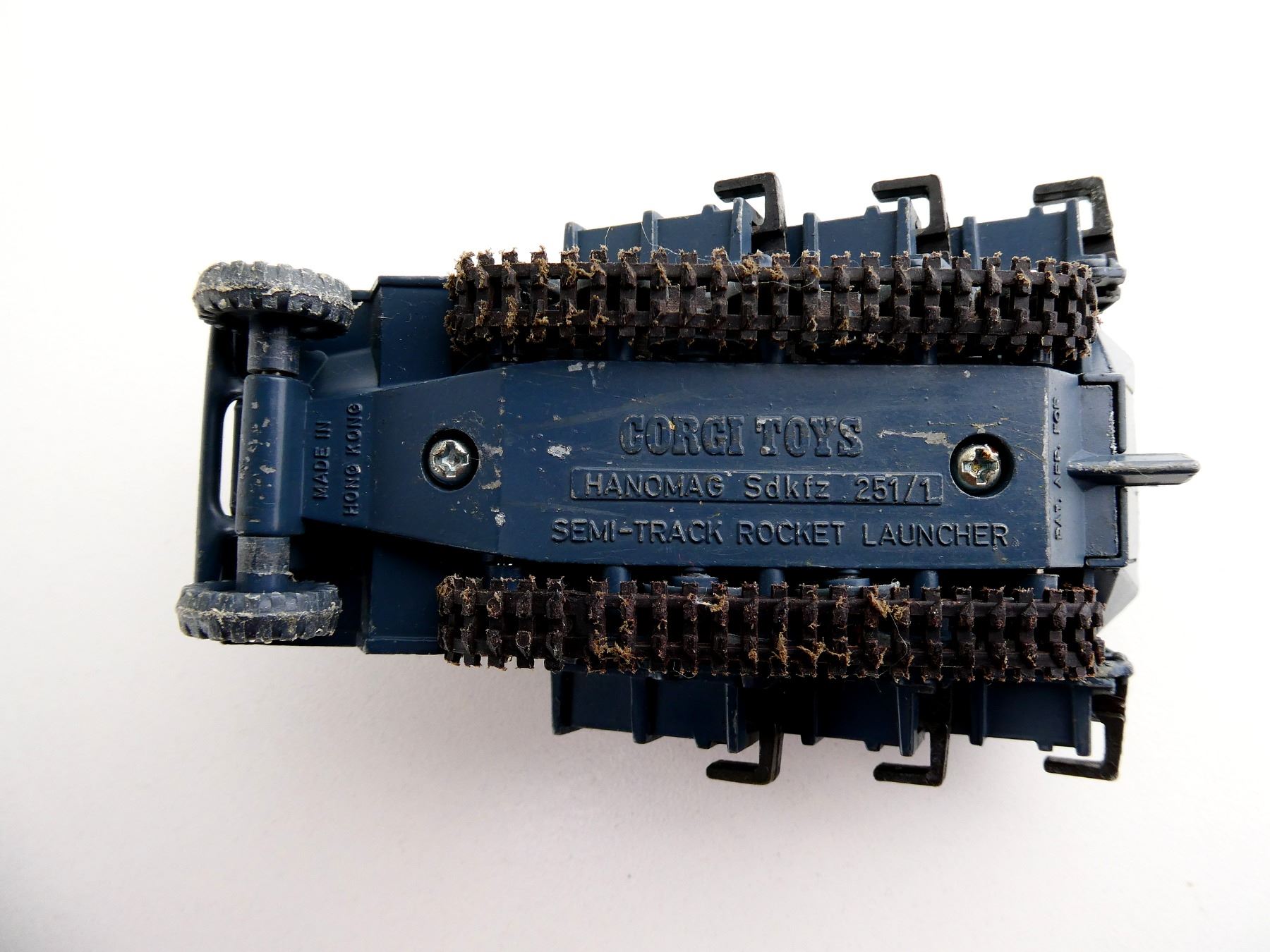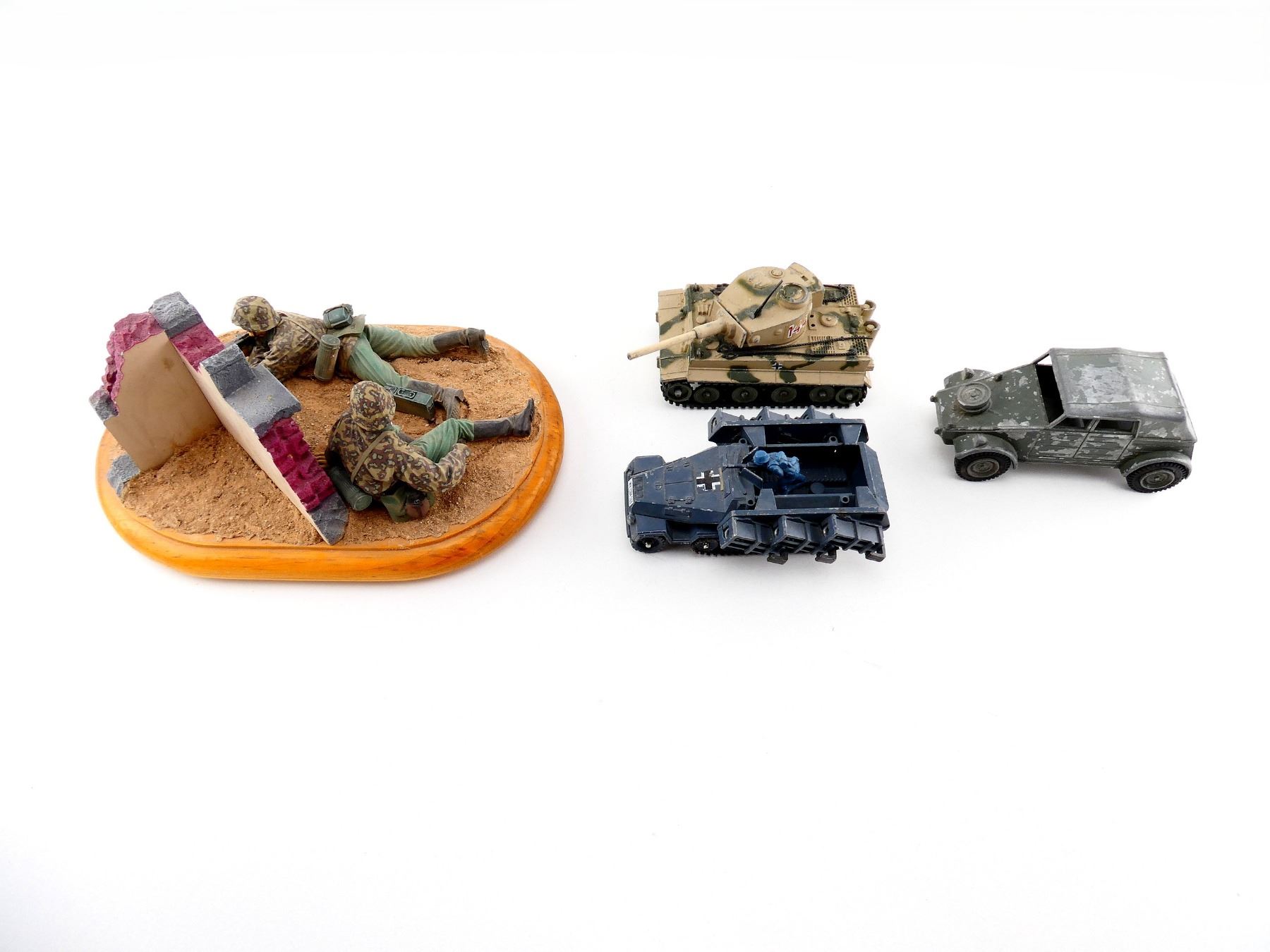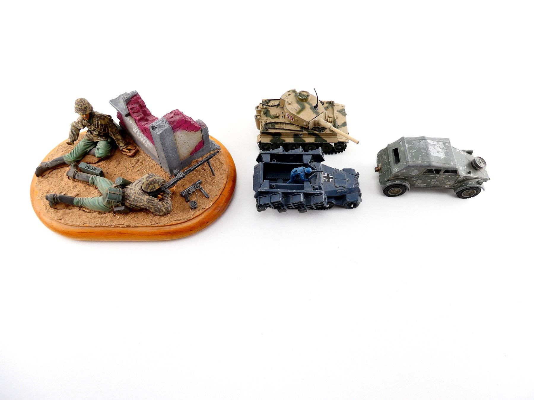 LOT INCLUDES; (1) GERMAN SOLDIER FIGURES AFFIXED TO WOODEN BASE, DEPICTING A BATTLE SCENE, NO VISIBLE PLAQUE / MARKINGS, VARIOUS MATERIALS / COLOURS & (3) GERMAN MILITARY MODEL VEHICLES, METAL AND/OR DIE CAST CONSTRUCTION, ONE TANK, ONE VOLKSWAGEN, ONE SEMI-TRACK ROCKET LAUNCHER, ONE MARKED: "CORGI TOYS, TIGER 1" ETC., ONE MARKED: "CORGI TOYS, HANOMAG SDKFZ 251/1, SEMI-TRACK ROCKET LAUNCHER" ETC., LAST MARKED: "DINKY TOYS, VOLKSWAGEN, KDF, MECCANO LTD" ETC. SEE PHOTOS.