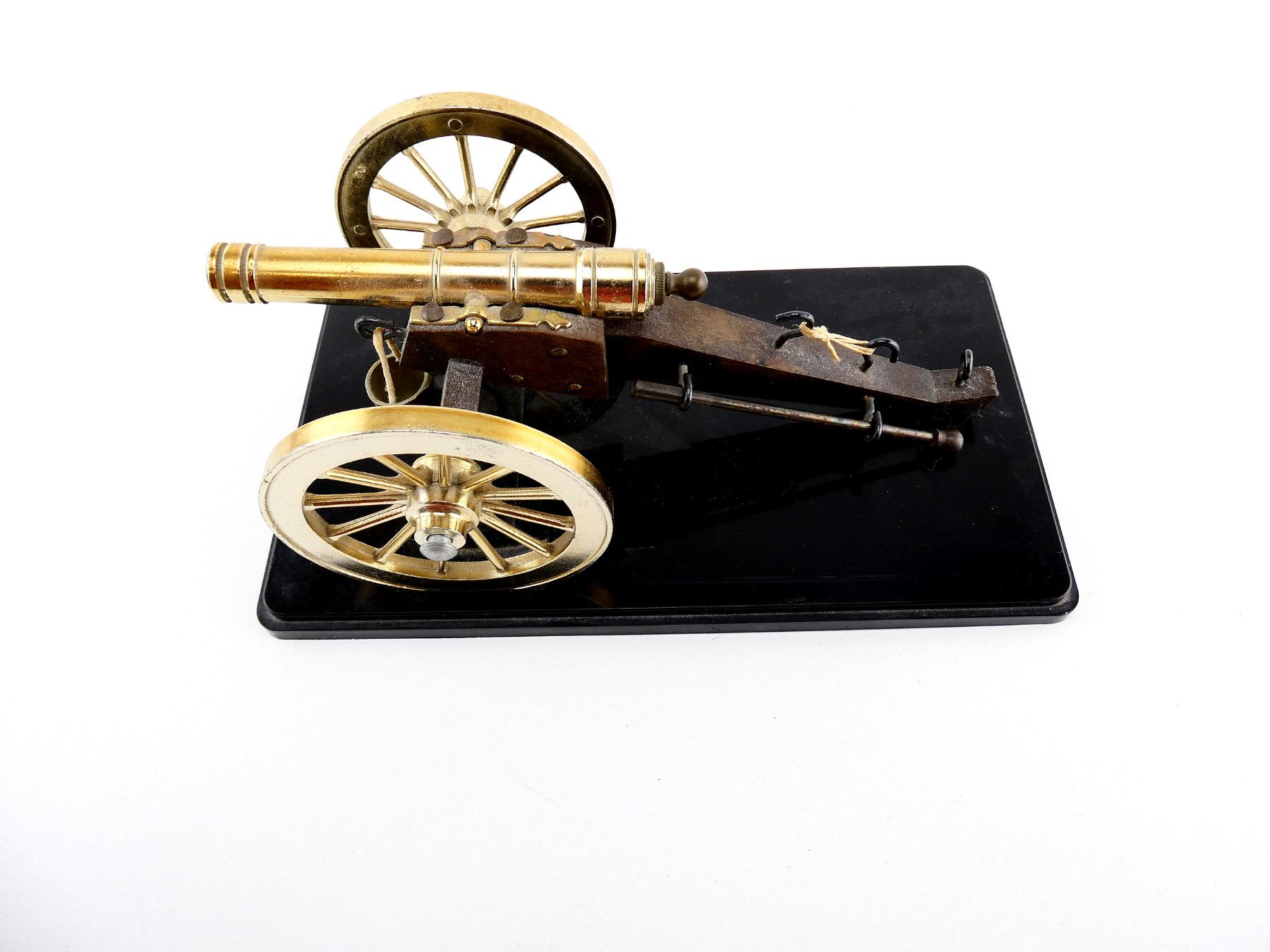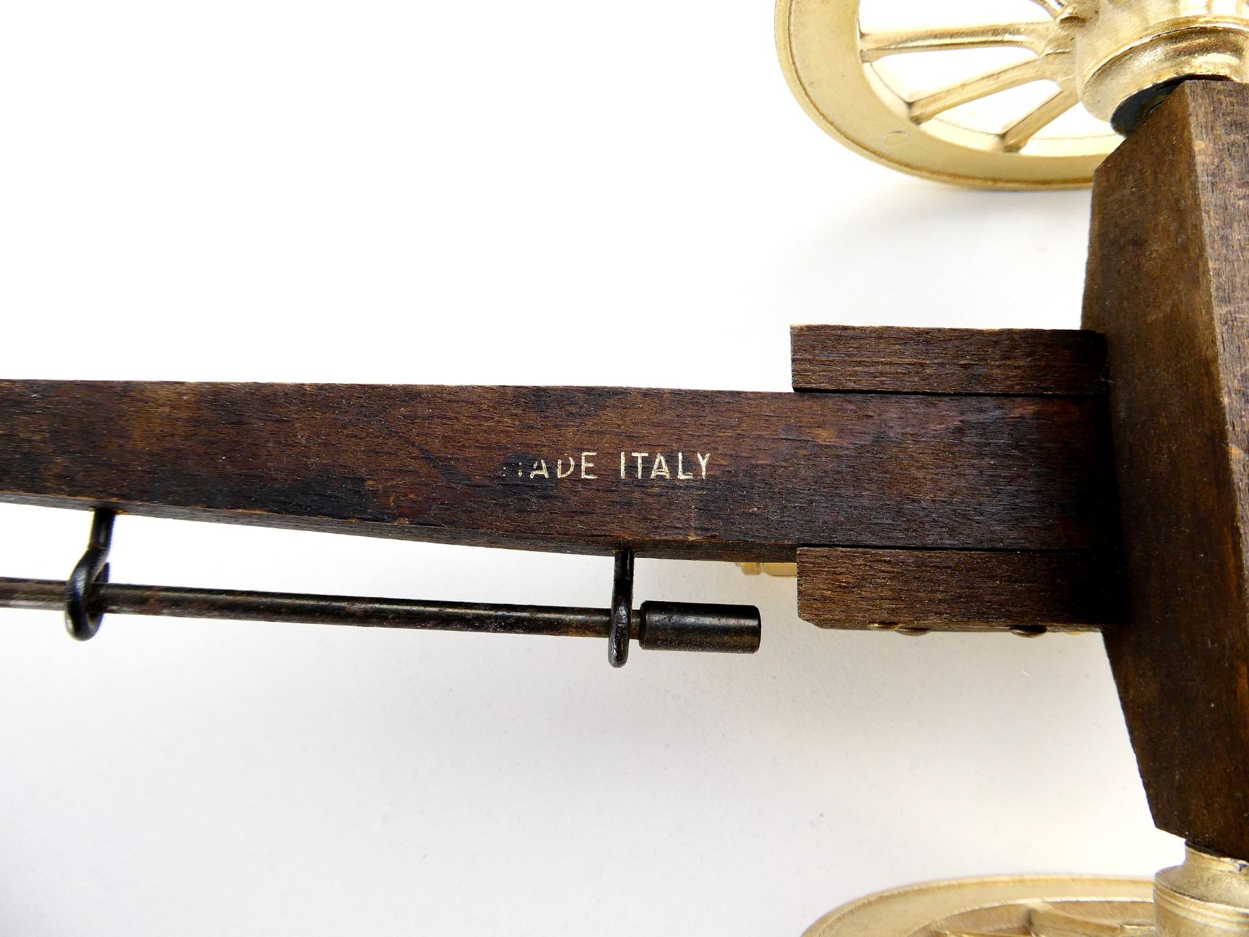 (1) WOOD / BRASS / METAL CONSTRUCTED CANNON, CANNON ON HINGE, WHEELS TURN, ONE WHEEL COMES OFF EASILY, BLACK PLASTIC BASE, NOT ATTACHED JUST SITS ON BASE IN GROOVES, BOTTOM MARKED: "MADE ITALY", WITH BASE APPROX. 8 1/8" X 4 5/8" X 3 3/8". SEE PHOTOS.