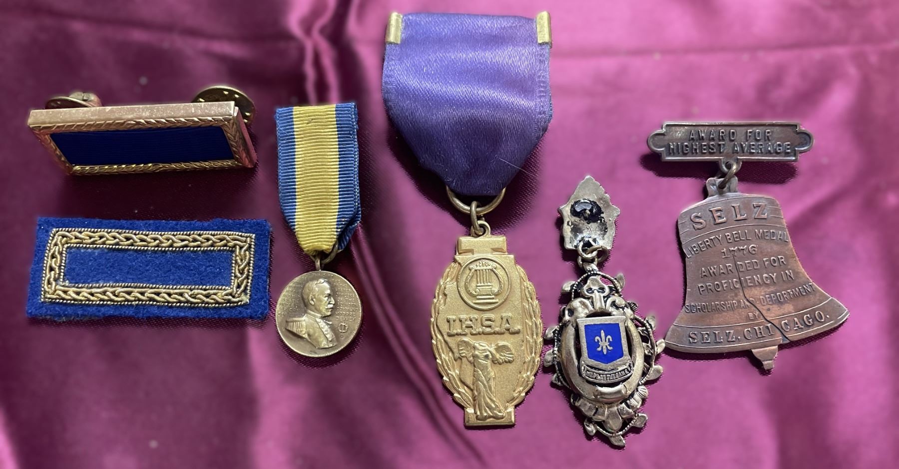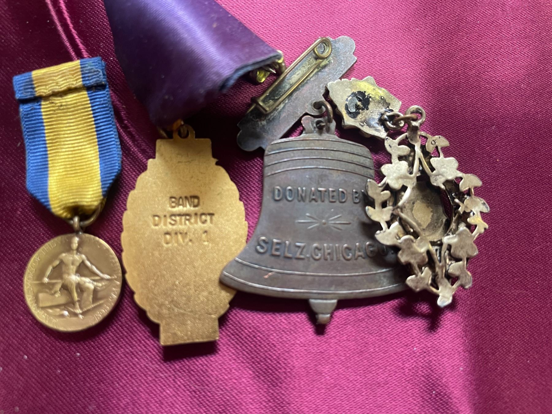 Blue and Gold Ribbon Medal (Second from Left): This medal, featuring a portrait on the medallion and a blue and yellow/gold ribbon, is consistent with school or regional music festival awards, such as those from Indiana or Illinois music programs from the mid-20th century