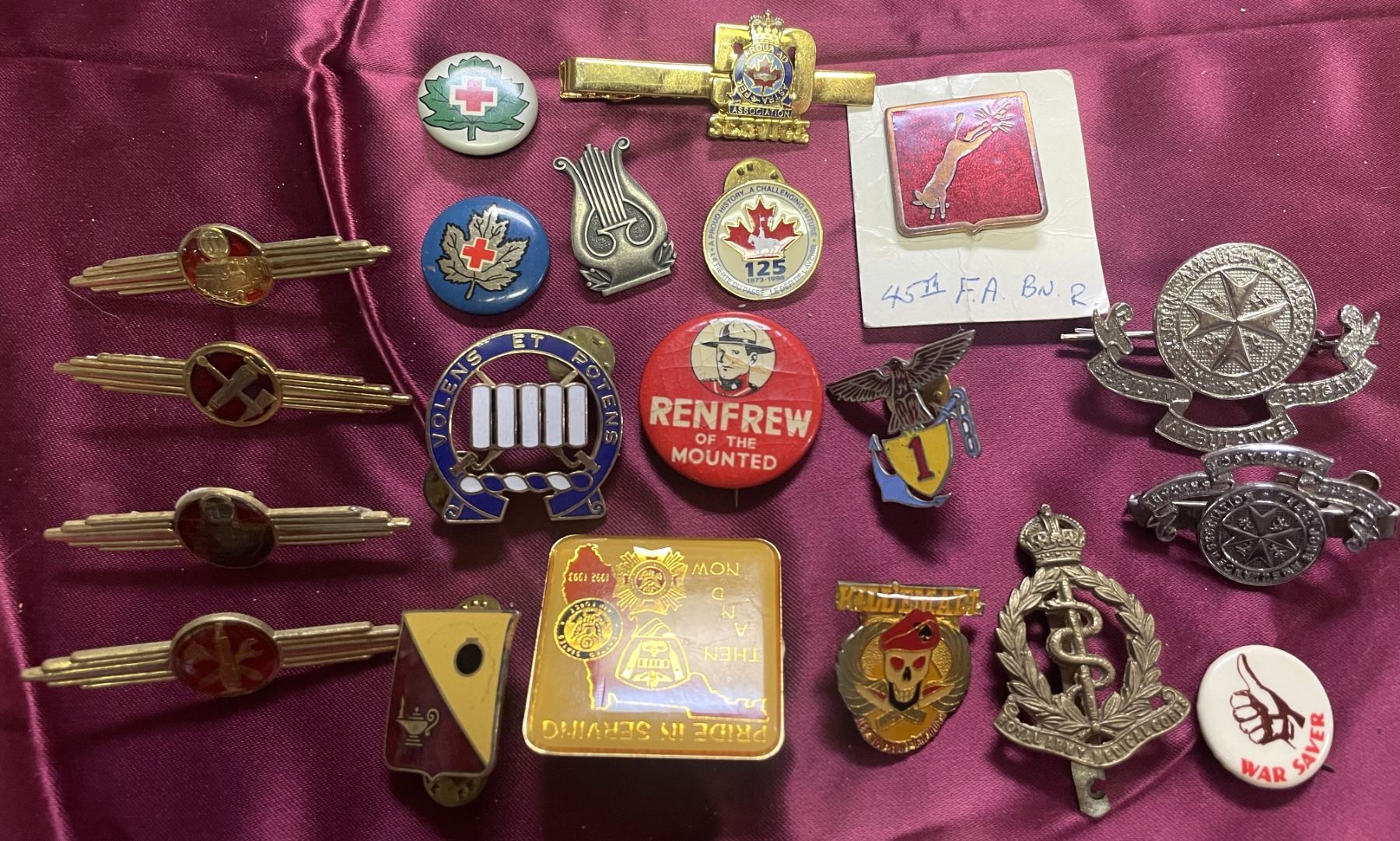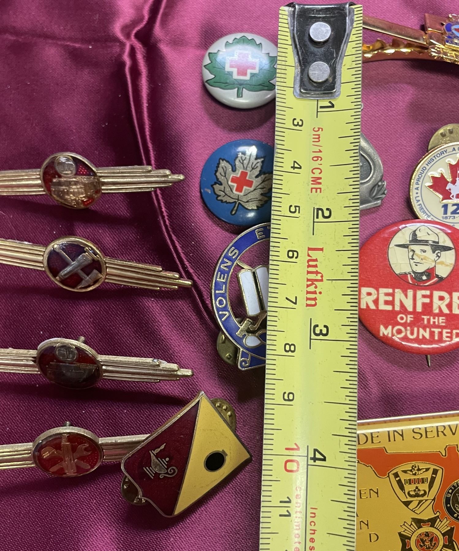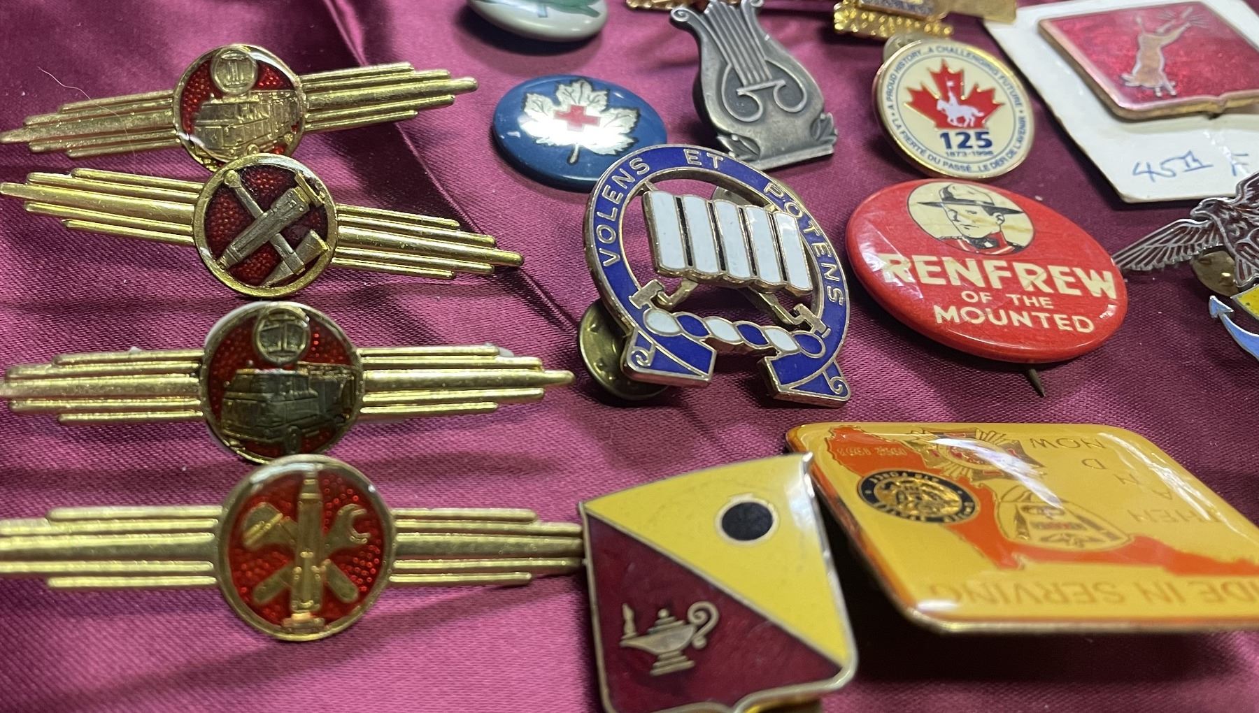 vintage lapel pins and badges includes items related to military service, specifically featuring Royal Canadian Legion badges and potentially era-specific insignia
