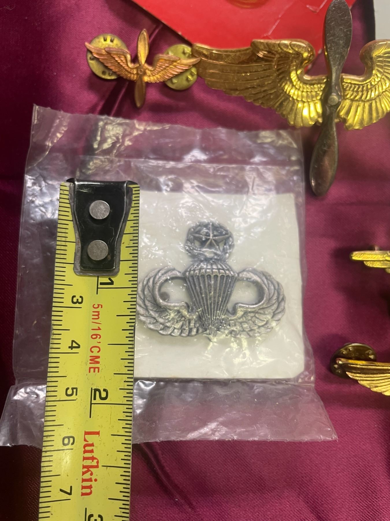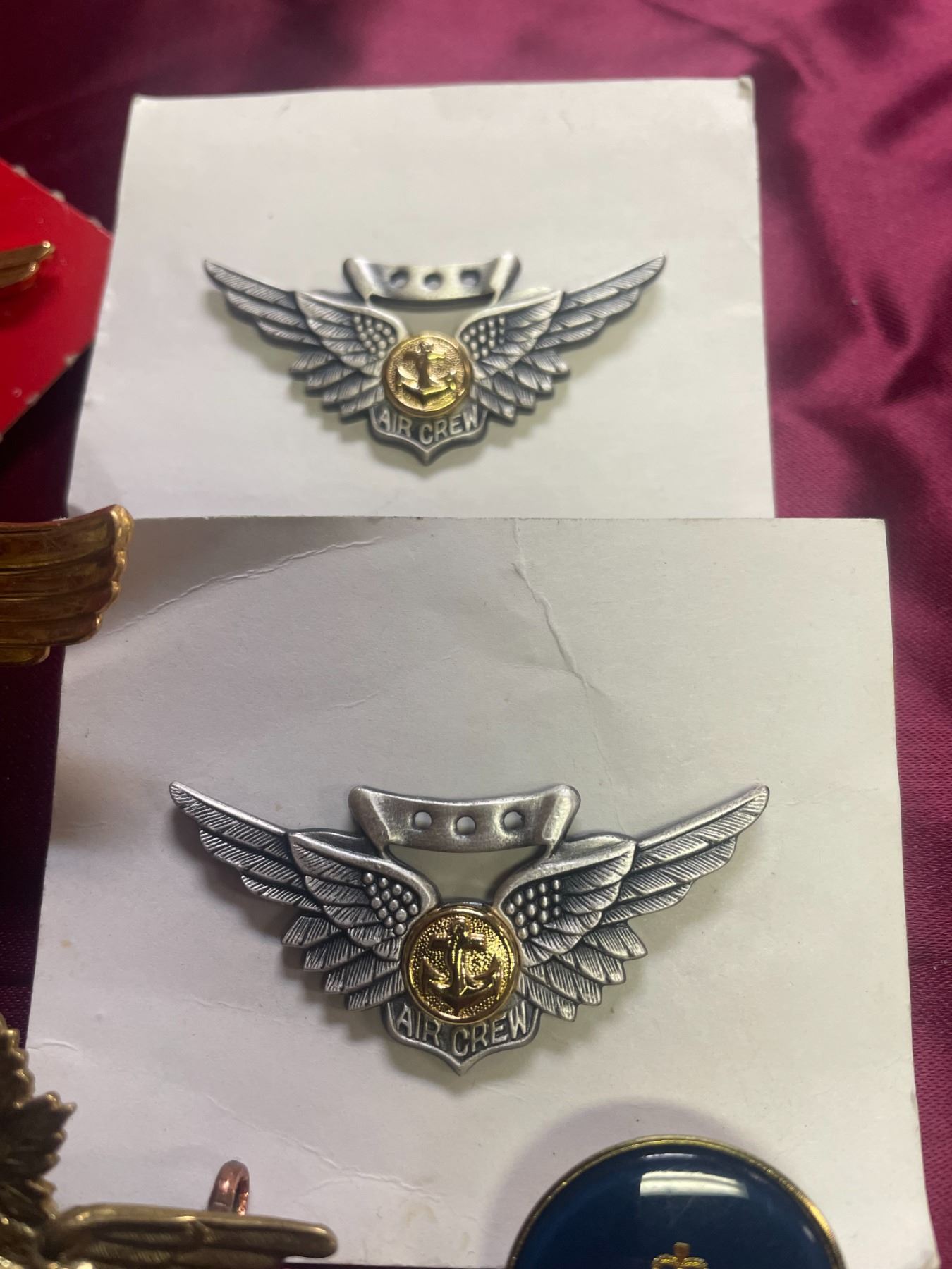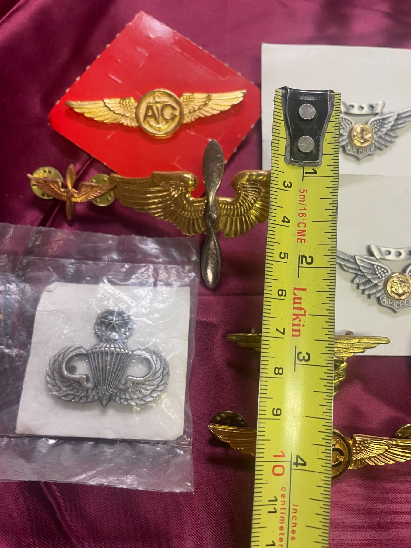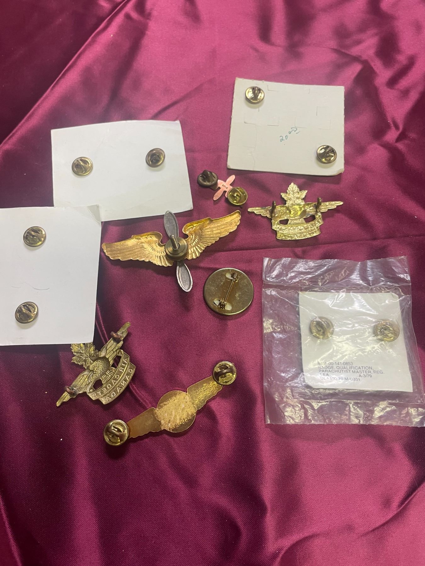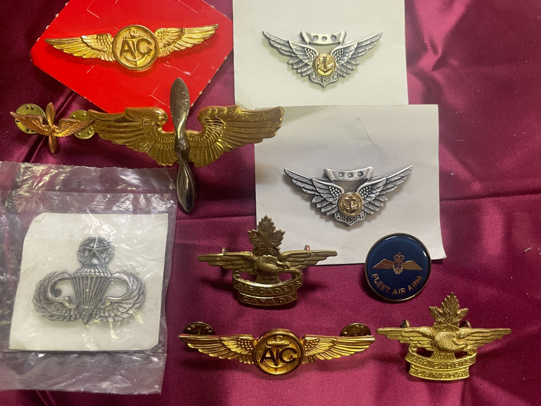 Aviation Wings: Also included are metal pilot or aircrew wings, often featuring propellor and eagle designs to indicate flight qualifications.