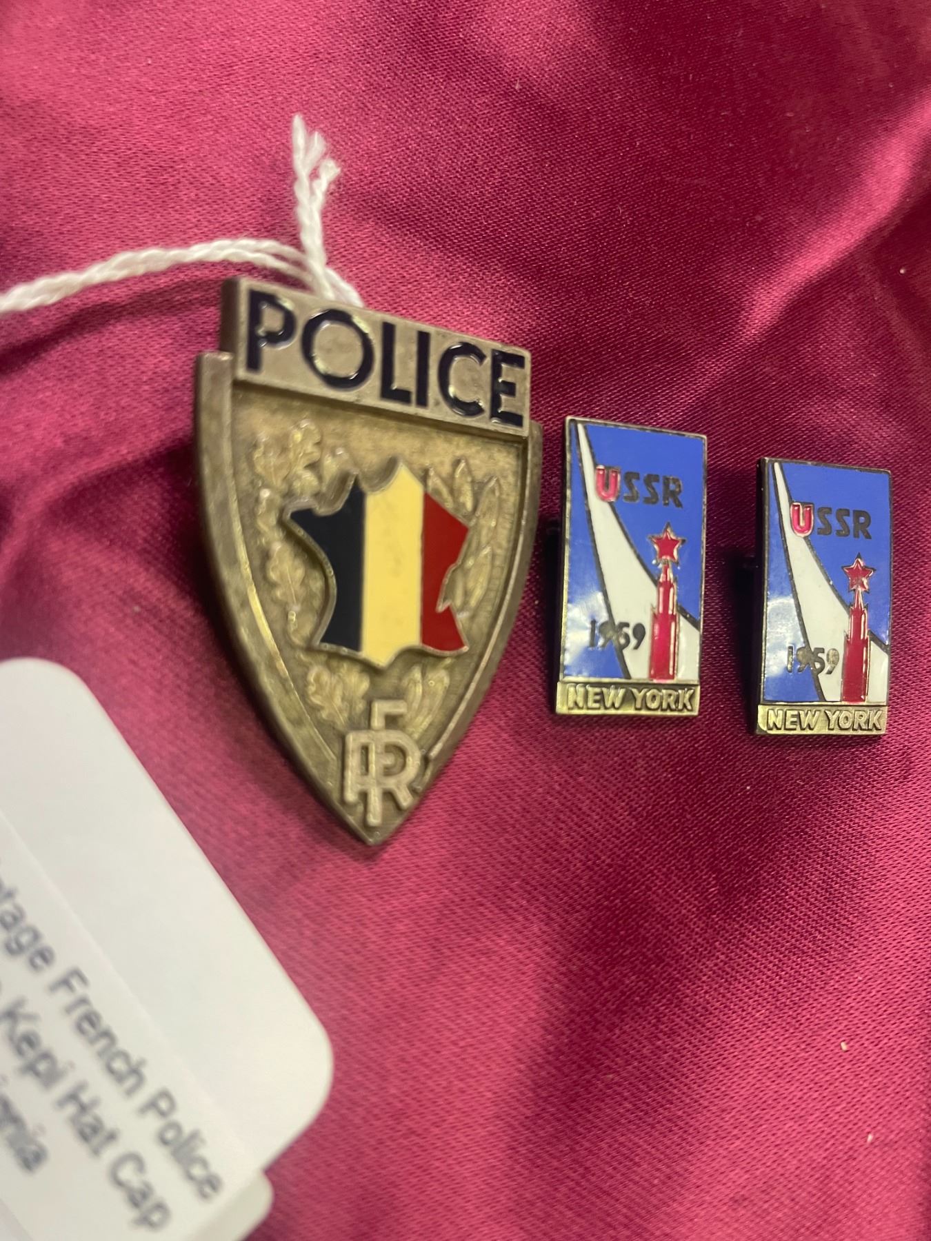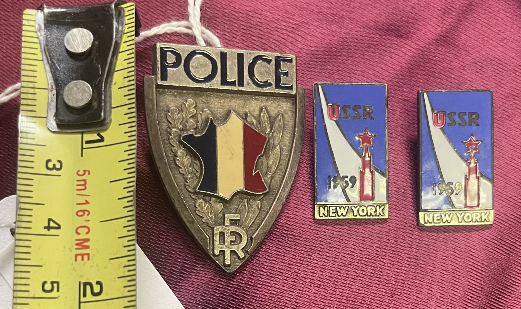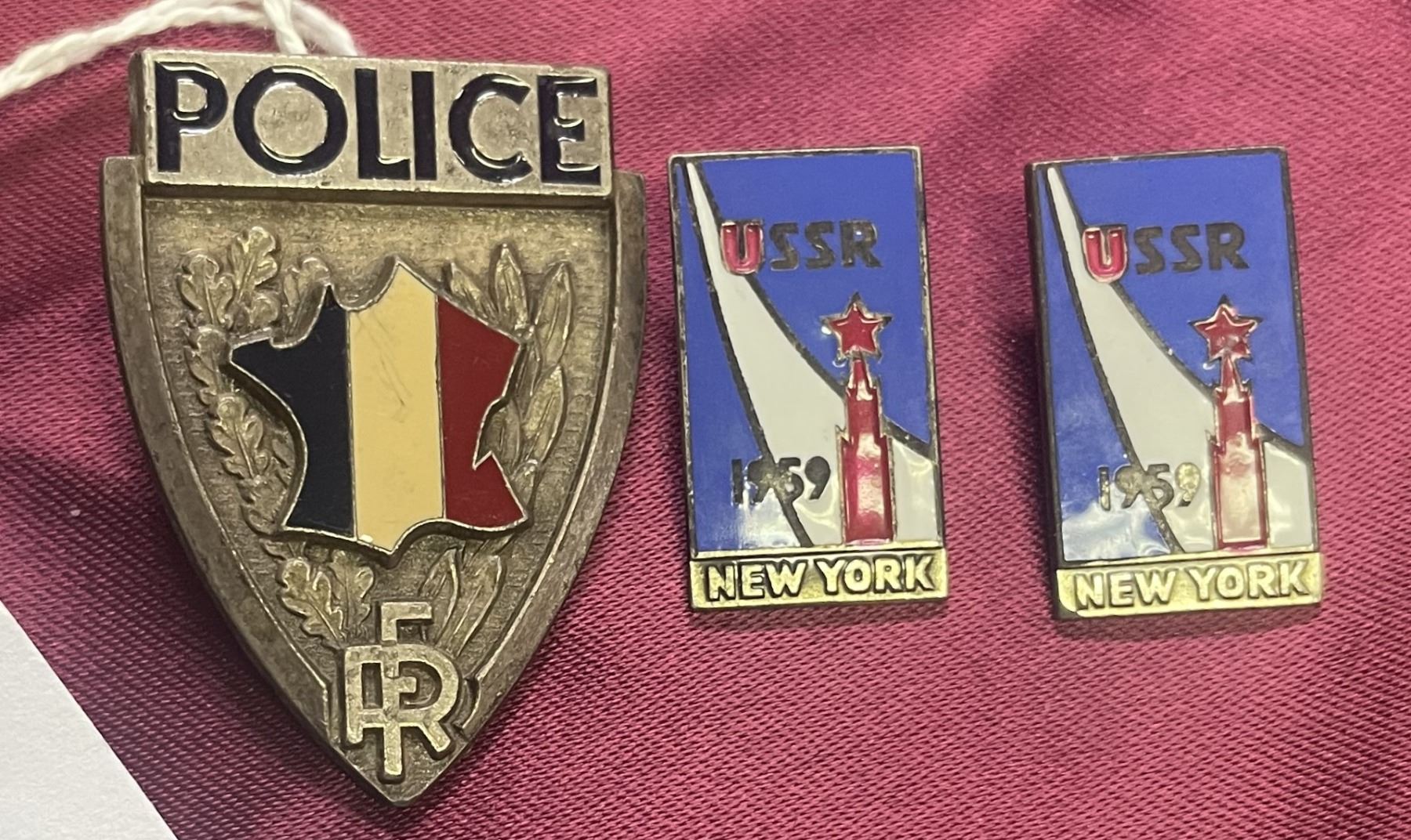 Lot 309 vintage French National Police (Police nationale) badge, 1959 USSR Cultural Exhibit Pins