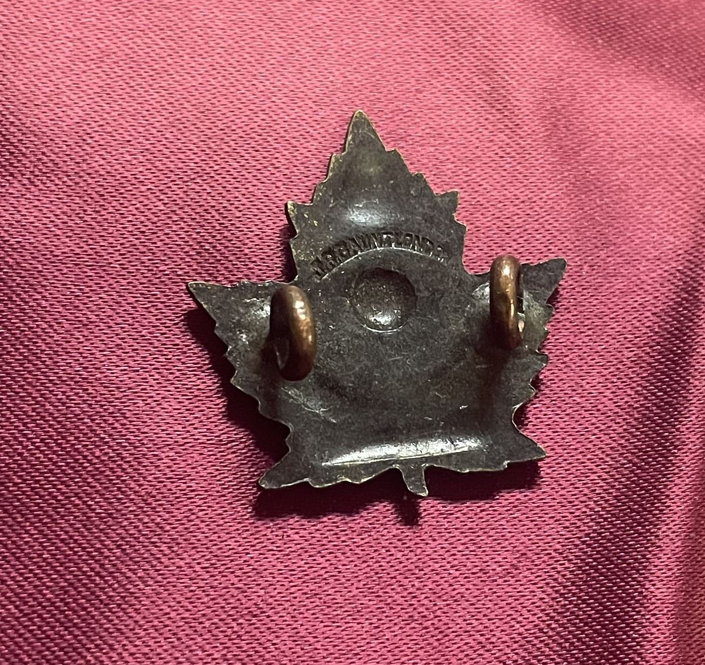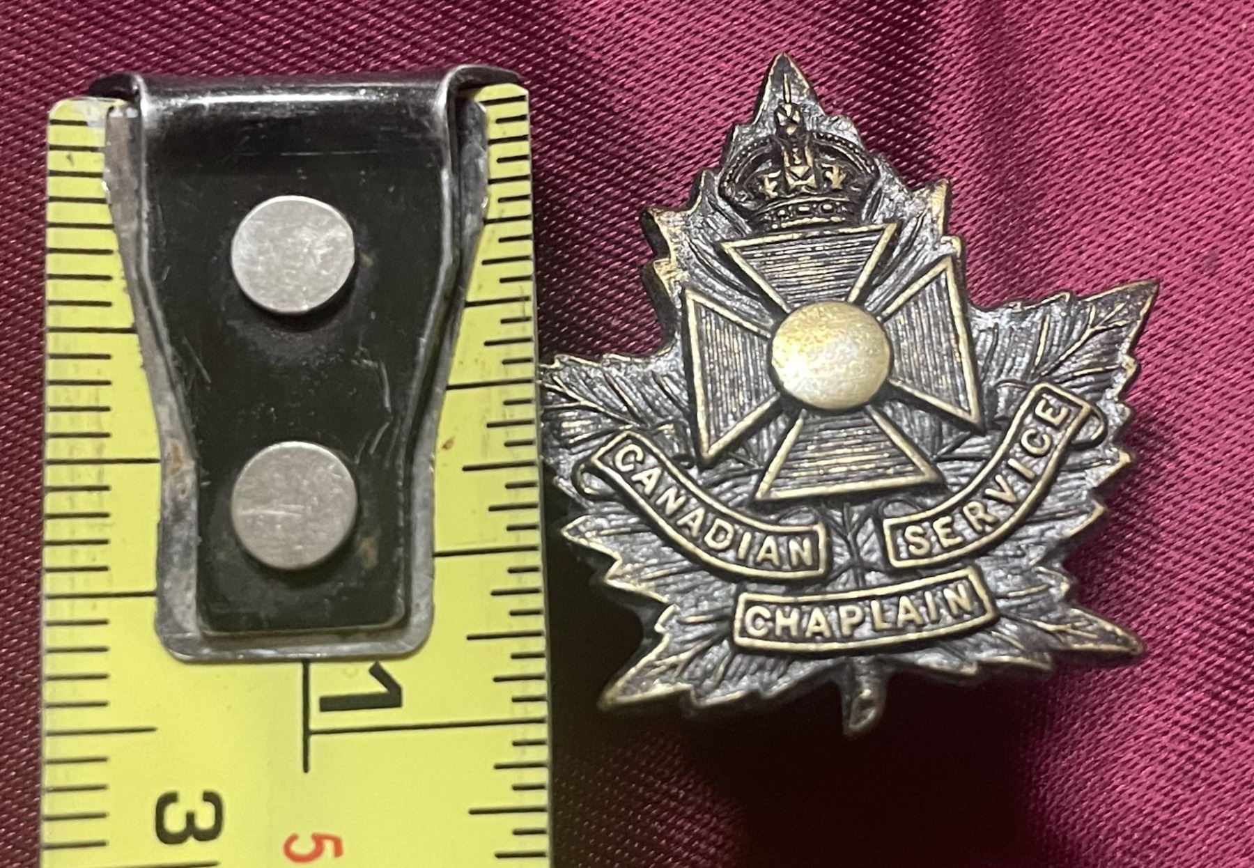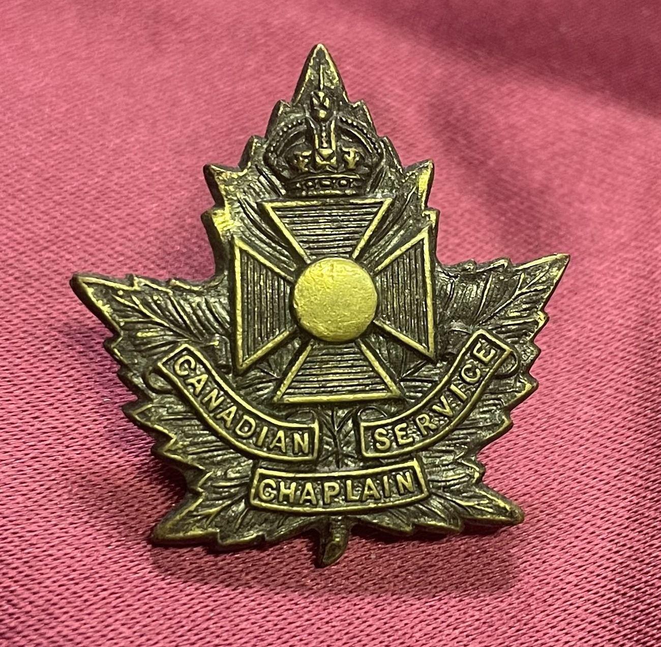 Canadian Chaplain Service cap badge, likely dating from the WWI or early post-WWI era, featuring a distinctive maple leaf design with a cross and crown emblem.