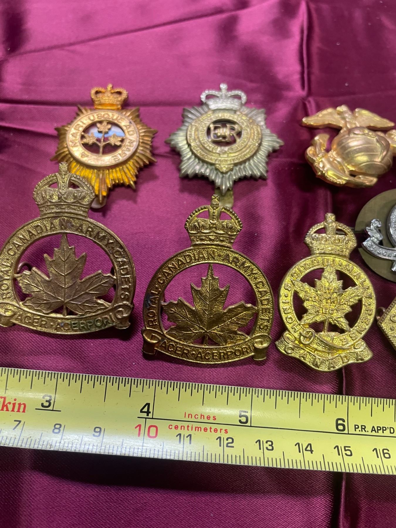 Royal Canadian Army Cadets (RCAC): These brass badges typically feature a maple leaf and the motto "Acer Acerpori".