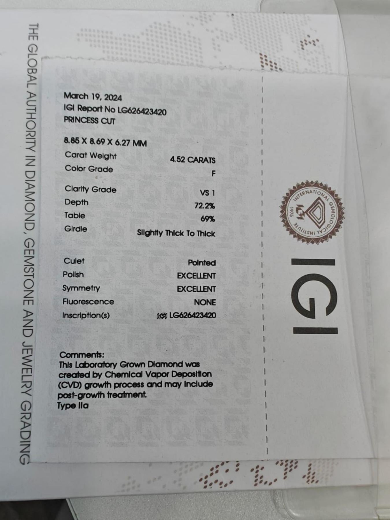 Lot 8751 Gold & White Princess Diamond 4.52 Cts - Ring IGI Certified