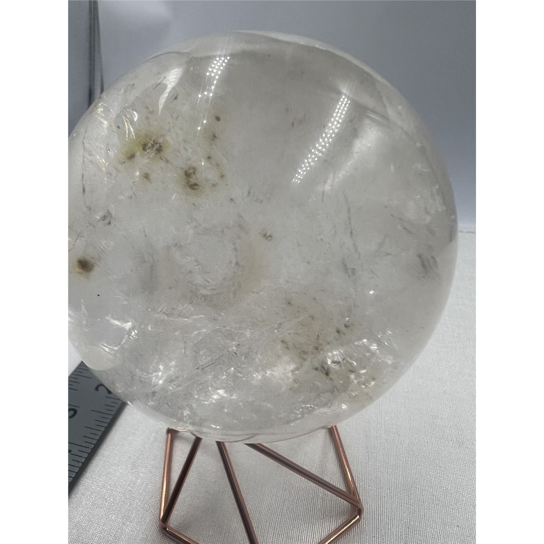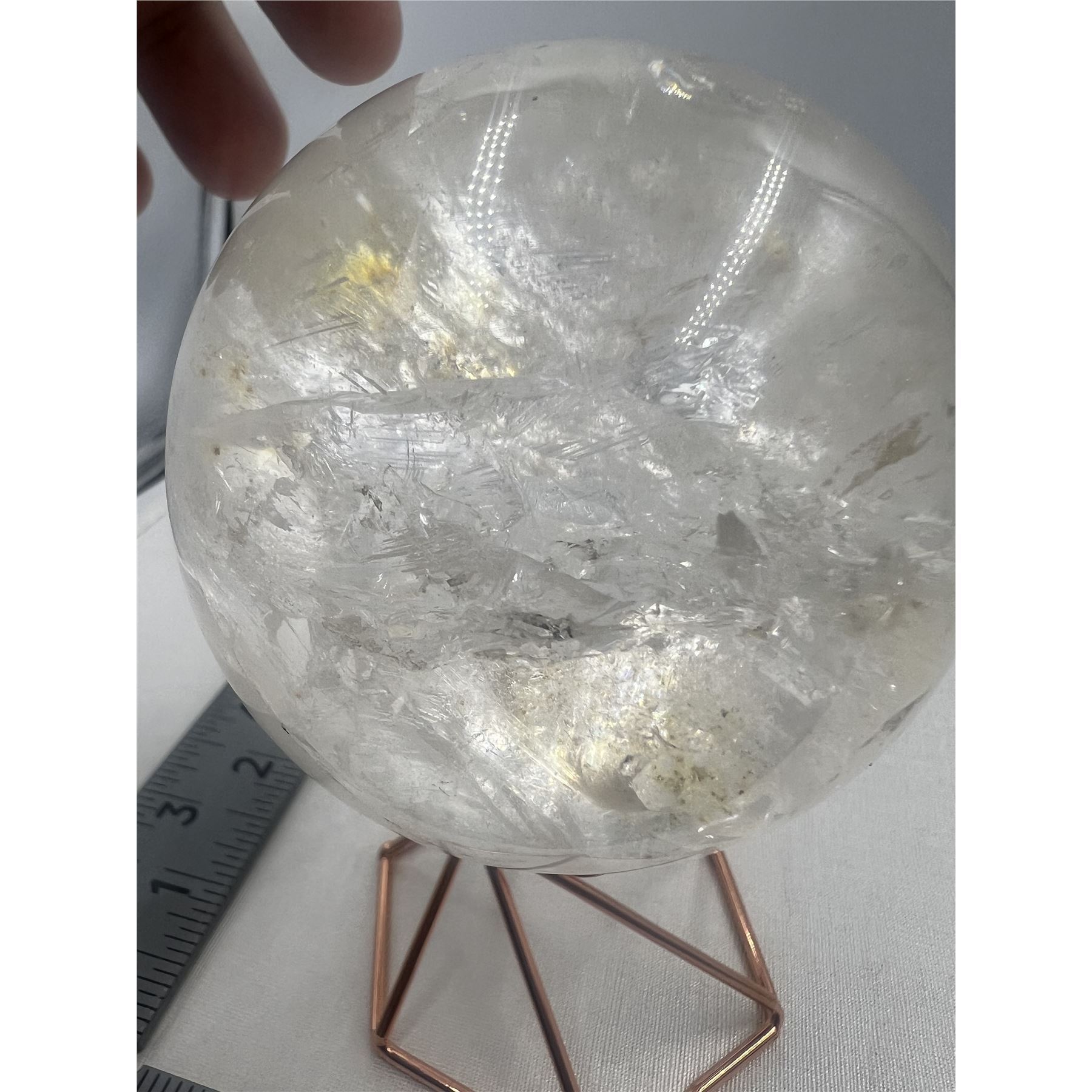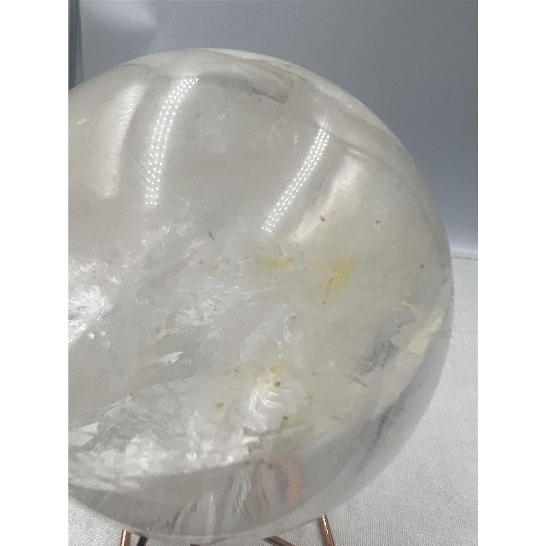 75 MM LARGE CLEAR QUARTZ SPHERE WITH YELLOW INCULSION.
