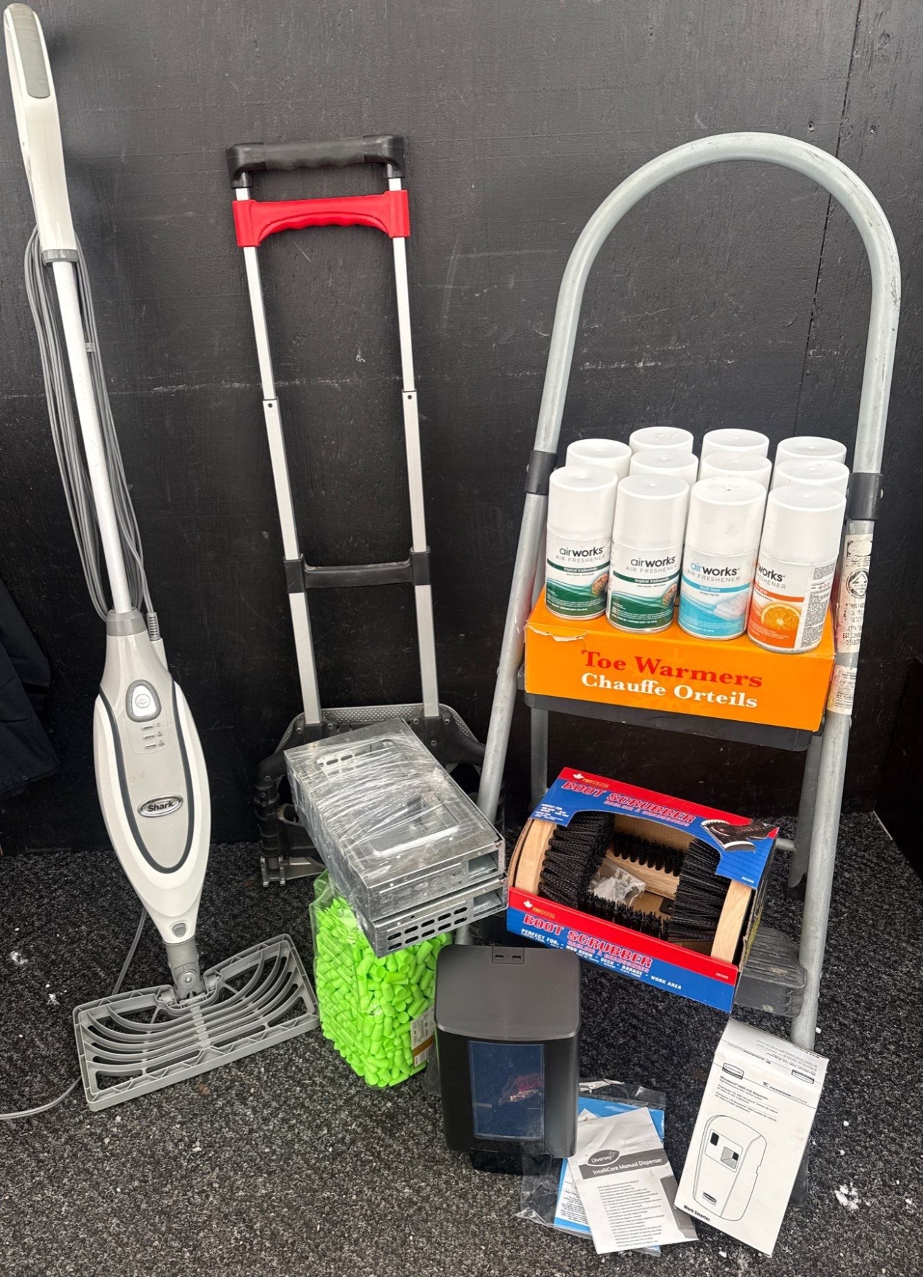 Lot 63 Commercial Supply Closet - Air Fresher Refills Outdoor Footwear Brush Folding Dolly Steam Mop & More