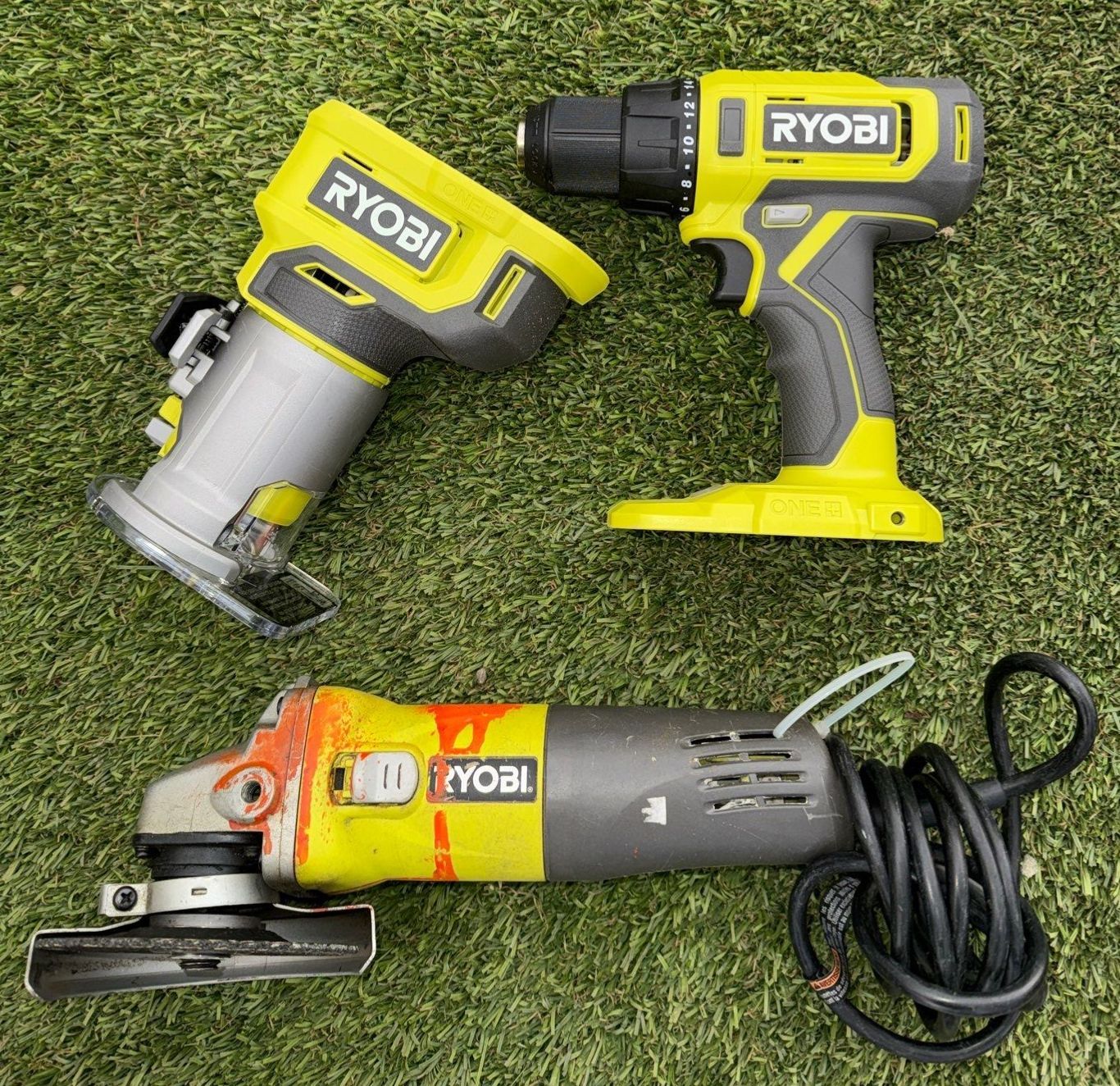 Lot 72 18V Cordless RYOBI Power Tools - Driver/Drill Angle Grinder & Compact Fixed Router