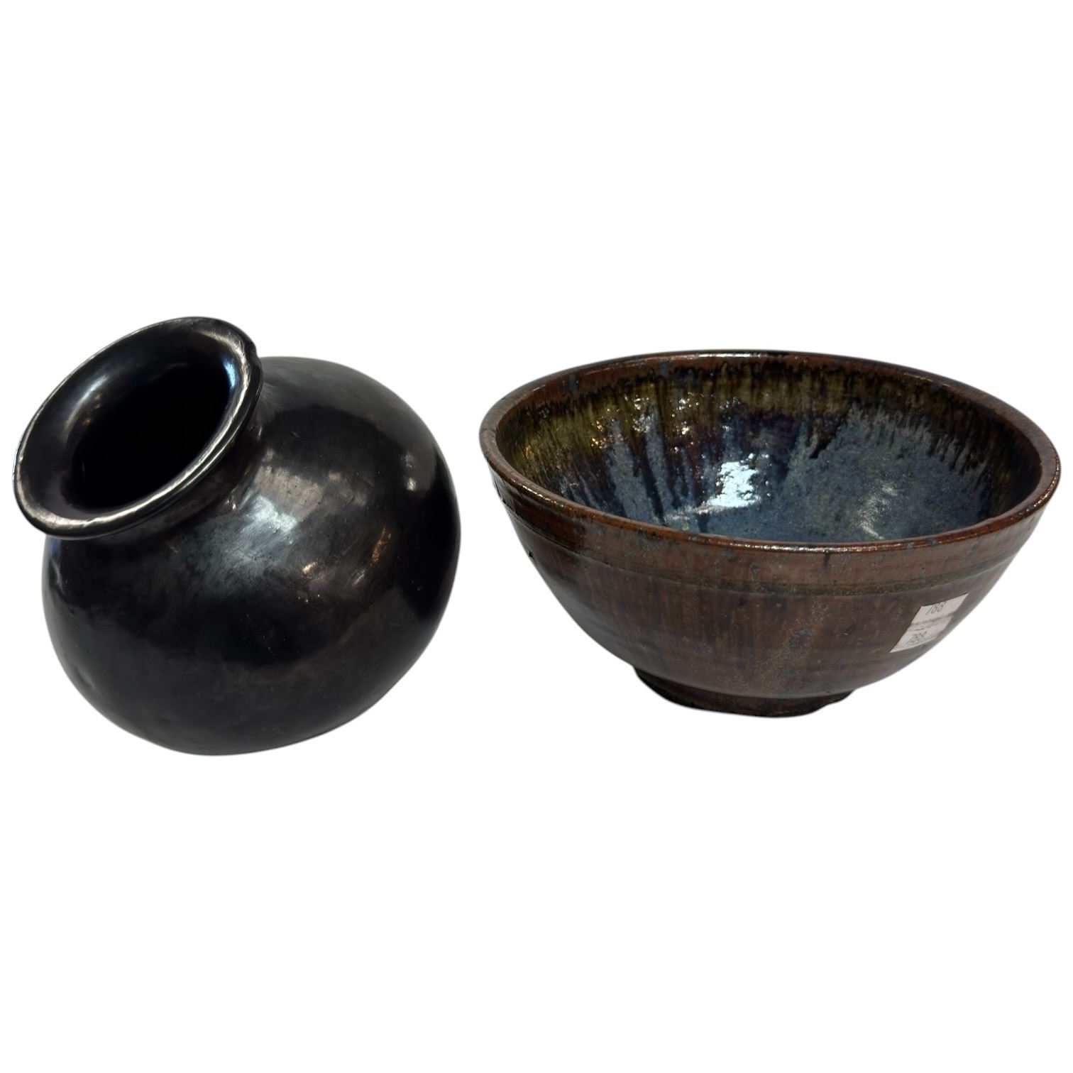 Lot 191 Glazed Art Pottery Bowl and Curved Base Vase (Bowl is signed Des and is 8" diameter and 4" deep)