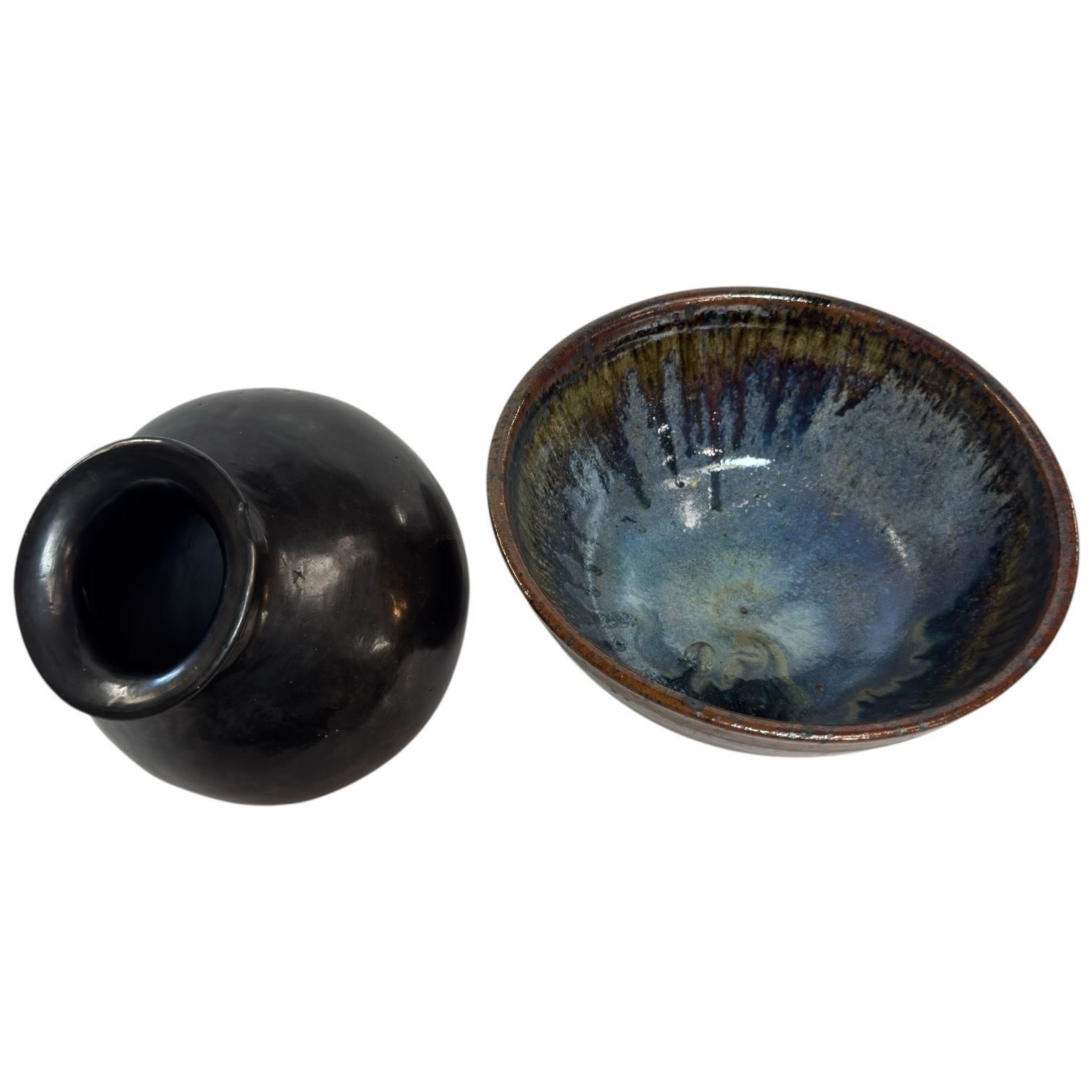 Glazed Art Pottery Bowl and Curved Base Vase (Bowl is signed Des and is 8" diameter and 4" deep)