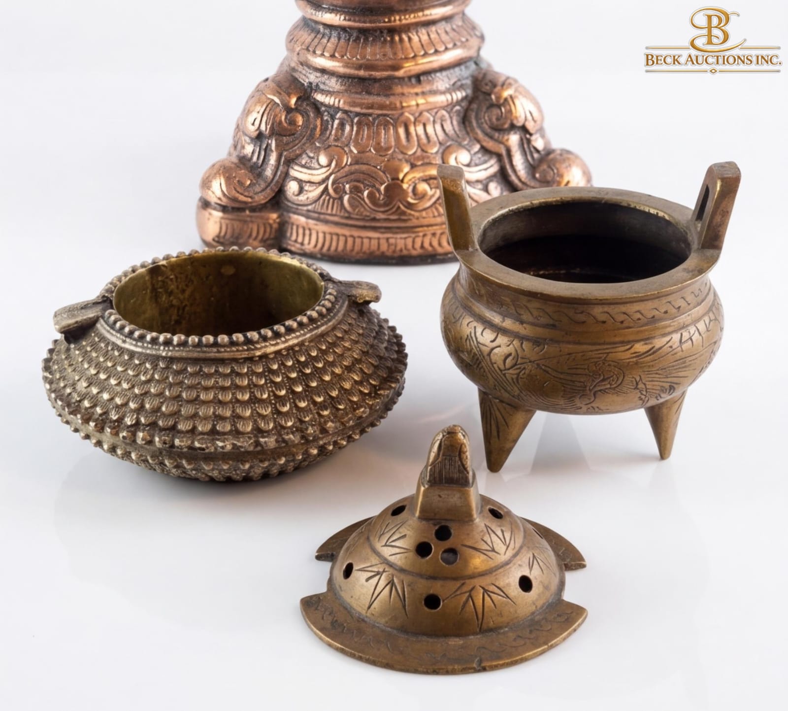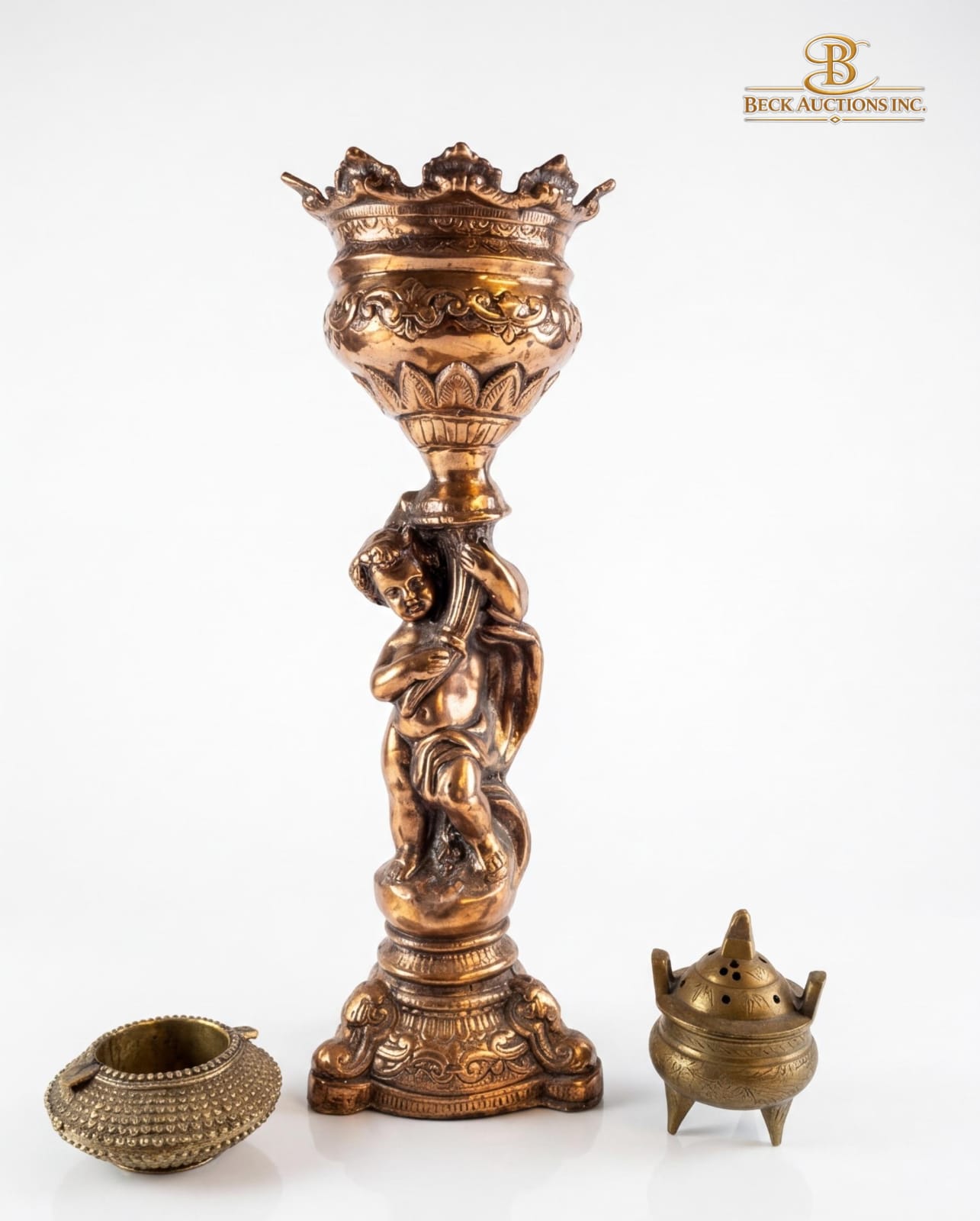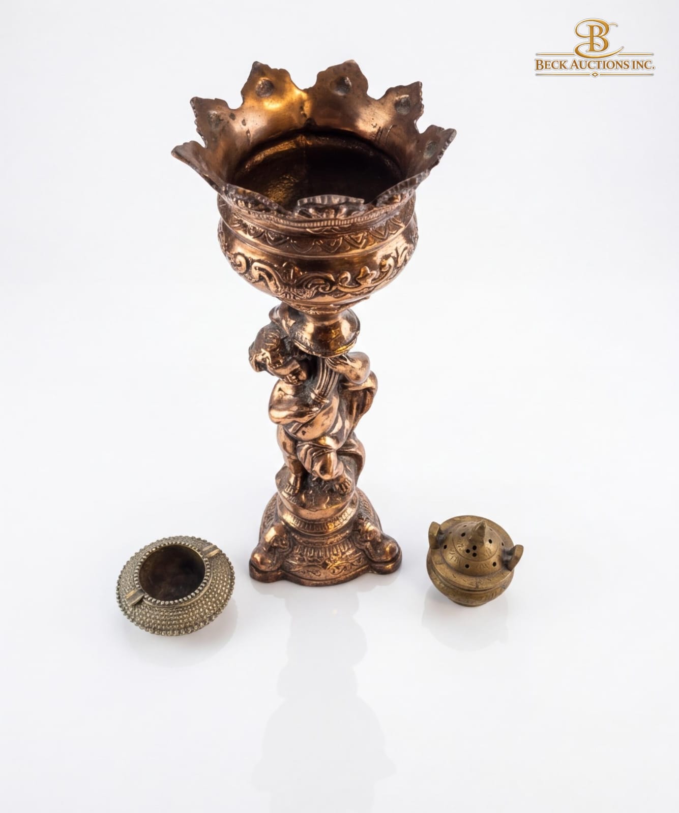 ANTIQUE ITALIAN UNIQUE BOROCCO COPPER PLANTER HOLDER STAND 19''INCHES HEIGHT, VINTAGE CHINESE BRASS TRIPOD INCENSE BURNER , VINTAGE BEAUTIFUL DESIGNED HAND ENGRAVED BRASS CIGAR ASH TRAY.