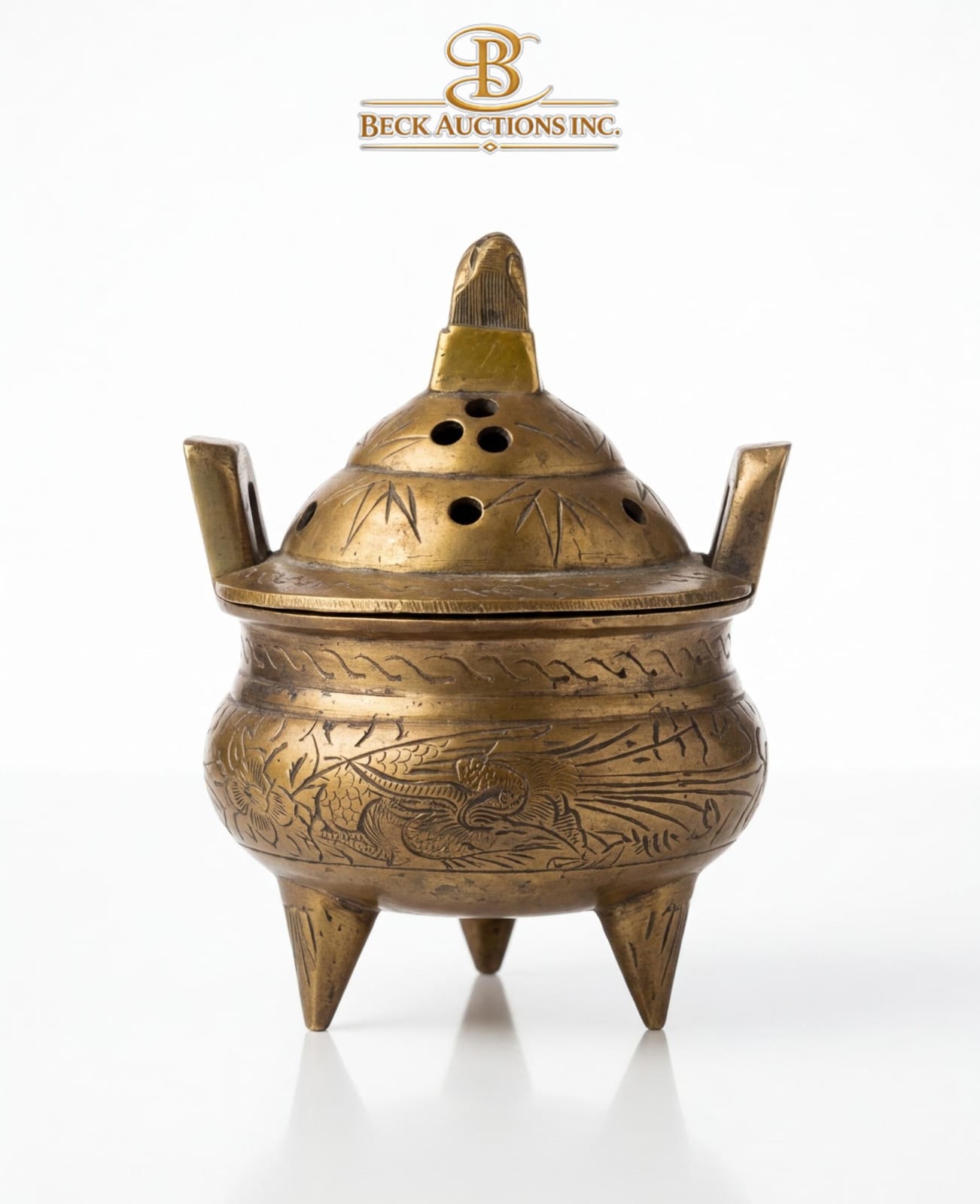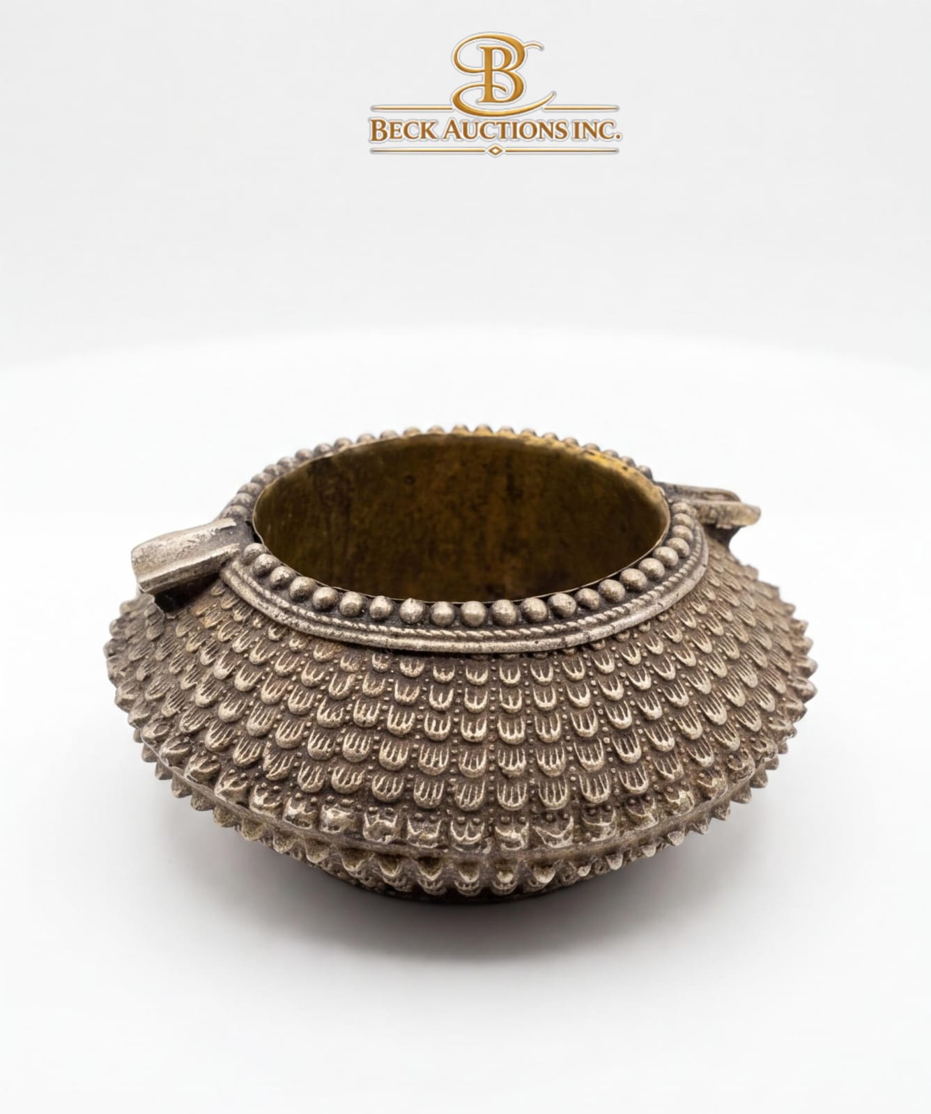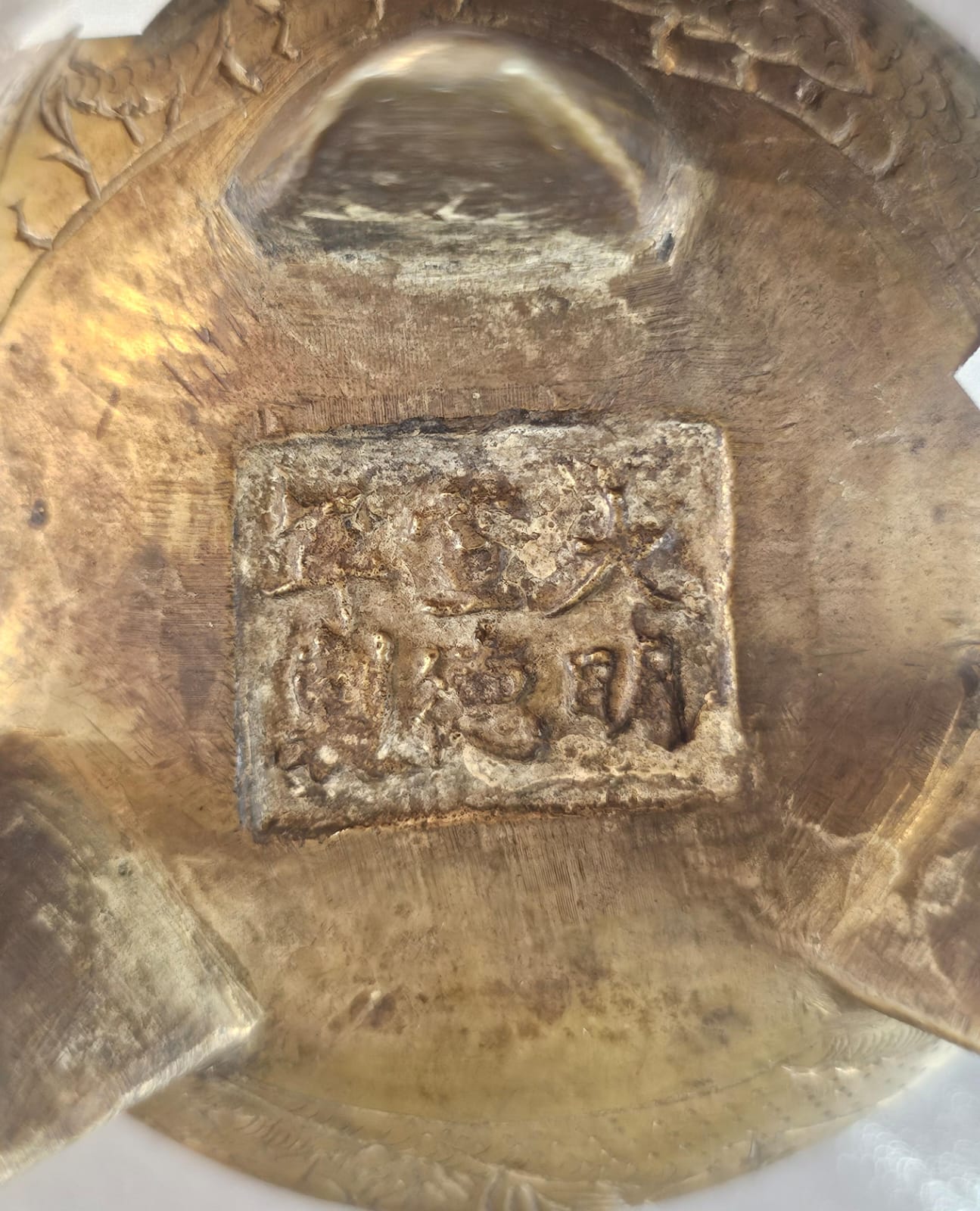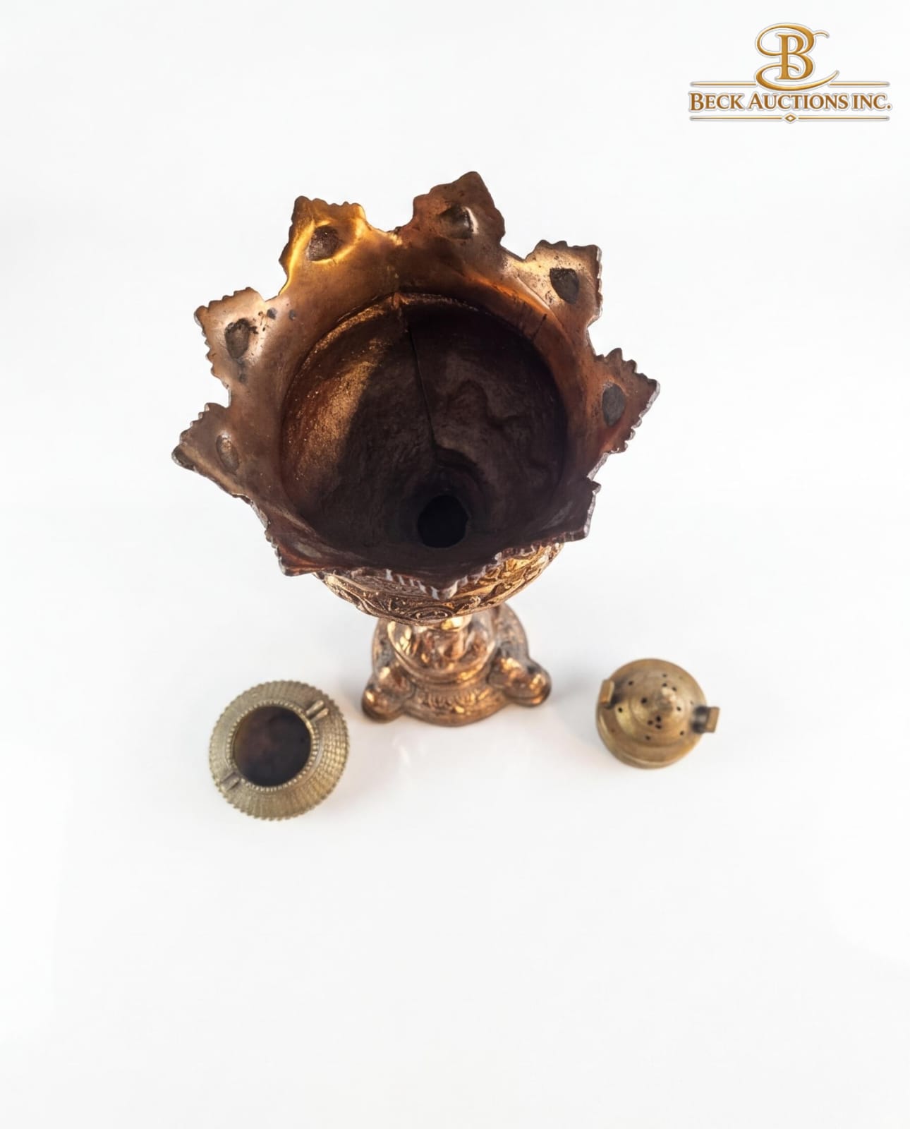 ANTIQUE ITALIAN UNIQUE BOROCCO COPPER PLANTER HOLDER STAND 19''INCHES HEIGHT, VINTAGE CHINESE BRASS TRIPOD INCENSE BURNER , VINTAGE BEAUTIFUL DESIGNED HAND ENGRAVED BRASS CIGAR ASH TRAY.