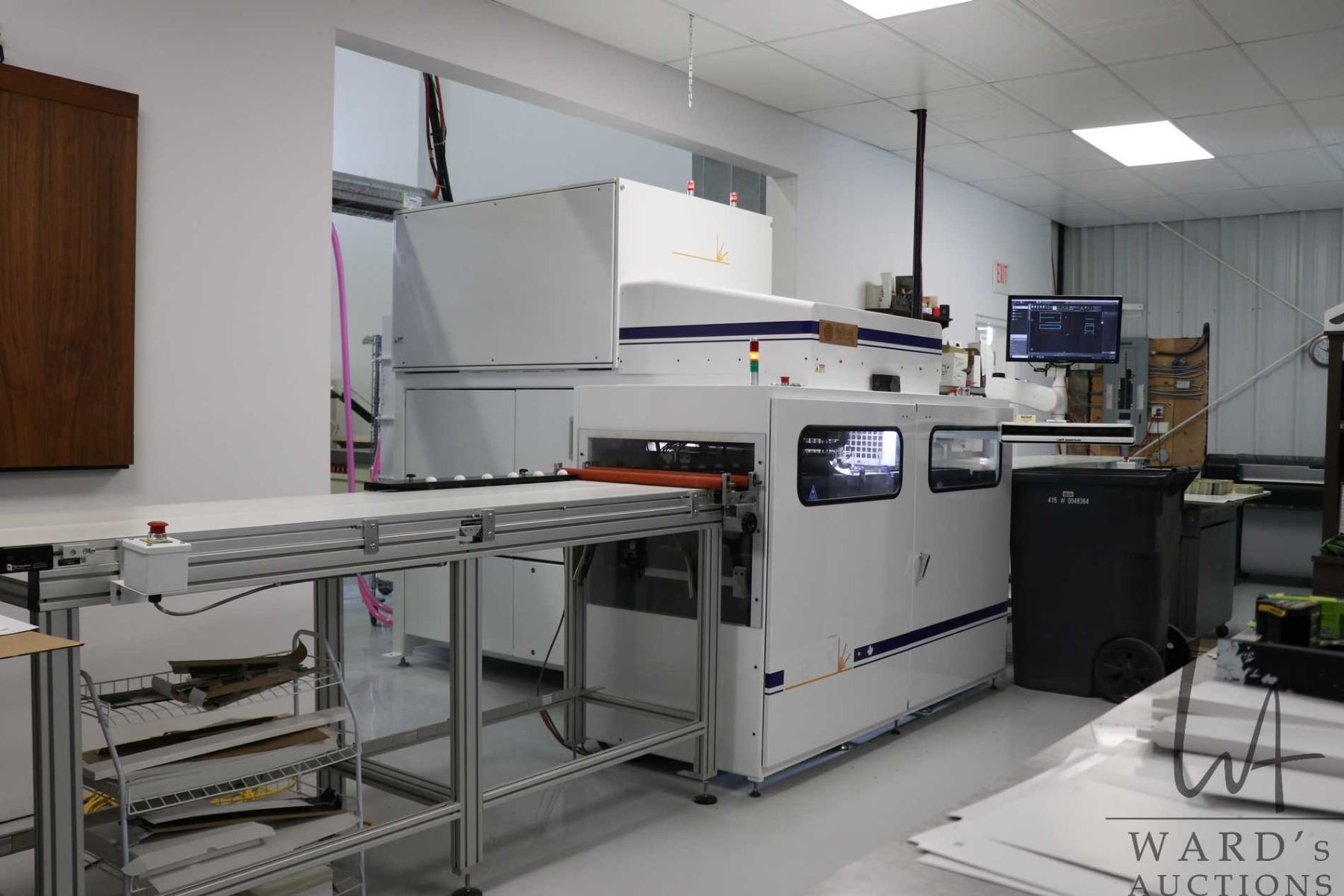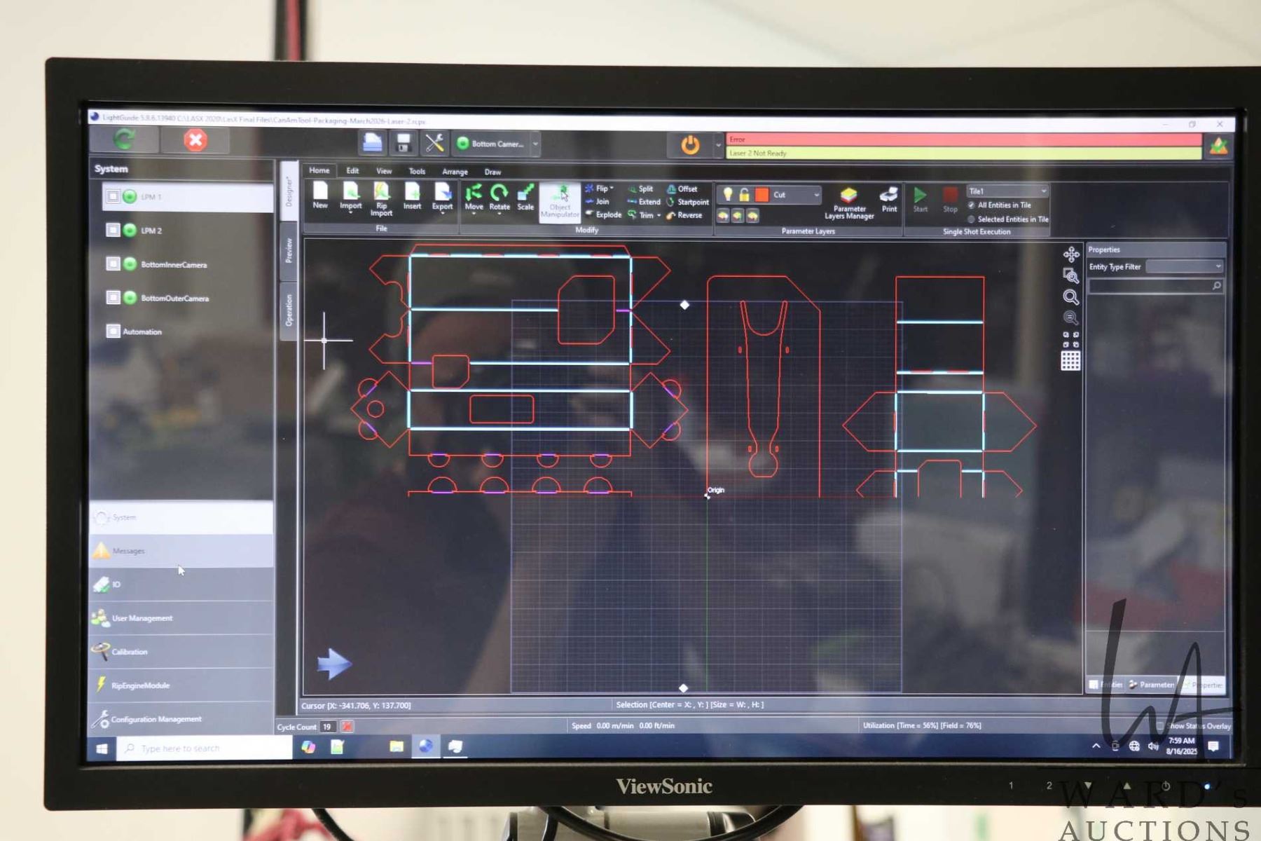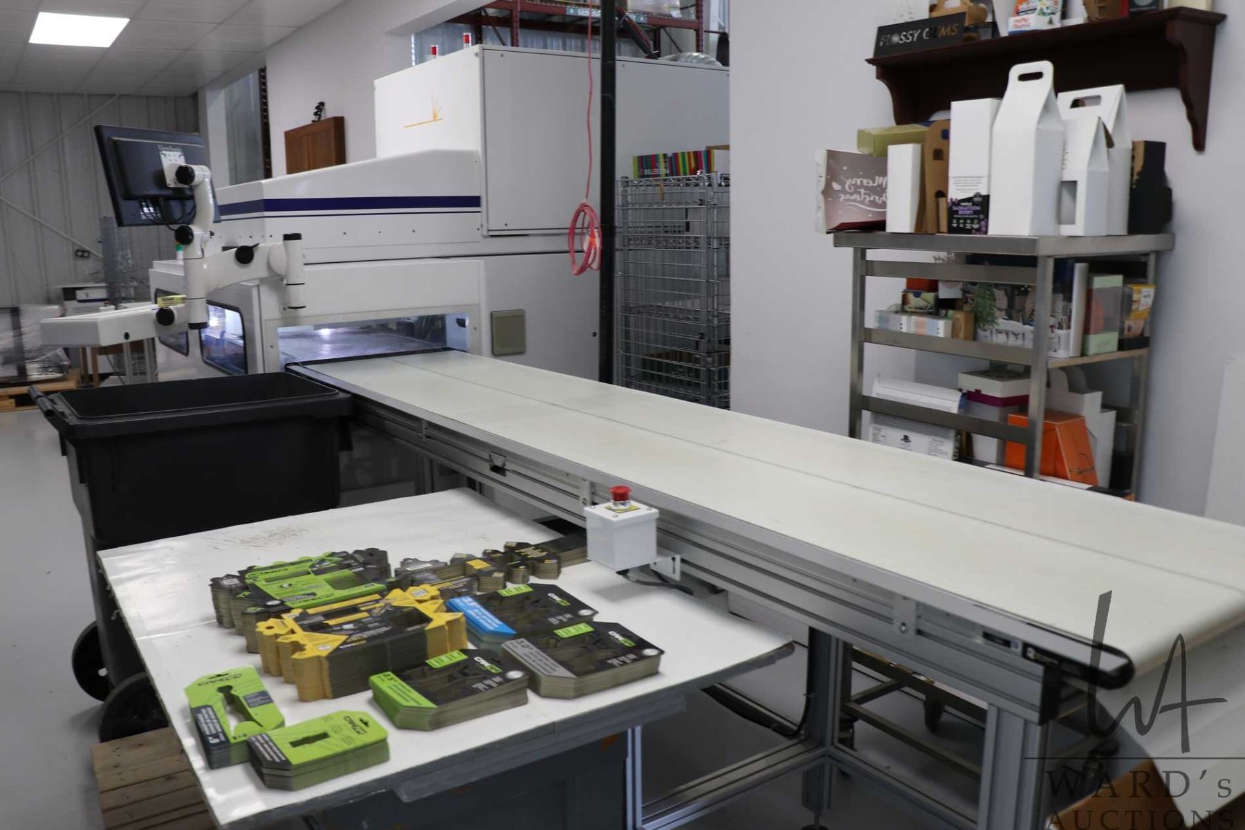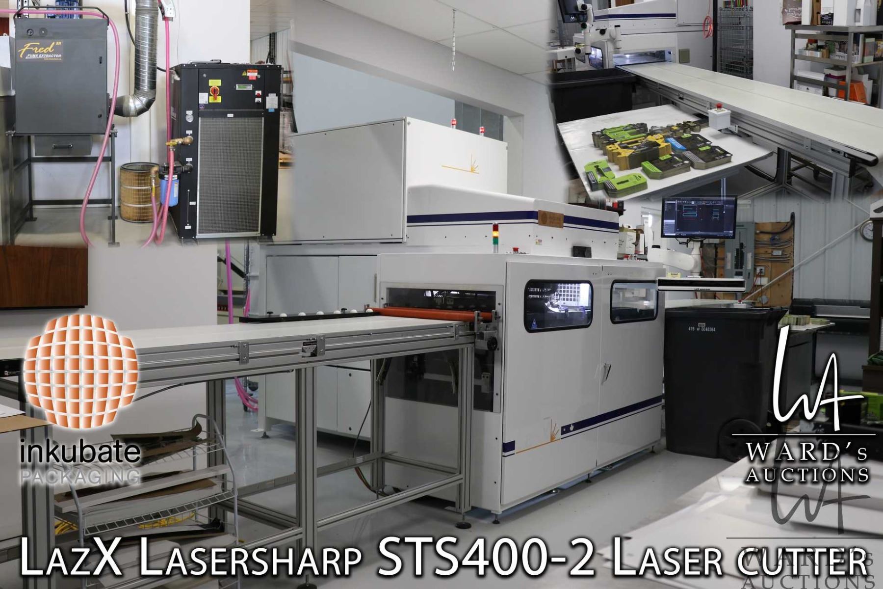 LASX 600 watt CO2 laser Lasersharp STS400-2 , SN 201709306. Fitted with two Rofin SCX 600 watt lasers, two HurryScan with VarioScan 40 dynamic focus devices, belt driven feed system with dual camera registration, Fred SR Fume Extractor and Koolant Koolers cooler. This laser can cut high end custom designed packaging and other card stock items with extreme accuracy and speed. The owner of Inkubate Packaging is open to being hired by the successful buyer to train on the operation and maintenance of this laser prior to removal. LasX has confirmed that they can be contracted to offer advice regarding preparation for moving and technical help after setup for things like alignment and calibration etc. Physical removal of the machine must be done by a licensed, experienced and insured mover like Wingenback (wingenback.com) See video on website shot on March 30, 2026. -- This setup can be seen in operation on preview day and the owner is available for hire to train after the auction, prior to removal.