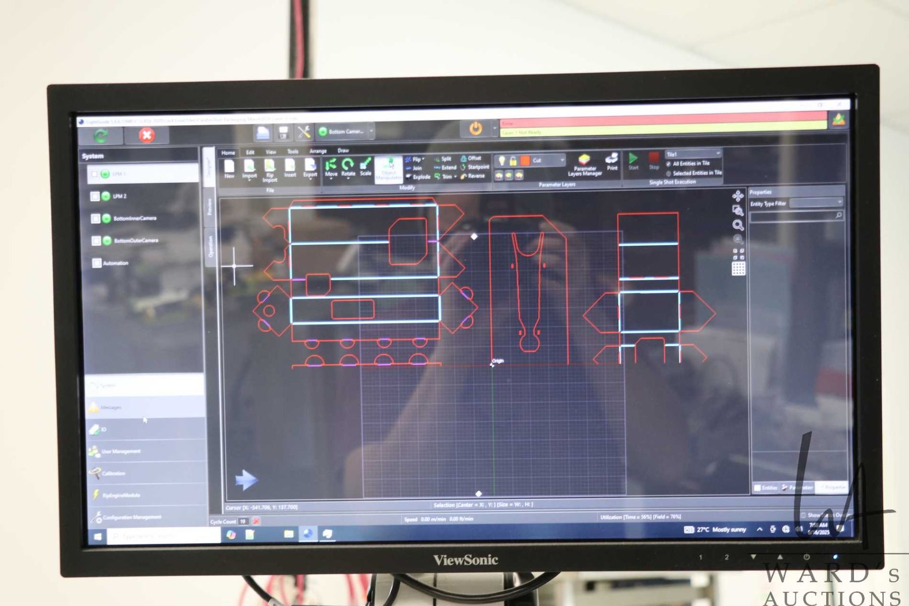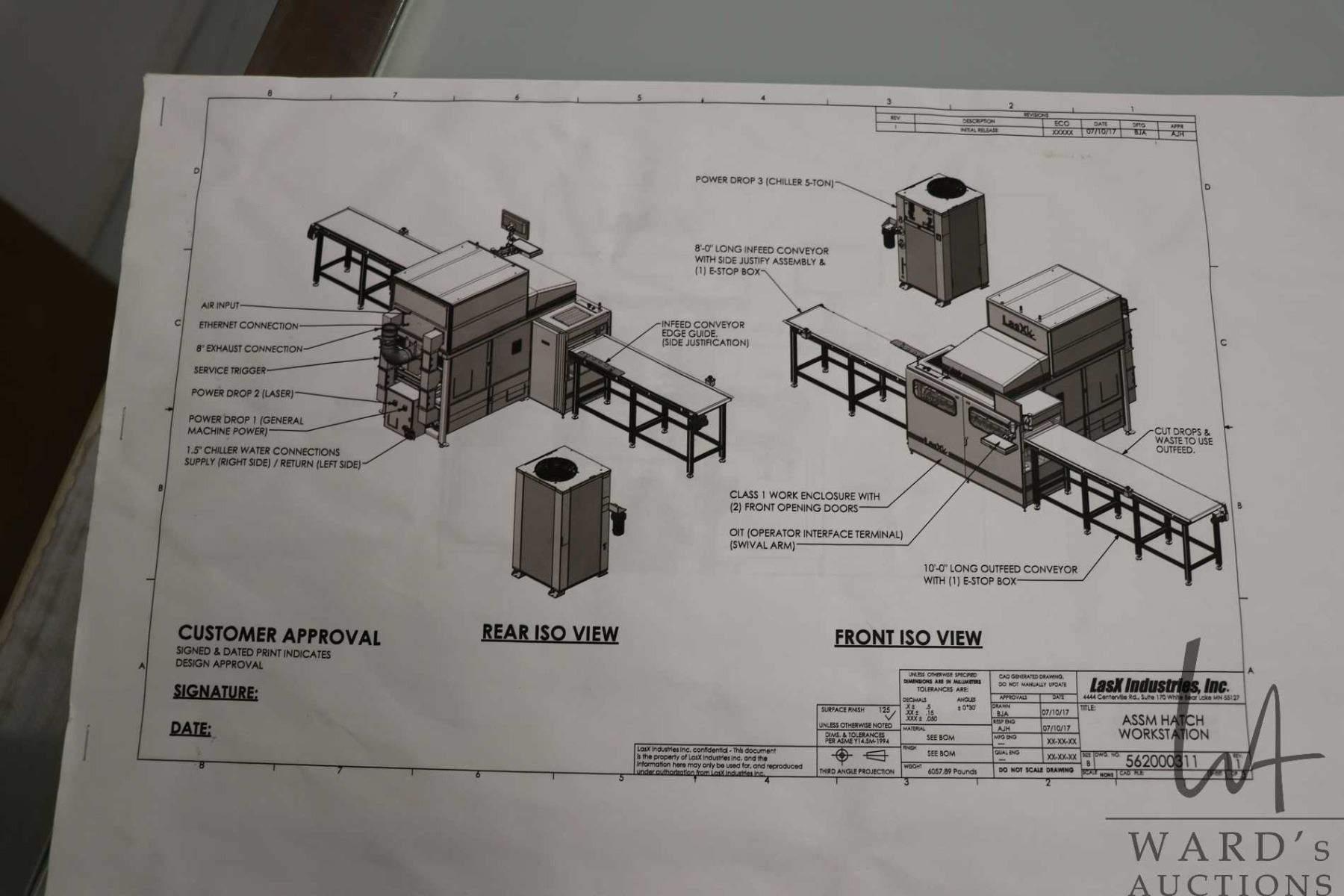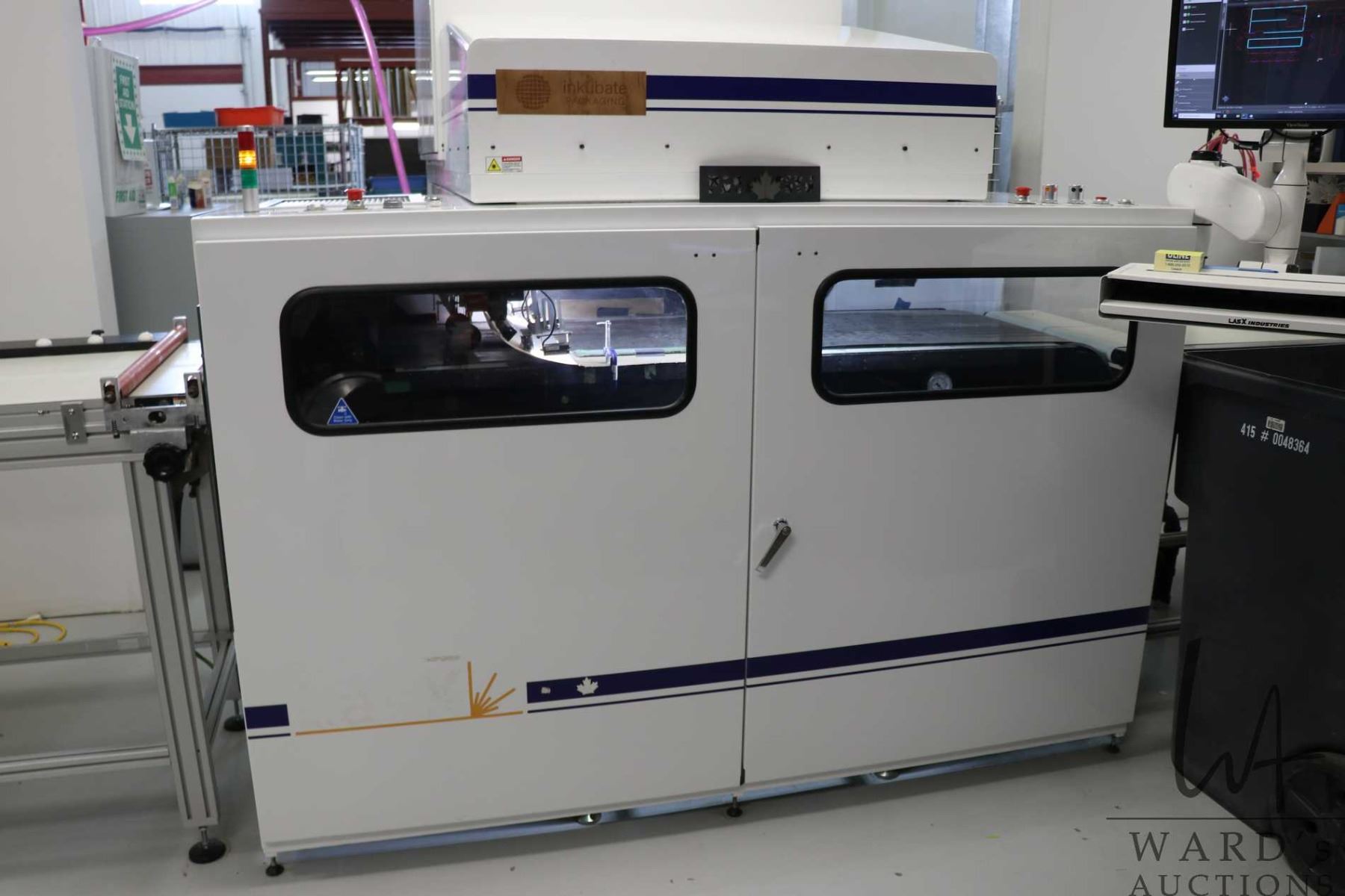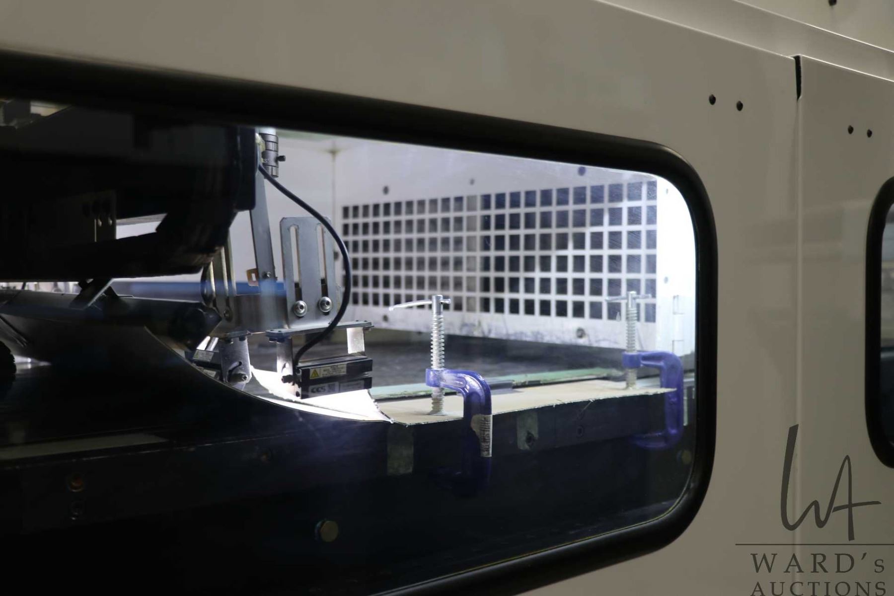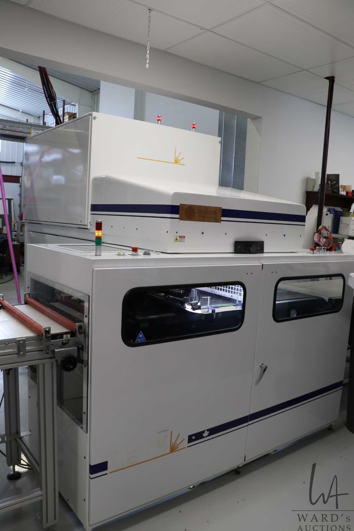 LASX 600 watt CO2 laser Lasersharp STS400-2 , SN 201709306. Fitted with two Rofin SCX 600 watt lasers, two HurryScan with VarioScan 40 dynamic focus devices, belt driven feed system with dual camera registration, Fred SR Fume Extractor and Koolant Koolers cooler. This laser can cut high end custom designed packaging and other card stock items with extreme accuracy and speed. The owner of Inkubate Packaging is open to being hired by the successful buyer to train on the operation and maintenance of this laser prior to removal. LasX has confirmed that they can be contracted to offer advice regarding preparation for moving and technical help after setup for things like alignment and calibration etc. Physical removal of the machine must be done by a licensed, experienced and insured mover like Wingenback (wingenback.com) See video on website shot on March 30, 2026. -- This setup can be seen in operation on preview day and the owner is available for hire to train after the auction, prior to removal.